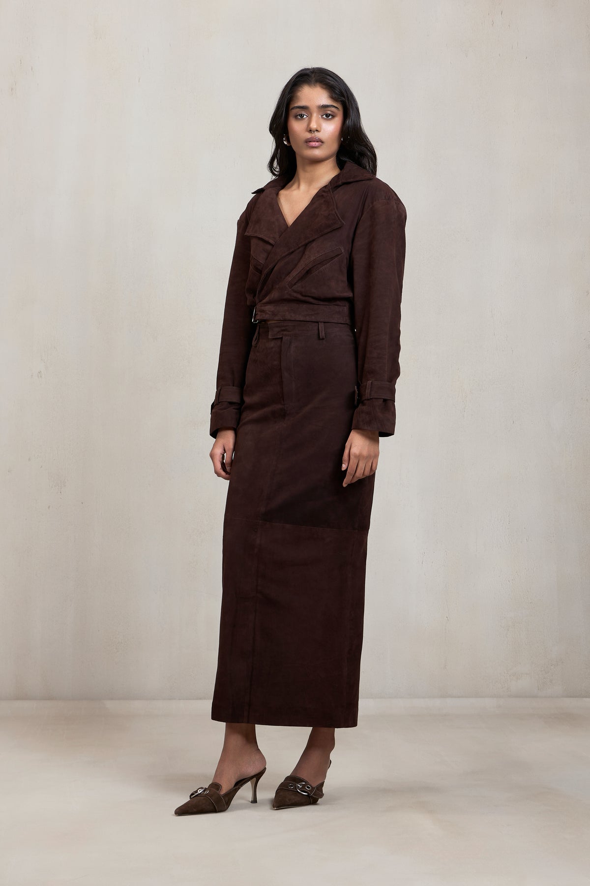 Sophisticated and structured, this co-ord set is crafted from rich chocolate-hued suede that feels as luxurious as it looks. The tailored jacket features an exaggerated lapel collar, belted waist, and utility-inspired detailing on the sleeves for a sharp, confident edge. Paired with a sleek, high-waisted pencil skirt that falls gracefully to the ankle, the set creates a streamlined silhouette that balances strength with elegance. Perfect for evenings out or power-dressing moments, this suede ensemble is a modern wardrobe staple designed to make an impression.