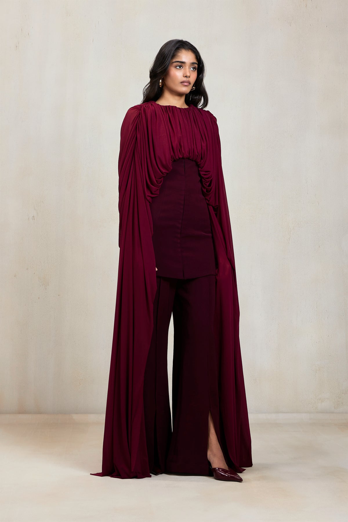 Luxurious and commanding, this ensemble blends sculptural draping with a powerful tailored base. The gathered tunic features a high neckline and extended cape-like panels, layered over wide-leg trousers with a subtle slit. Designed for the modern woman who values strength and elegance, this look is perfect for elevated evening occasions.