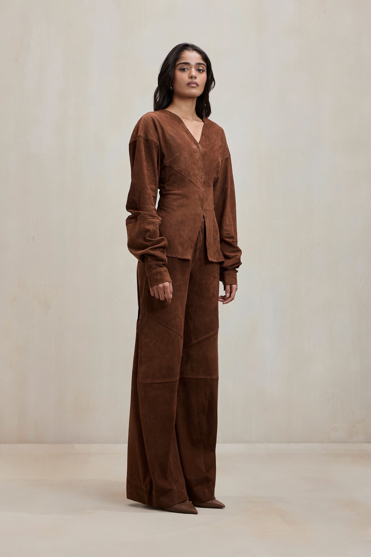 Effortless sophistication meets modern edge in this sculptural co-ord set. The luxuriously soft faux suede jacket features clean tailoring and a structured silhouette that embodies relaxed confidence. Paired with oversized, wide-leg pants that move with fluid ease, the set strikes the perfect balance between polish and nonchalance. The high-rise fit elongates the frame, while the minimal design makes it endlessly versatile. From day to night, this look defines understated power dressing.