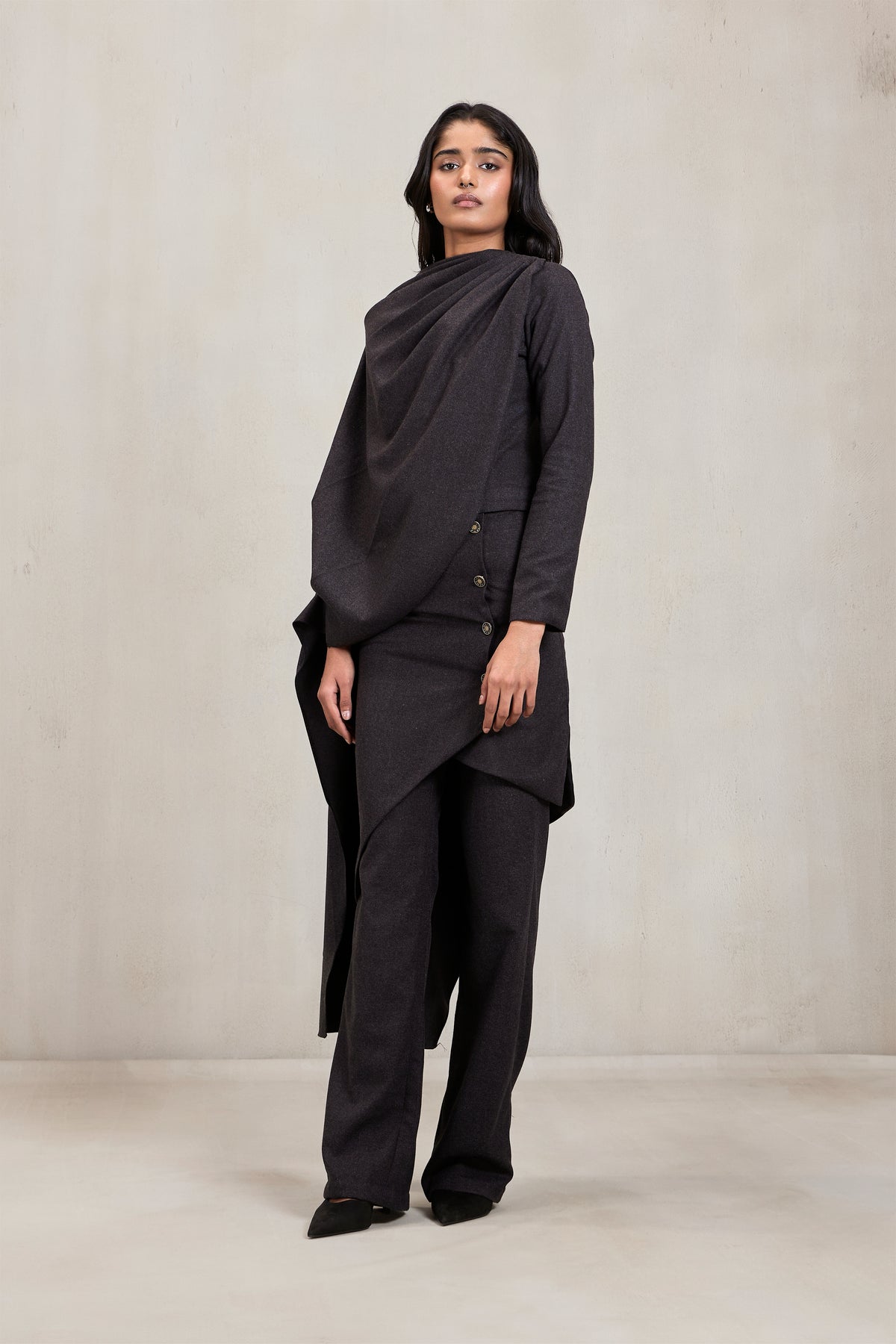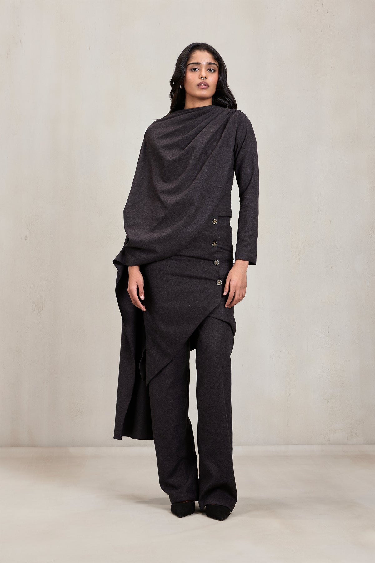 Tailoring meets drapery in this charcoal co-ord set, cut from a structured wool blend. The asymmetrical top features sculpted draping that extends from the neckline across the bodice, creating architectural folds. Paired with high-waisted trousers, the look is anchored by a draped overskirt panel fastened with a row of antique-finish buttons. This set exudes power dressing with an avant-garde twist