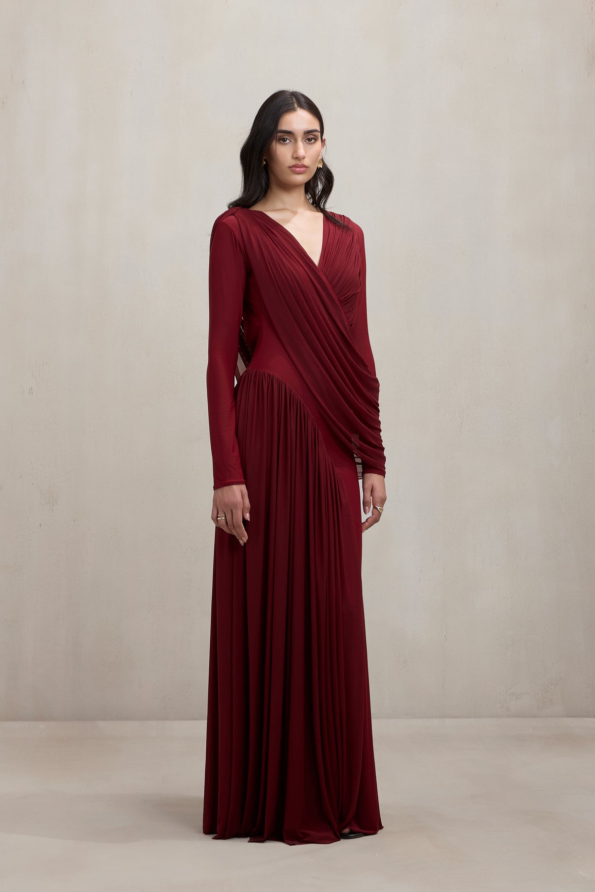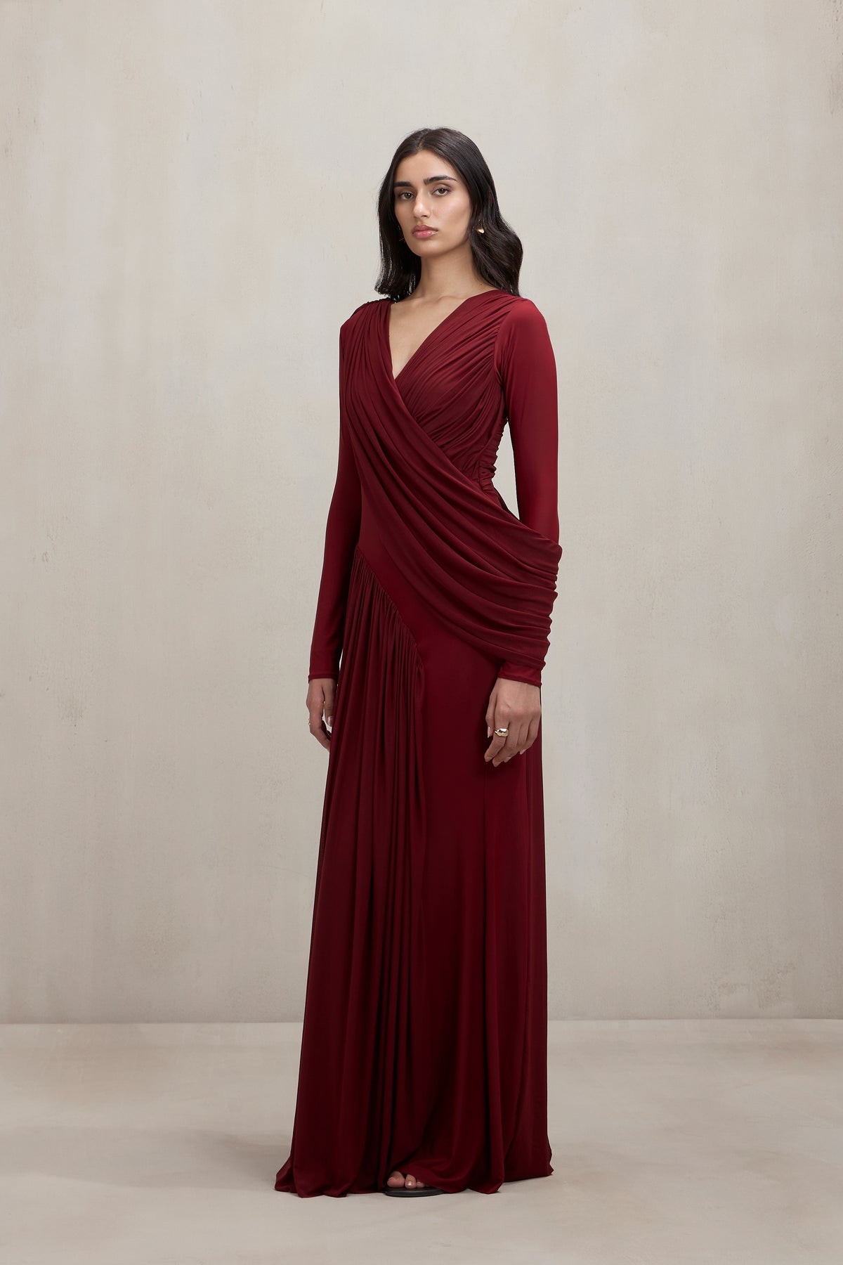 Elegant and architectural, this long-sleeve gown in rich burgundy jersey features a deep V-neckline balanced with dramatic draping across the torso like a detachable drape. Precision pleating and sculpted folds add movement and texture, while the fitted sleeves and floor-grazing length ensure a refined finish. A perfect balance of modern sensuality and sophistication.