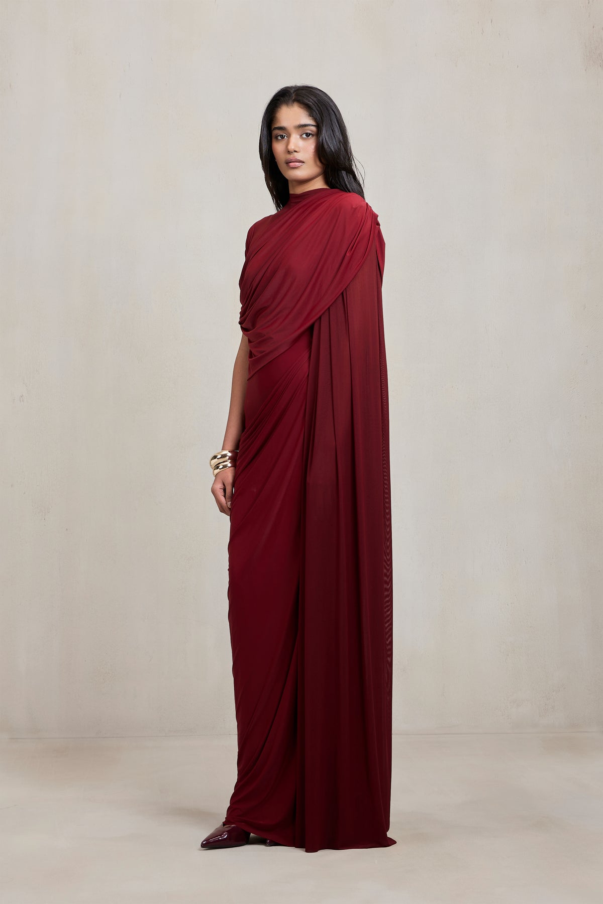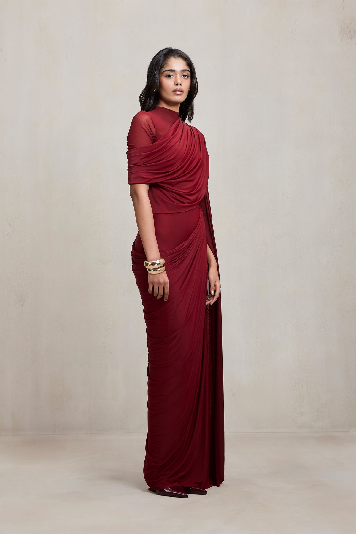 A statement of modern elegance, this gown is crafted in fluid stretch fabric with soft draping that contours the body. The right shoulder features a sheer illusion detail, adding lightness and contrast to the sculpted folds that flow seamlessly into the floor-length silhouette. Sophisticated and bold, it’s designed for effortless evening glamour.