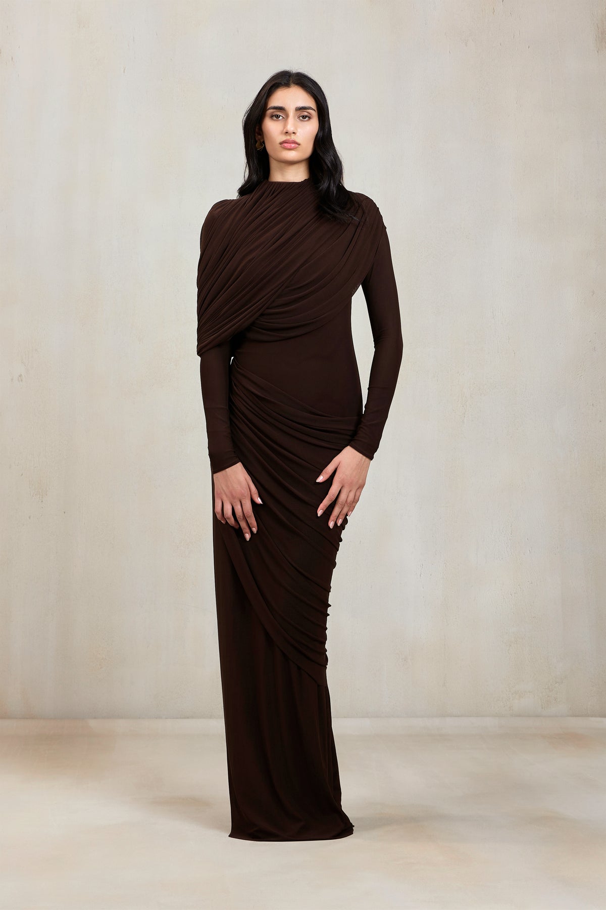 A sculptural silhouette in expresso brown, this high-neck gown features full sleeves and an artfully draped bottom that cascades asymmetrically from one side. At the top, a pleated drape flows from the neckline, elegantly twisting around the arm. A perfect blend of structure and fluidity, this gown redefines modern elegance with a touch of drama.