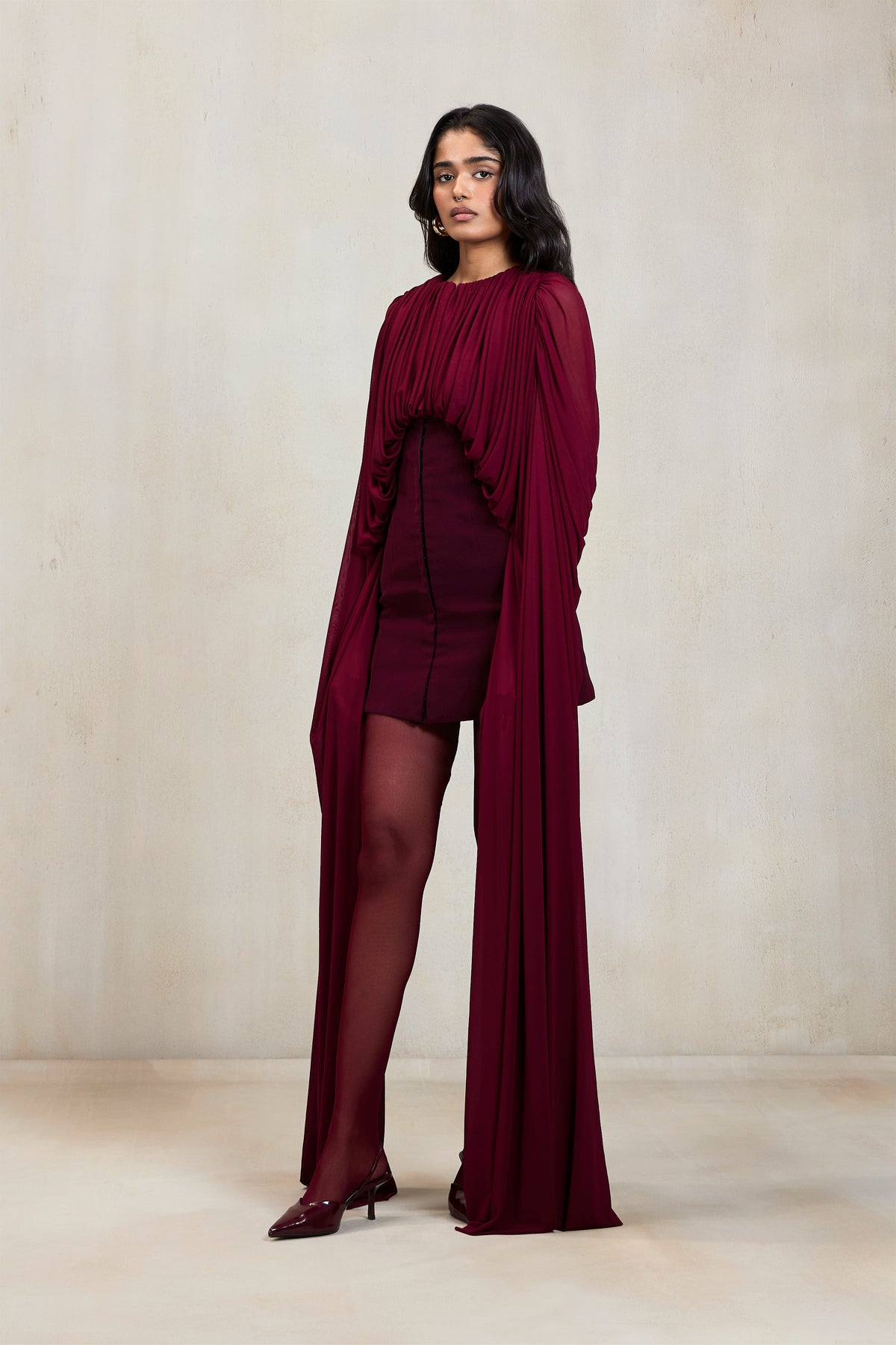 Luxurious and commanding, this ensemble blends sculptural draping with a powerful tailored base. The gathered tunic features a high neckline and extended cape-like panels, layered over wide-leg trousers with a subtle slit. Designed for the modern woman who values strength and elegance, this look is perfect for elevated evening occasions.