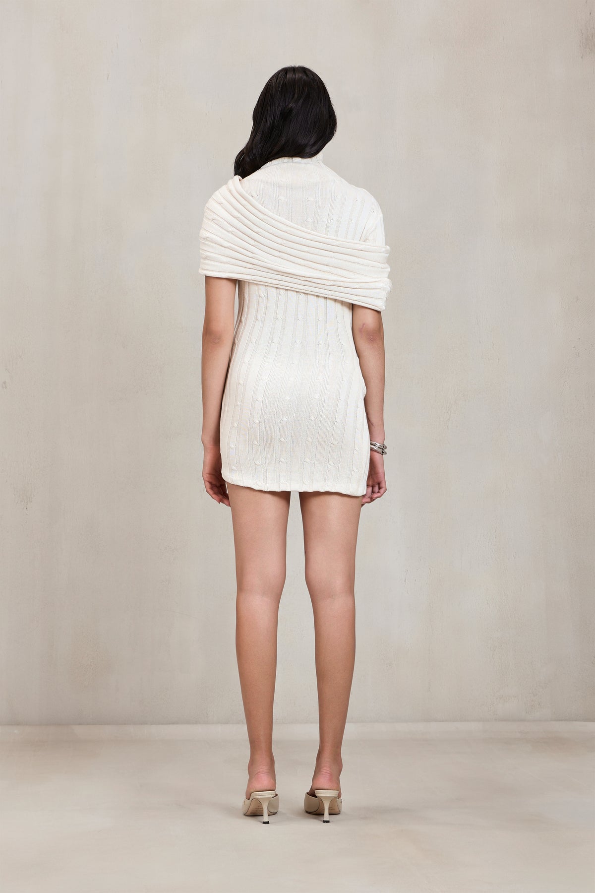 This short cable knit dress brings a modern twist to a classic knitwear silhouette. Designed with a high neckline and short sleeves, it offers a clean, structured base. A sculptural drape flows diagonally across the bust—from the left shoulder to the right arm—adding fluid movement and a statement finish. Equal parts cozy and refined, it’s the perfect piece for day-to-night styling.