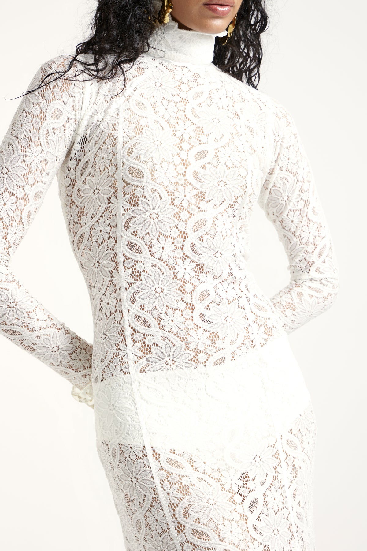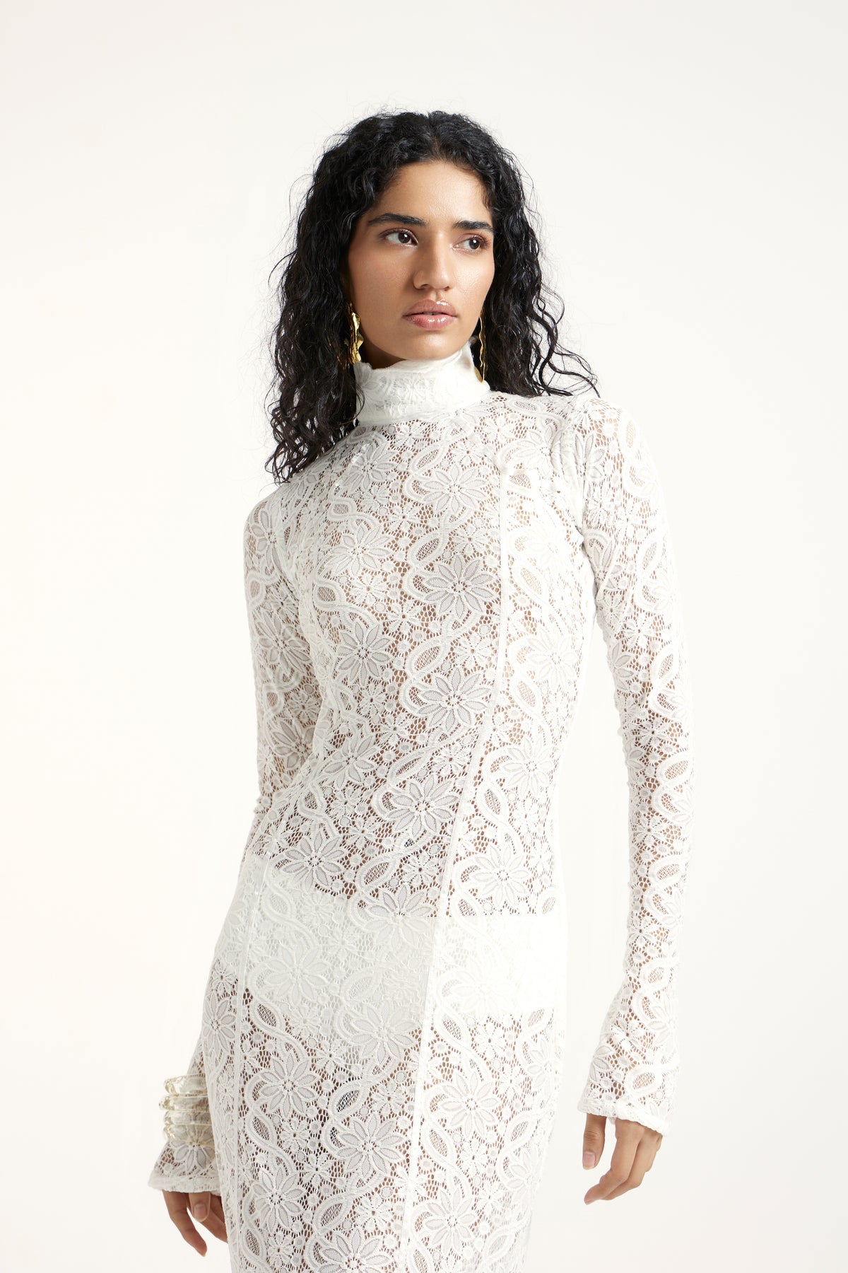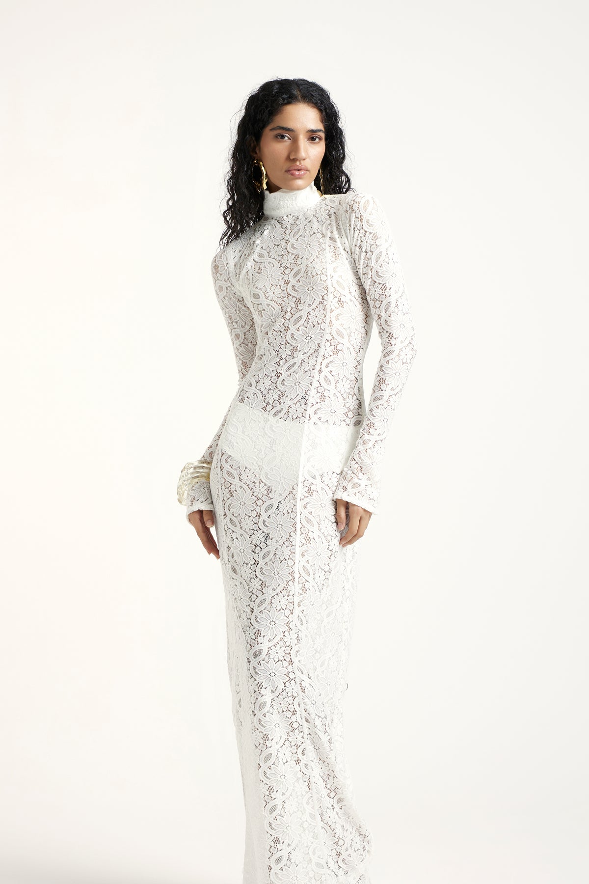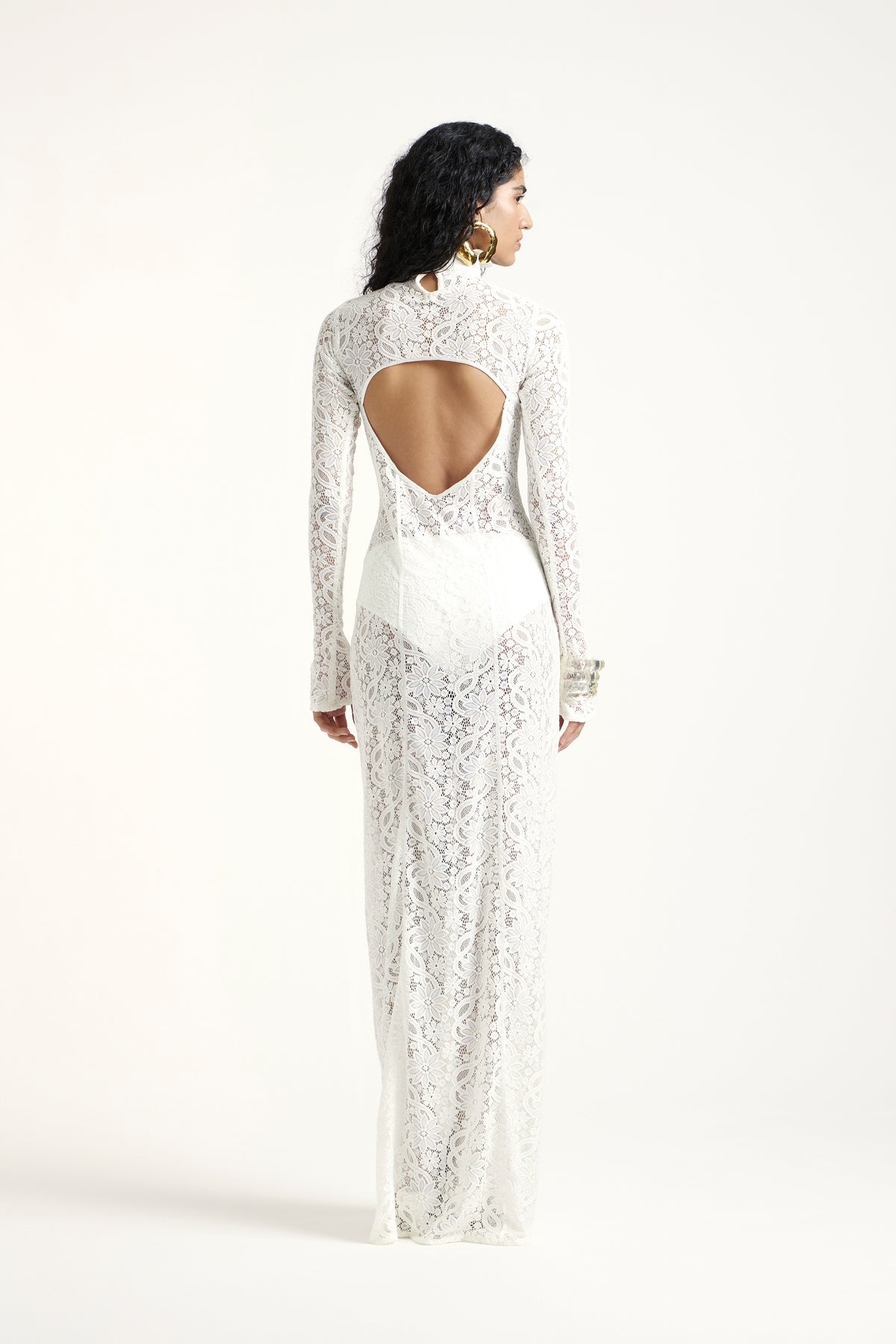 An off-white lace gown featuring a sleek high neckline, long fitted sleeves, and a sculpted silhouette. Its open back adds a modern, striking contrast to the delicate lace, while the matching inner layer ensures a seamless, elegant finish—perfect for elevated occasions and statement moments.