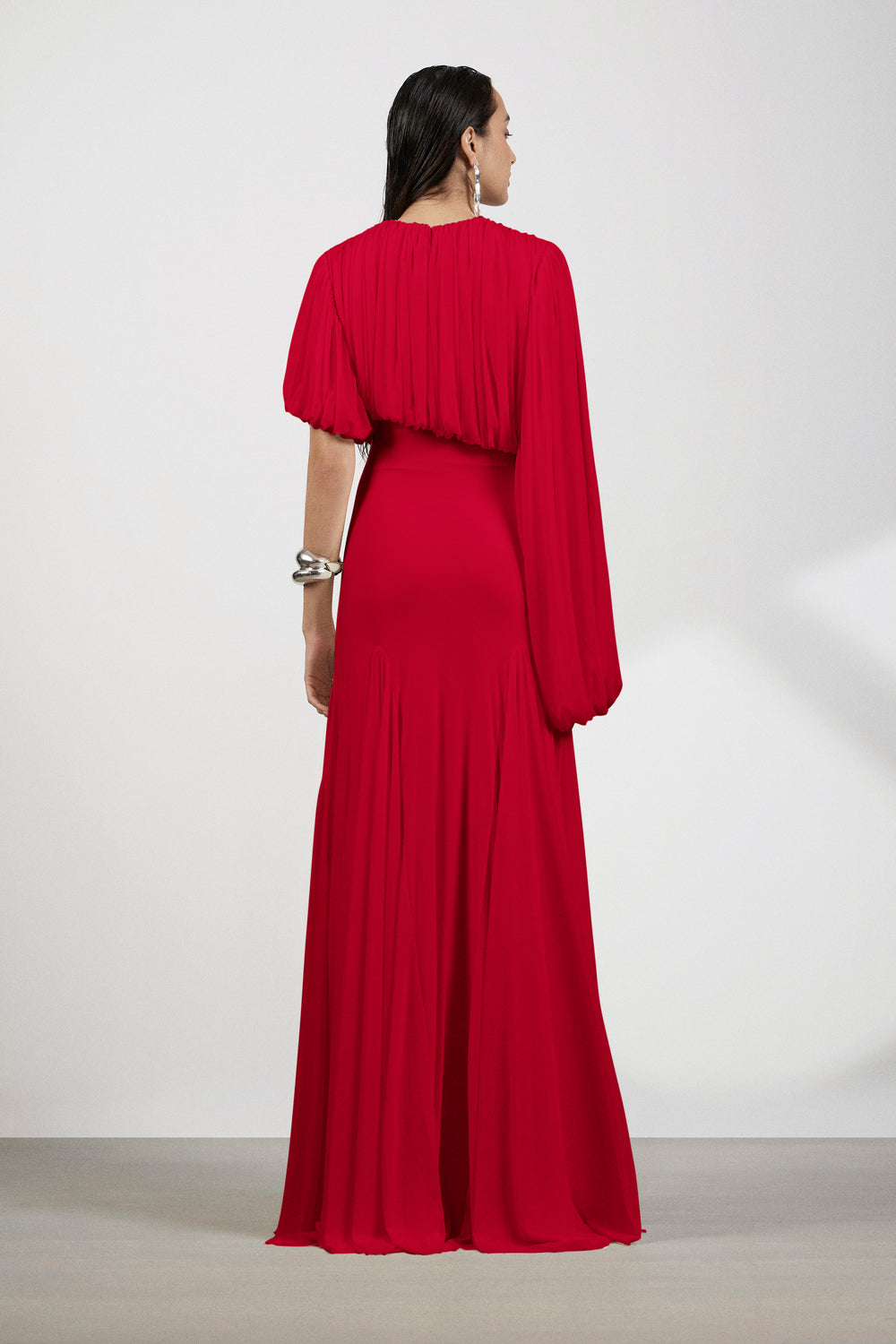 This dramatic gown features a bold, sculptural design with textured drape detailing on the bodice, creating an eye-catching focal point. The sleeves are designed in an asymmetrical balloon style—one long, the other shorter—adding an avant-garde twist. The bottom of the dress is enhanced with strategically placed panels on the thighs, adding volume and movement to the silhouette, while ensuring a dynamic flow as you move. This gown is an exquisite blend of modern structure and fluid elegance, perfect for making a statement at any special occasion.