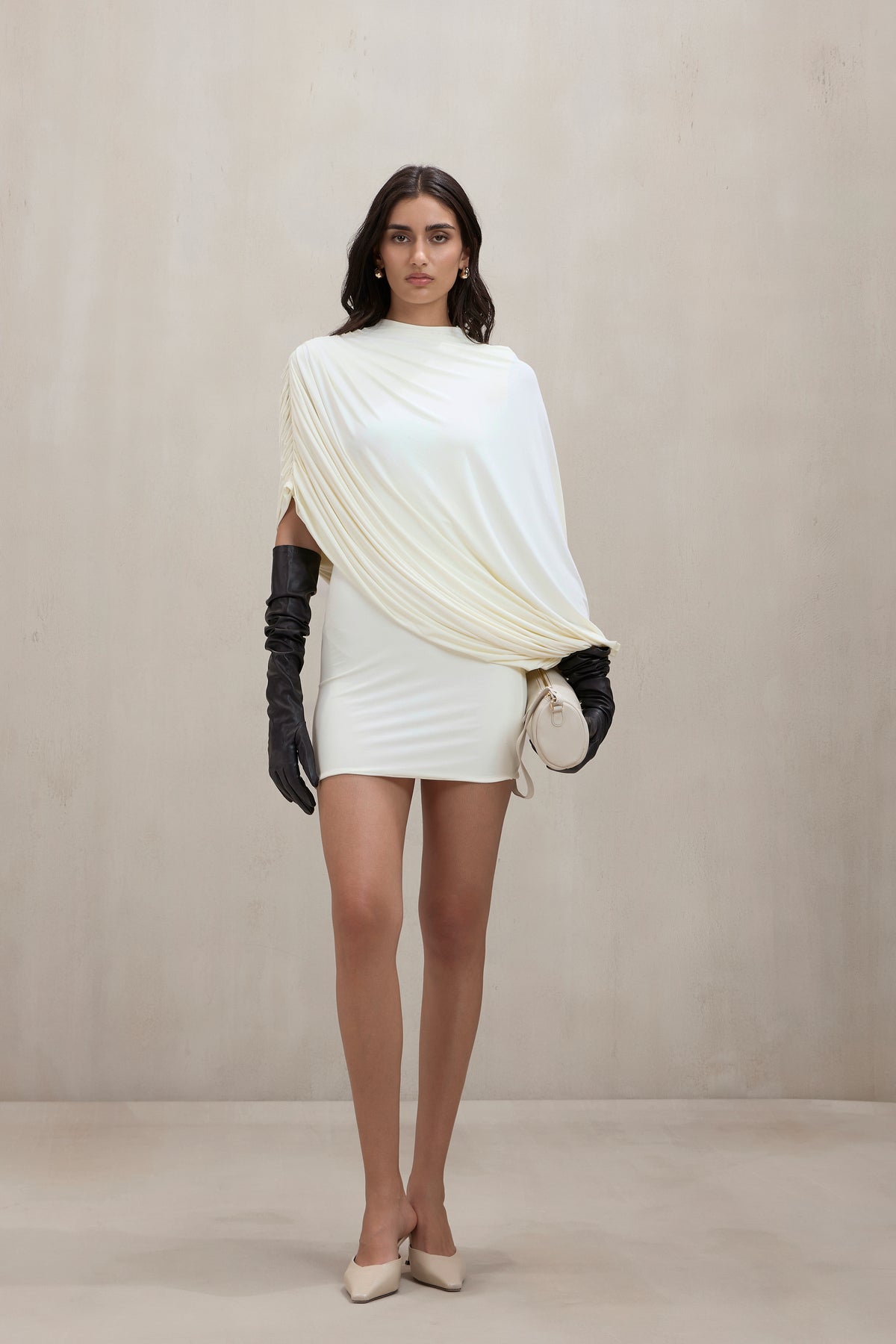 Minimalist with a couture edge, this ivory mini dress is designed with fluid draping across the bodice for effortless sophistication. Styled with long black gloves and a sleek ivory clutch, the look channels timeless elegance with a modern twist. A versatile piece that transitions seamlessly from refined dinners to statement-making events.