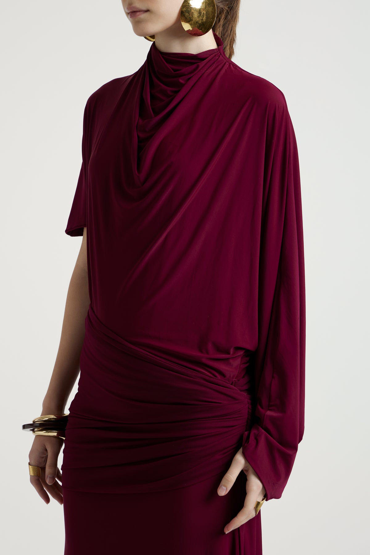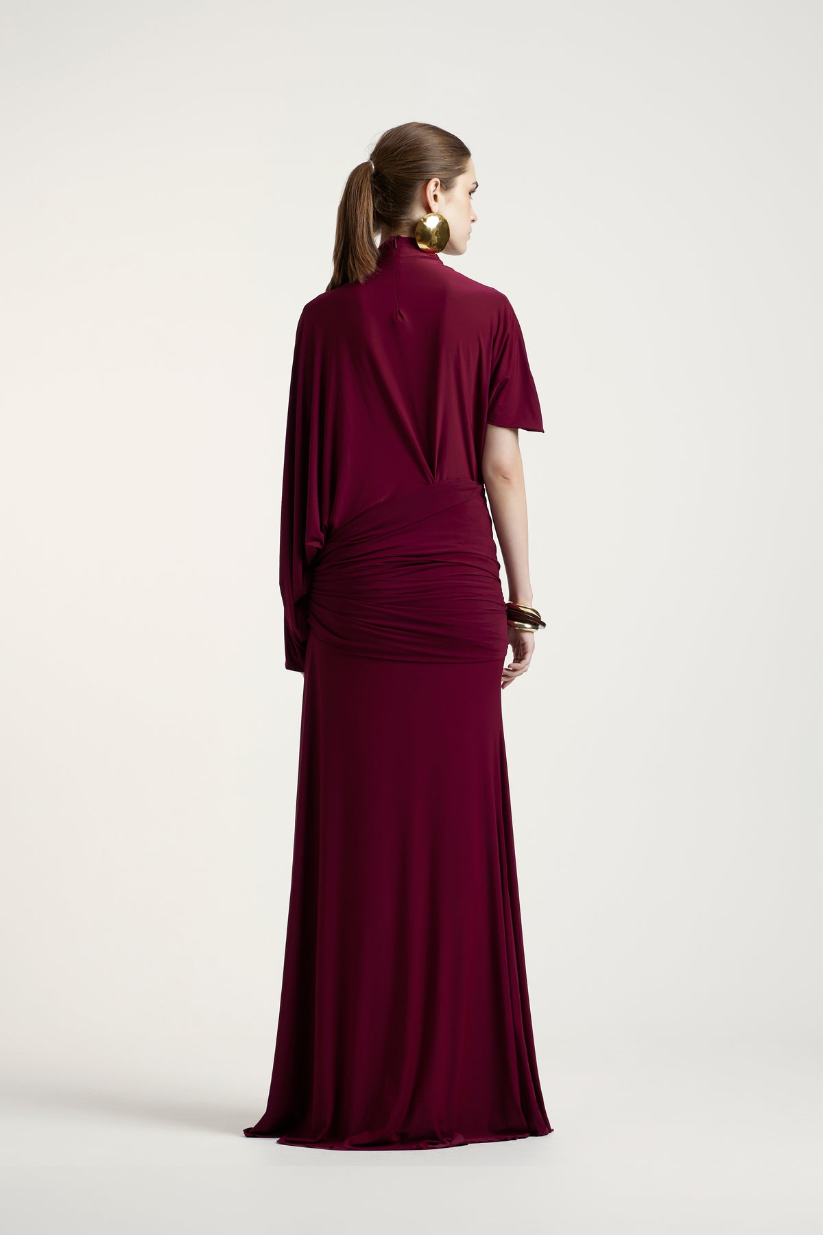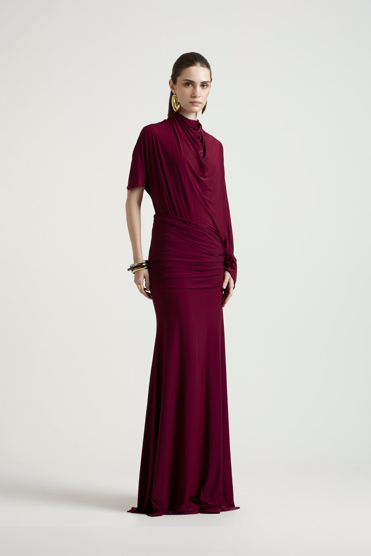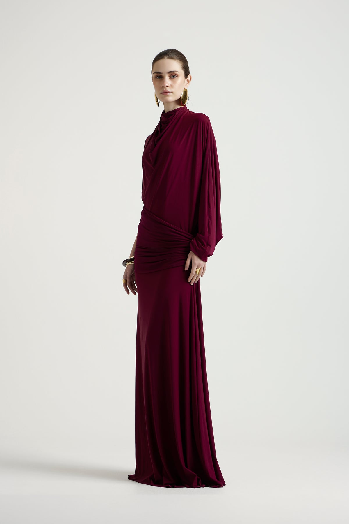 A deep aubergine dress crafted from net and malai, offering an elegant contrast of sheer texture and smooth drape. The silhouette feels refined and contemporary, while the rich hue gives it a luxurious depth. A beautiful option for evening events and understated sophistication.
