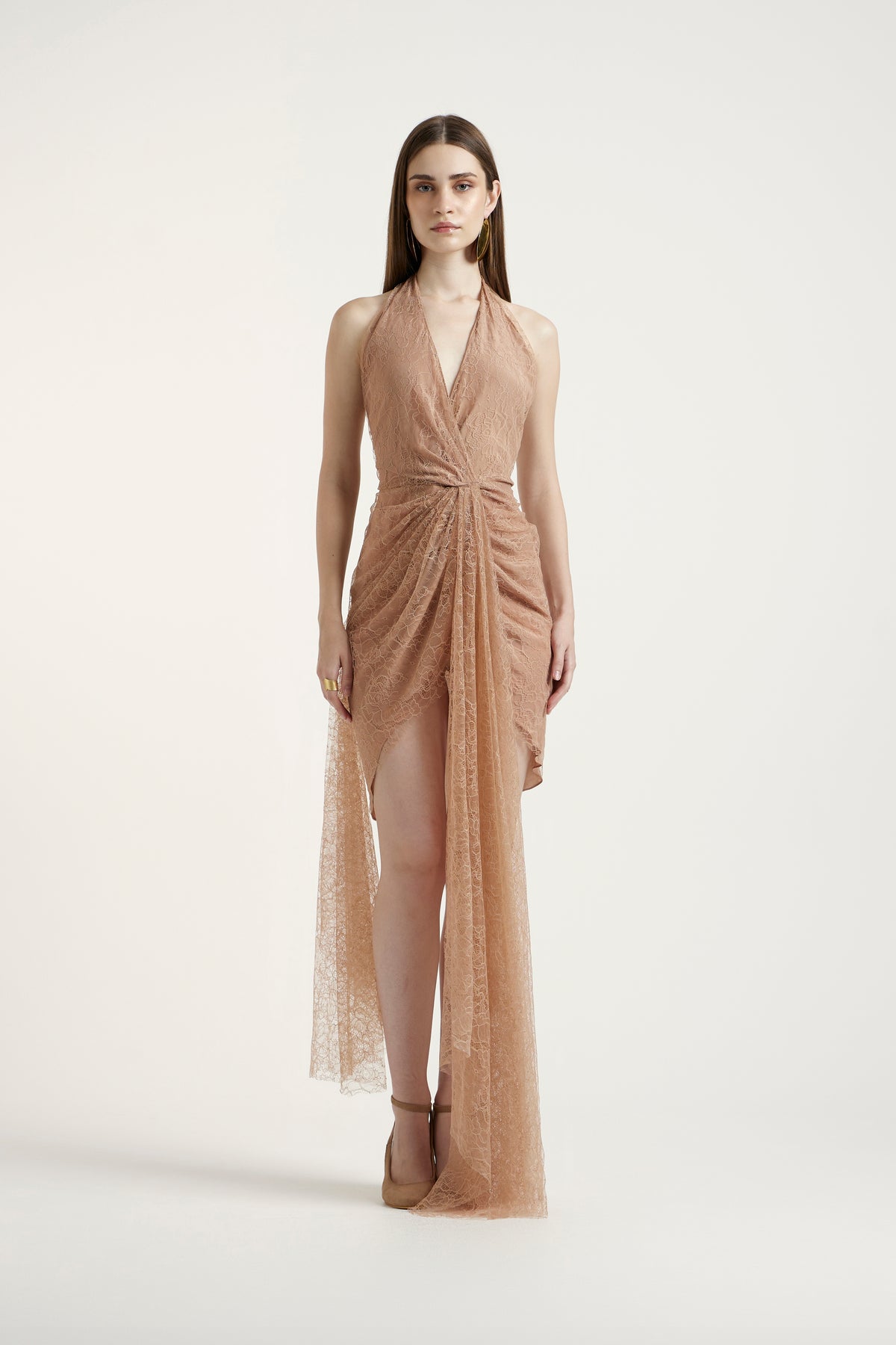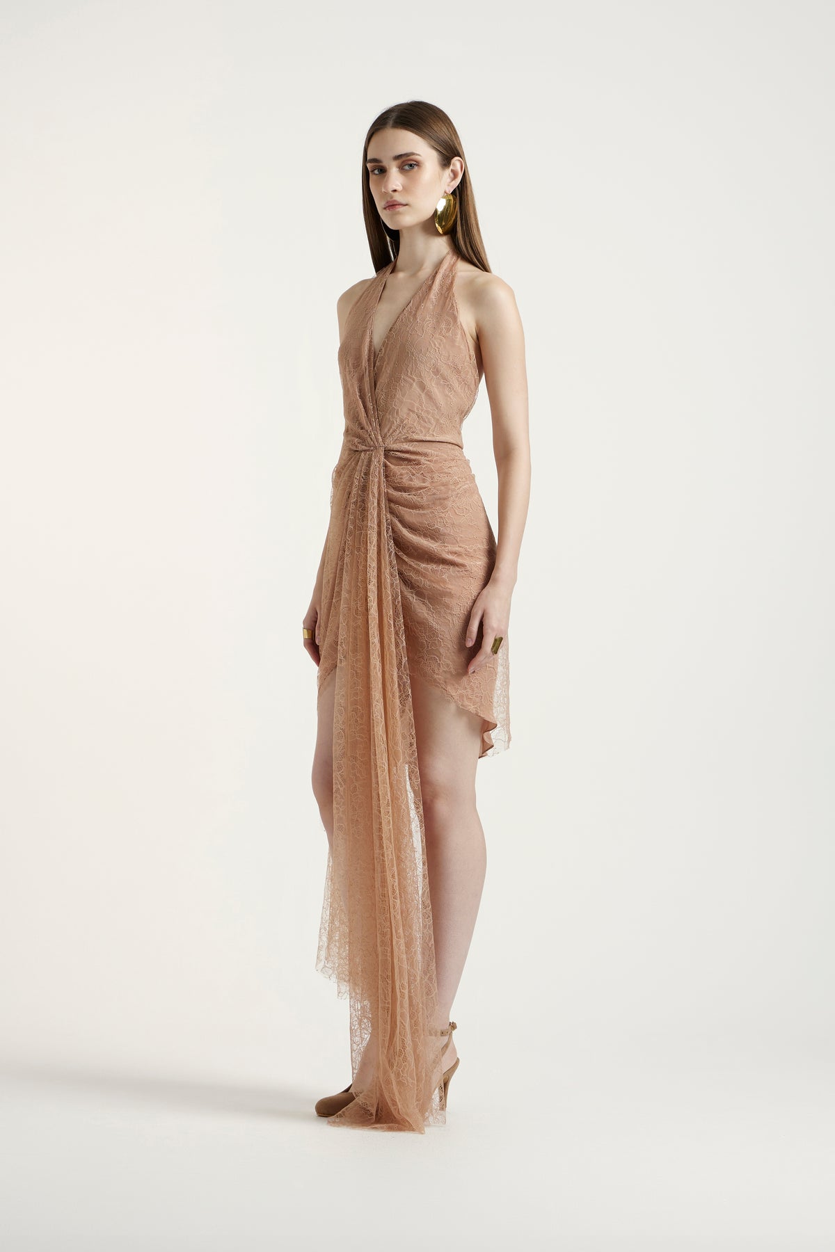 A champagne-toned dress created in net and malai, balancing delicate transparency with smooth support. The soft shimmer of the champagne hue enhances its romantic appeal, making the silhouette feel airy and polished. A refined choice for celebrations, evening gatherings, and sophisticated resort dressing.