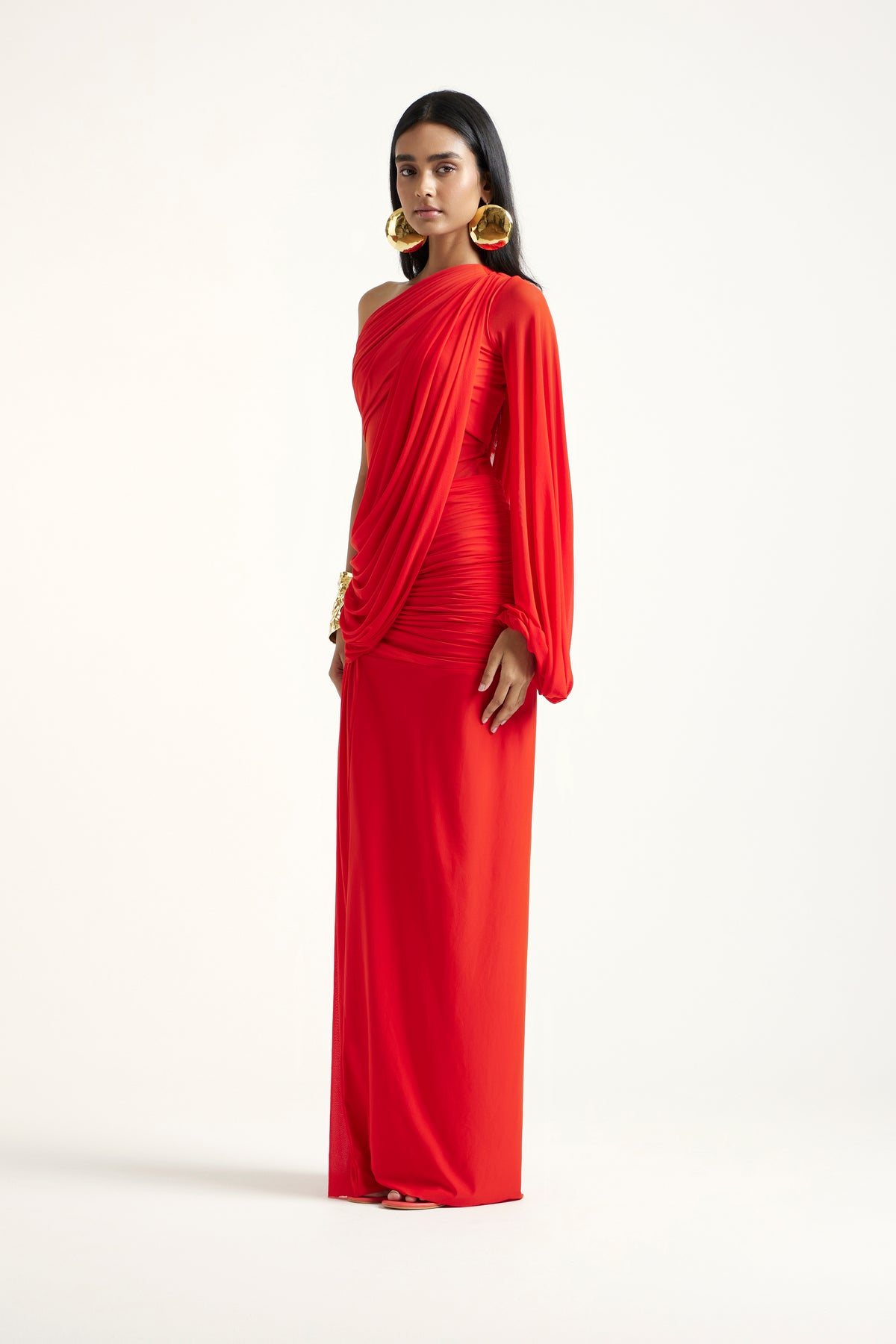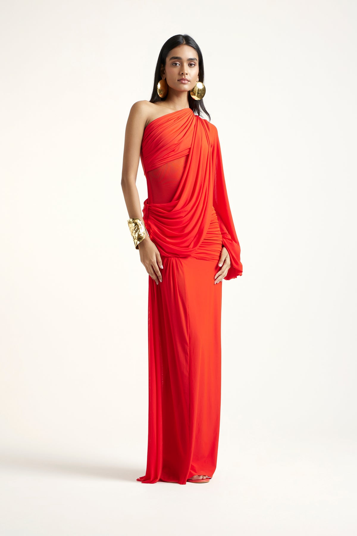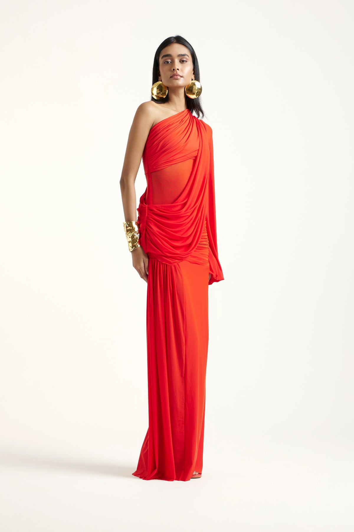 A vibrant hibiscus dress blending delicate net with soft malai, creating a multidimensional interplay of texture. The sheer overlay brings lightness and movement, while the inner malai adds comfort and modesty. Feminine, playful, and bright, the Diane is the perfect statement for summer gatherings and warm-weather celebrations.