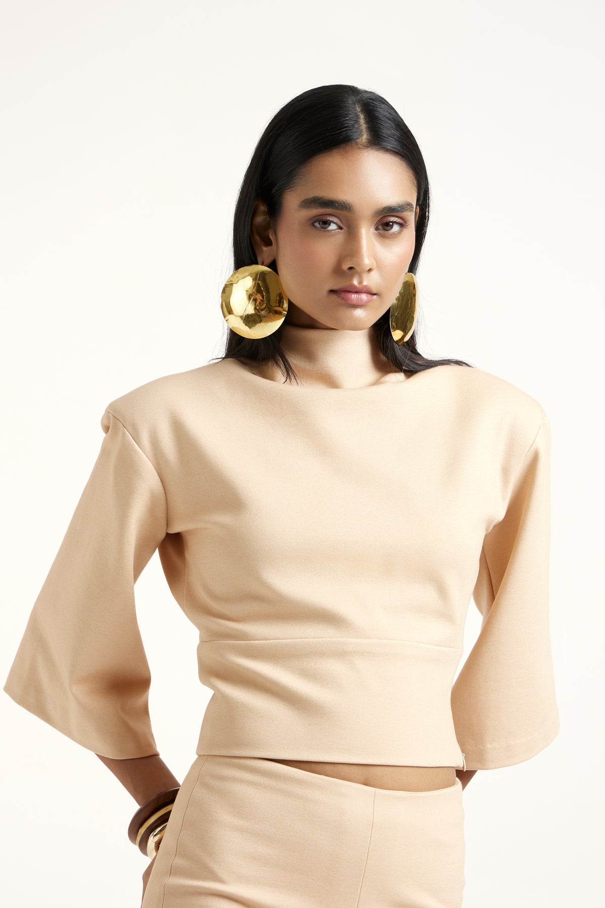A gold coord set in ponte, offering a sculpted yet comfortable fit. The top and shorts pair create a balanced silhouette that is both playful and refined. The ponte’s structure ensures a clean, modern look — perfect for warm-weather events or elevated casual styling.