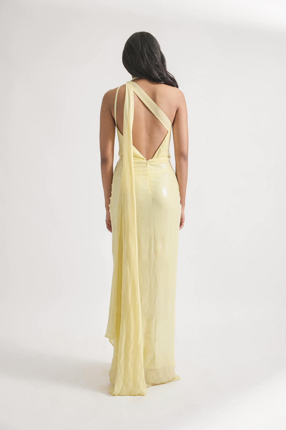 يجمع هذا الفستان المذهل ذو الكتف الواحد والمزين بالترتر بين التألق والأناقة، ويتميز بتفاصيل وردة جميلة على التنورة الأمامية التي تضيف لمسة رومانسية. تعزز تفاصيل الوشاح الأنيقة على الرقبة الصورة الظلية المتطورة، مما يخلق مزيجًا متناغمًا من الأنماط الكلاسيكية والمعاصرة. مثالي لترك انطباع مبهر، هذا الفستان مثالي لأي حدث رسمي أو مناسبة خاصة.