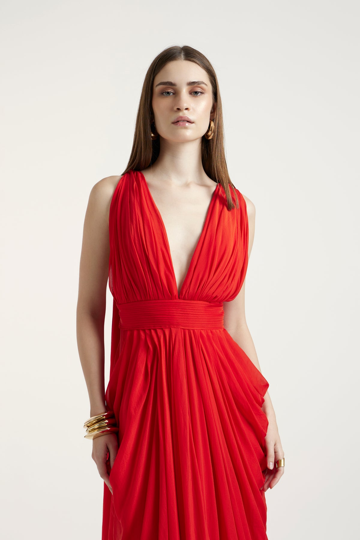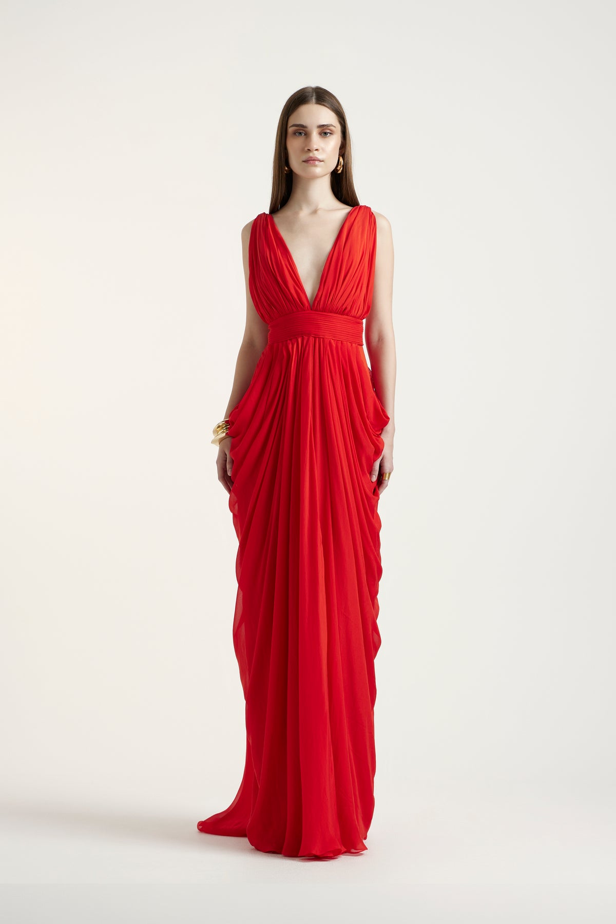 A hibiscus pure chiffon dress that radiates sophistication with its flowing movement and rich color. The feather-light texture of the chiffon adds grace and fluidity to every step. The Sabrina dress is the embodiment of modern romanticism — refined, feminine, and beautifully timeless.