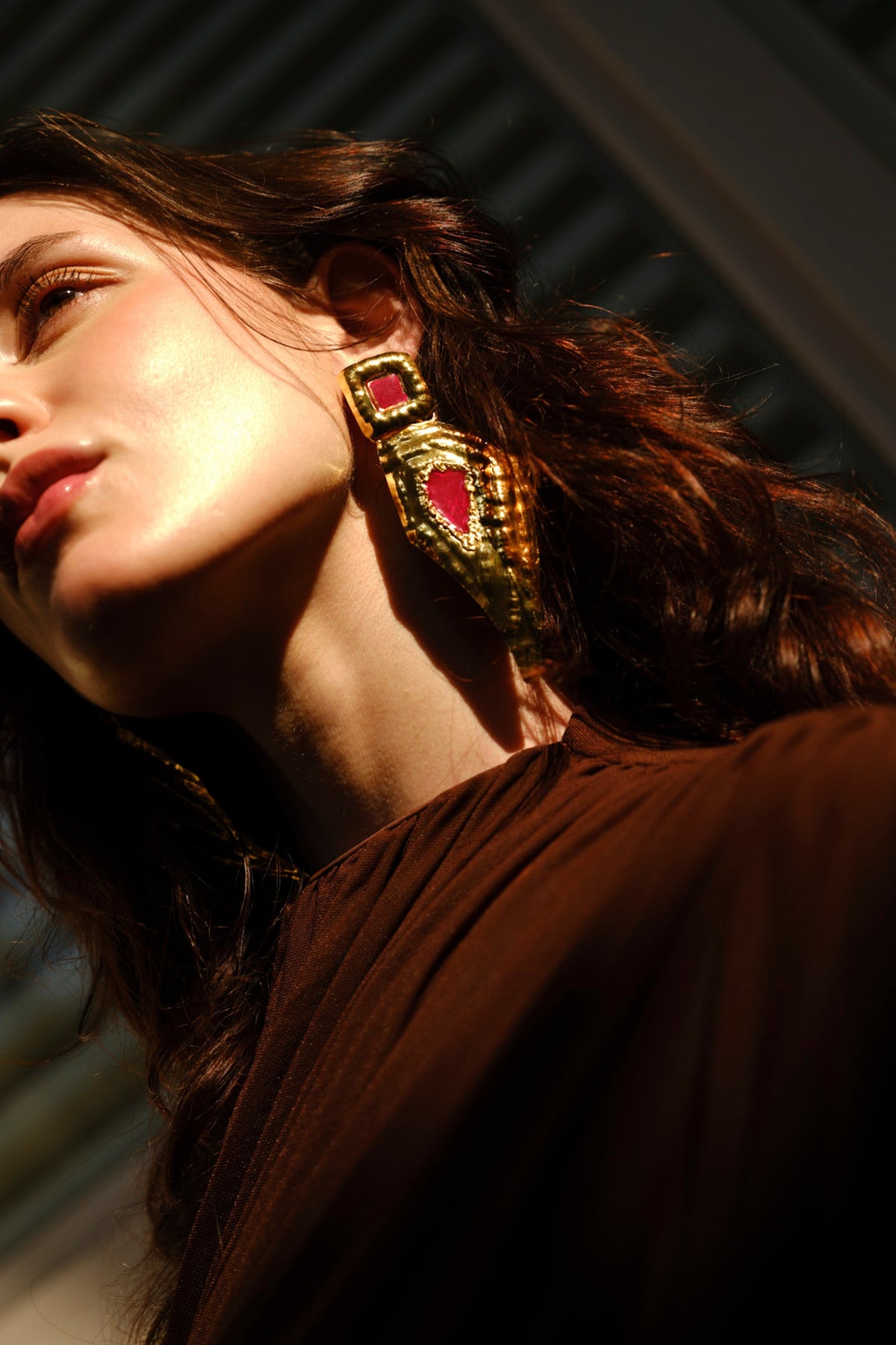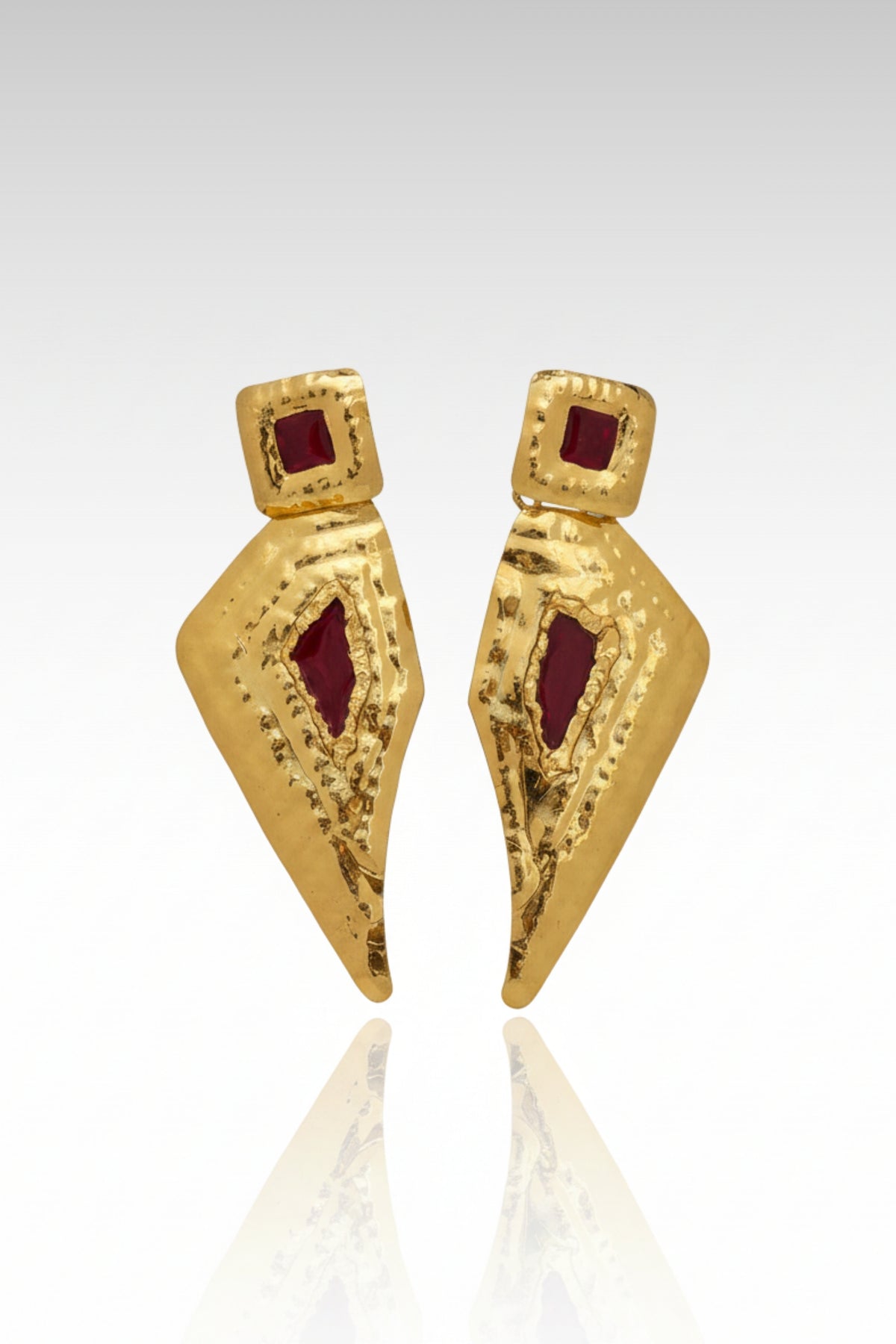 Striking gold statement earrings crafted in an angular, sculptural form, accented with deep red stone detailing. The textured gold surface adds depth and character, while the sharp silhouette creates a bold, artful finish designed to elevate evening and occasion looks.