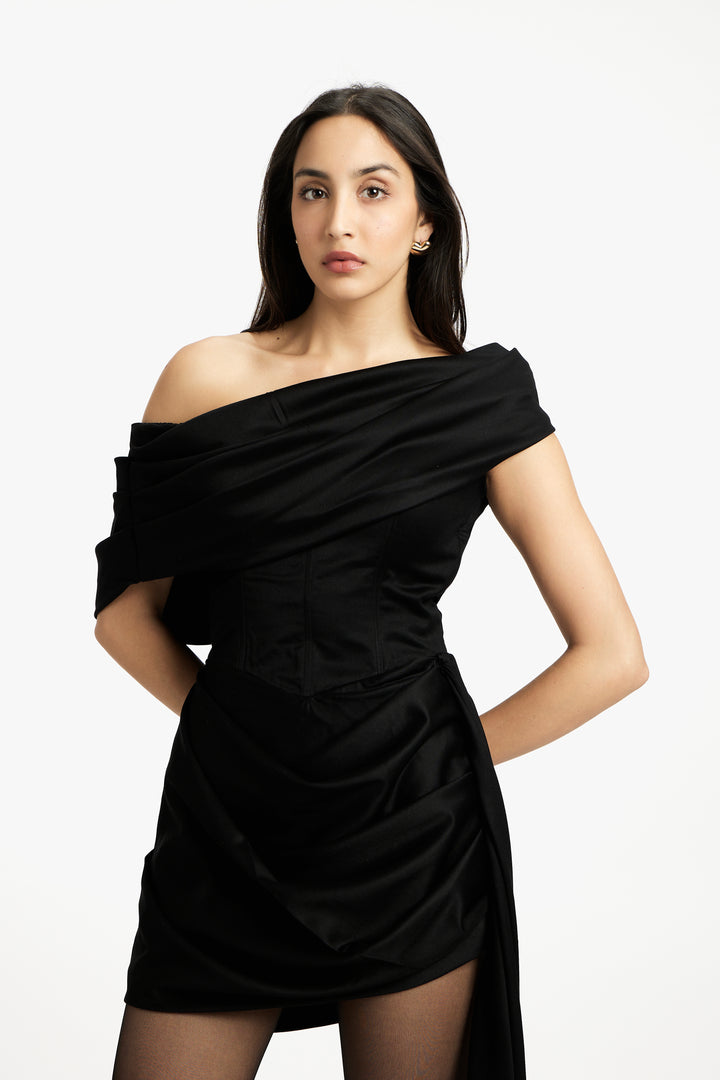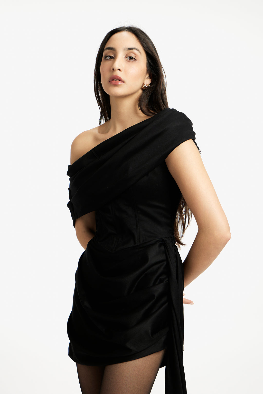 The dress features full sleeves and heavy ruching across the hips and waist, creating a flattering silhouette. The draped detail adds a touch of sophistication, while three gold brooches on the side of the ruched area provide a luxurious accent. Ideal for both formal and semi-formal occasions, this dress ensures you stand out with its unique and stylish design.