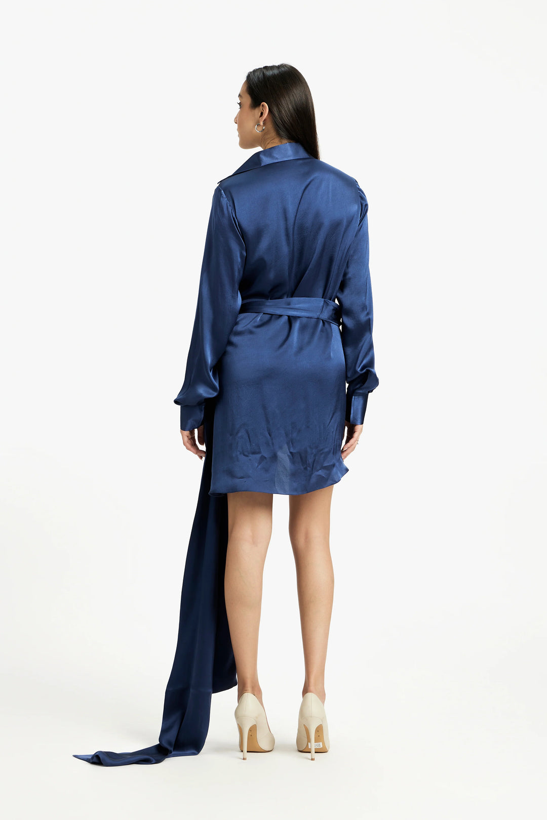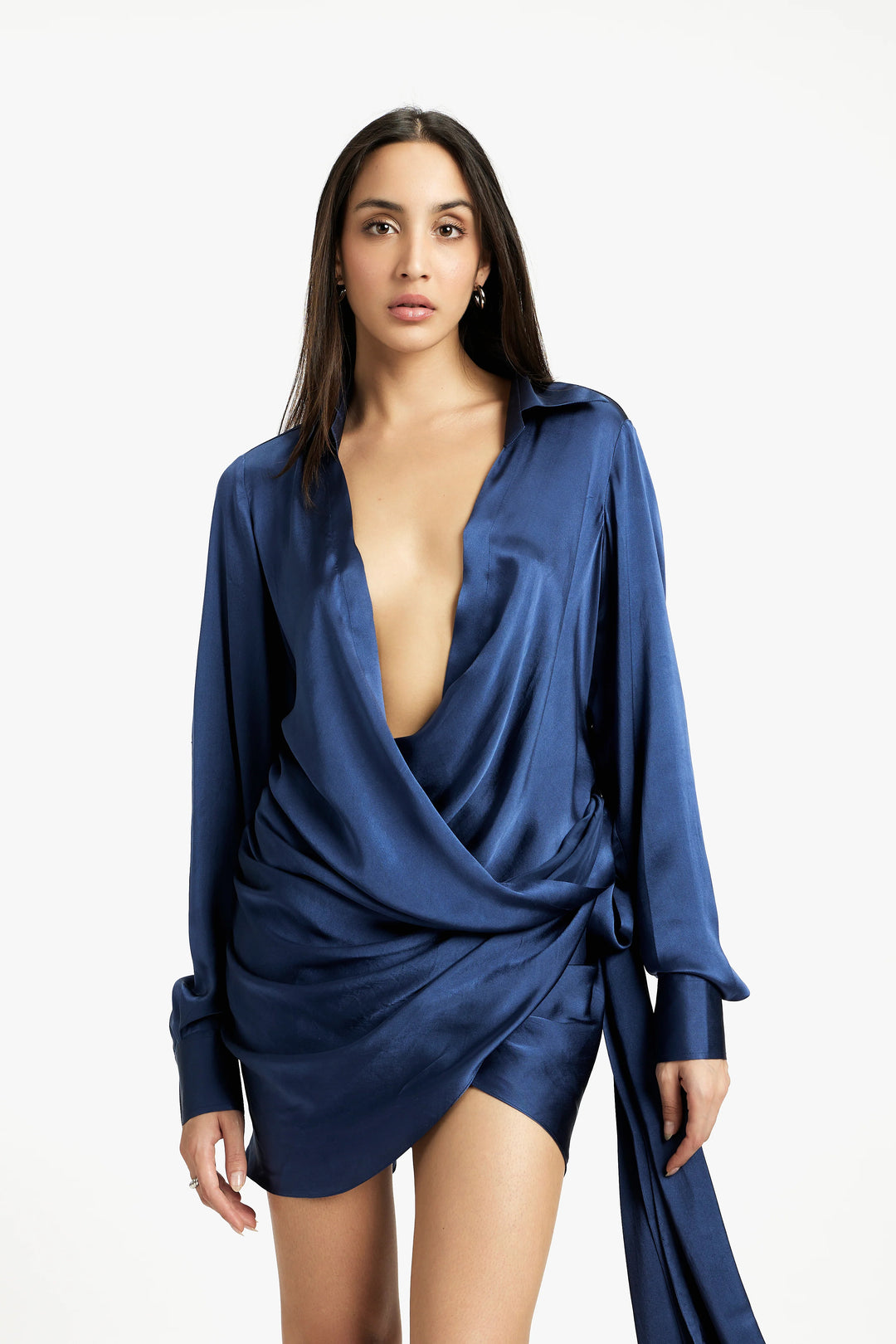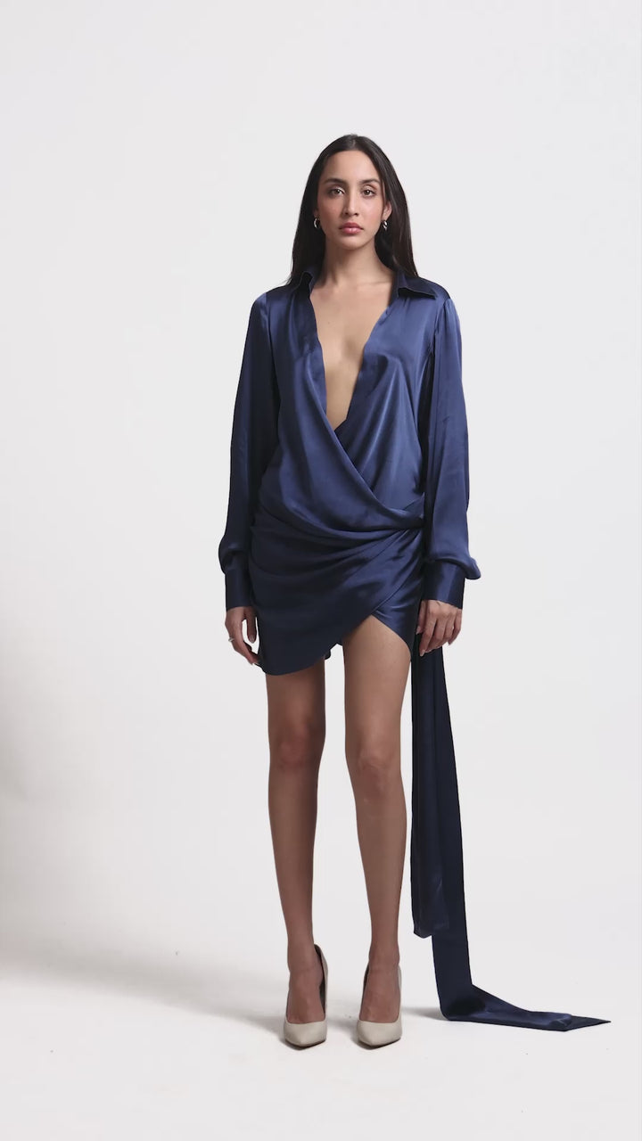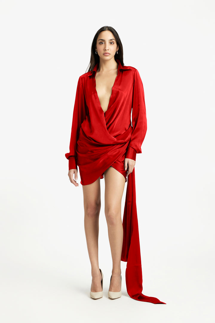 This elegant wrap dress boasts a flattering low neckline and distinctive long tie-up details on the wrists, adding a unique touch to its design. The wrap style ensures a comfortable and adjustable fit, perfect for any body shape. Ideal for both casual outings and formal events, this dress offers a blend of sophistication and modernity, making it a versatile addition to your wardrobe.