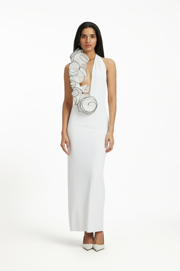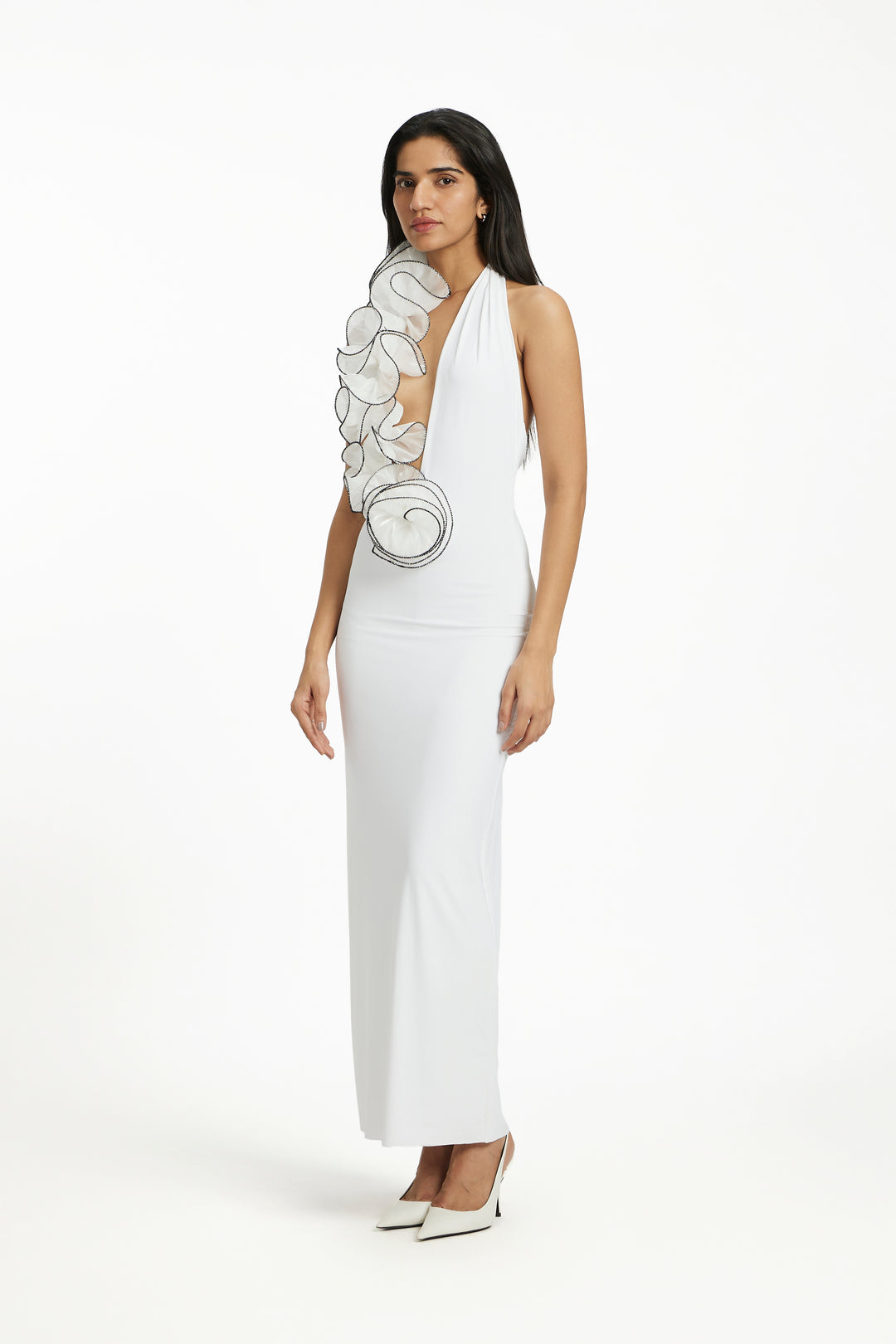 The dress features full sleeves and heavy ruching across the hips and waist, creating a flattering silhouette. The draped detail adds a touch of sophistication, while three gold brooches on the side of the ruched area provide a luxurious accent. Ideal for both formal and semi-formal occasions, this dress ensures you stand out with its unique and stylish design.