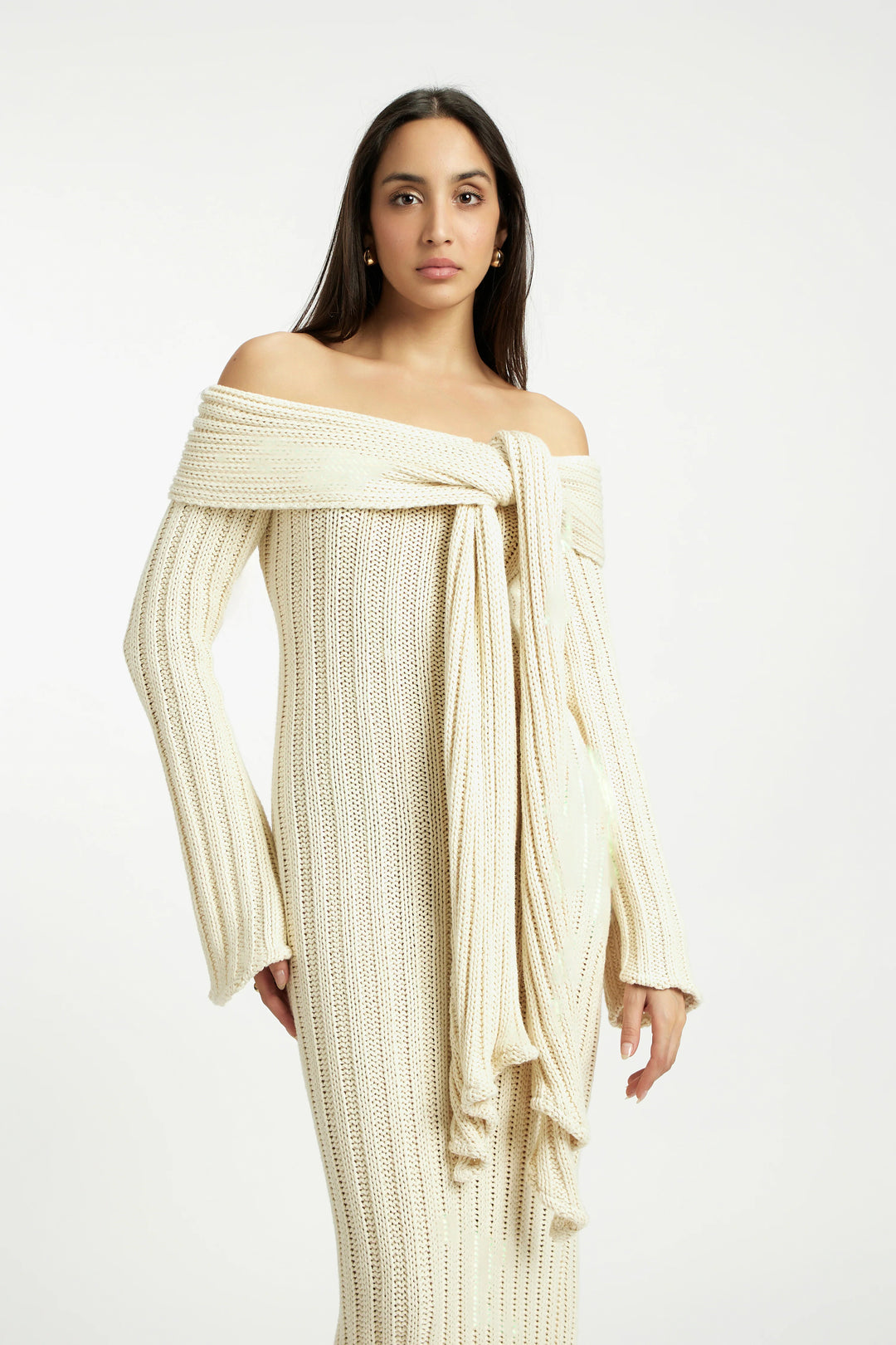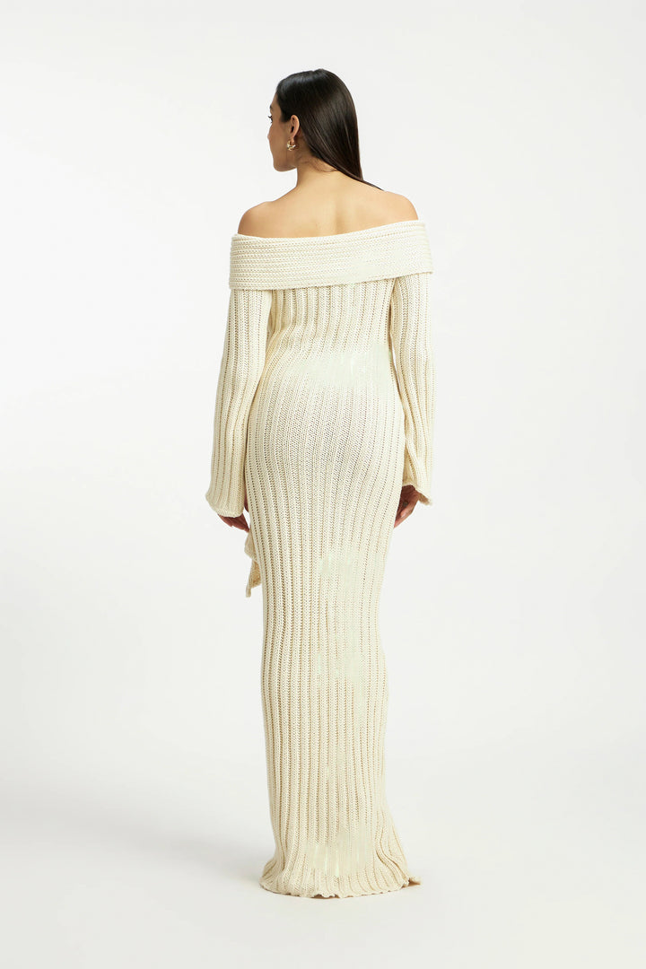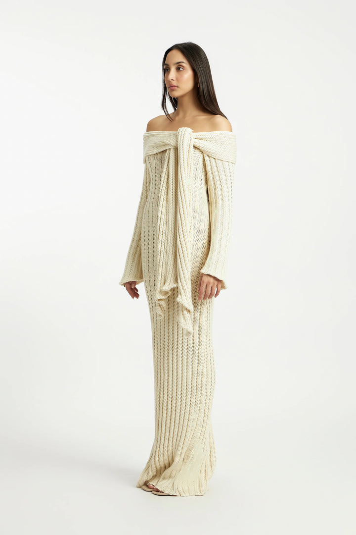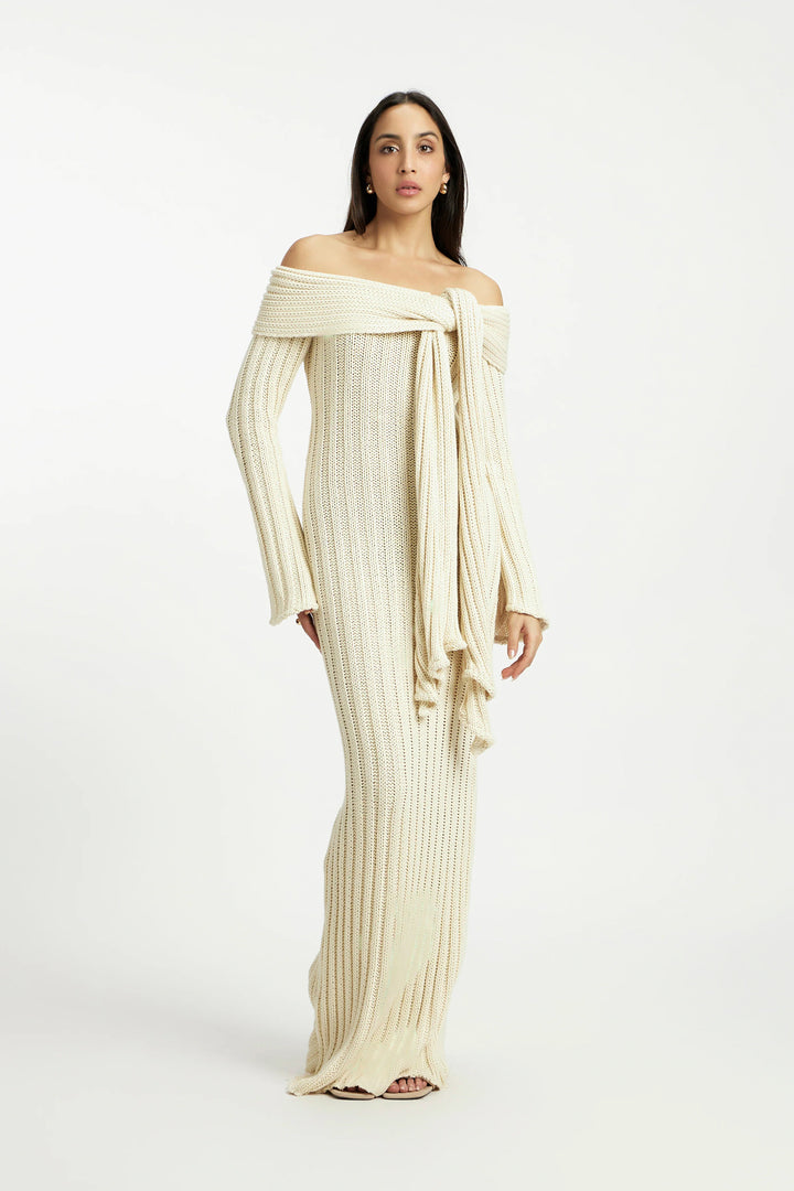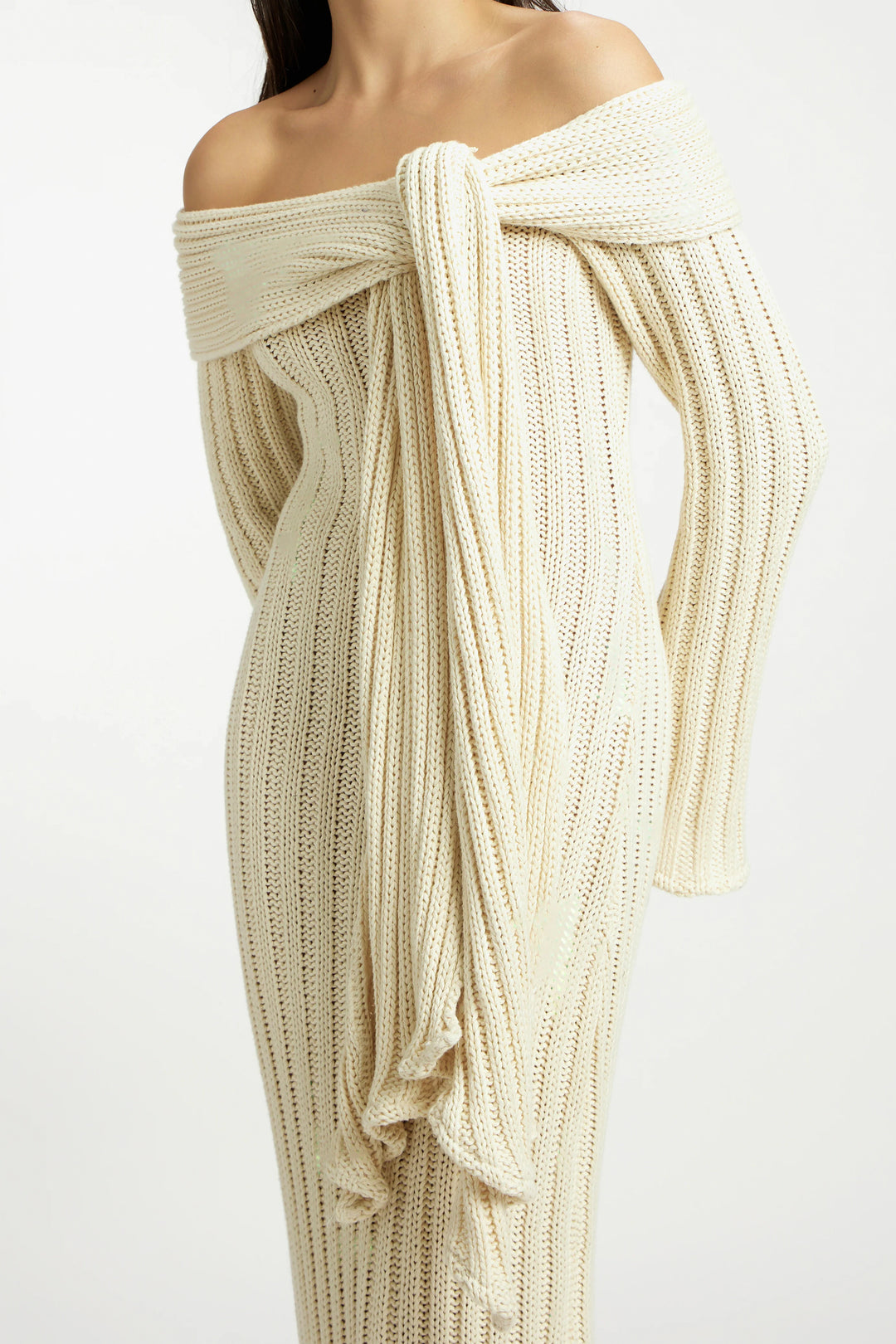 The dress features full sleeves and heavy ruching across the hips and waist, creating a flattering silhouette. The draped detail adds a touch of sophistication, while three gold brooches on the side of the ruched area provide a luxurious accent. Ideal for both formal and semi-formal occasions, this dress ensures you stand out with its unique and stylish design.