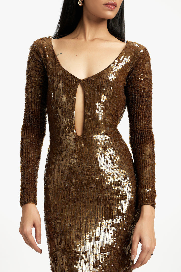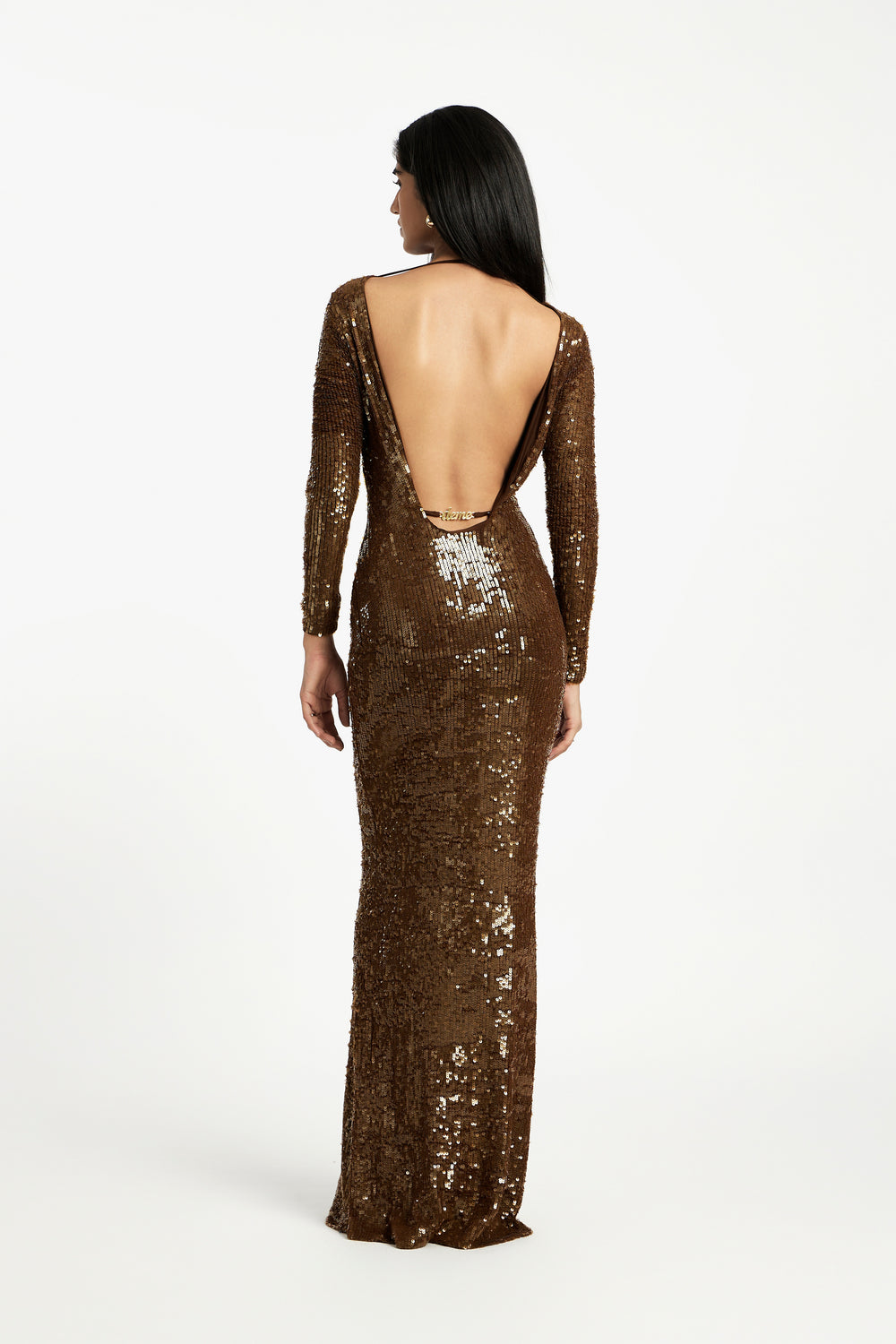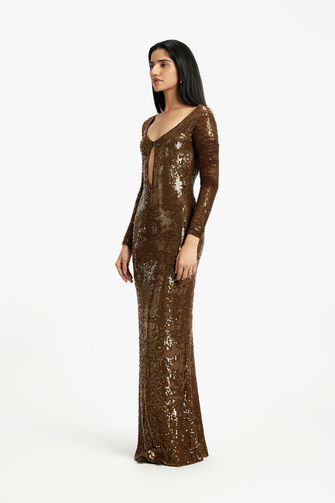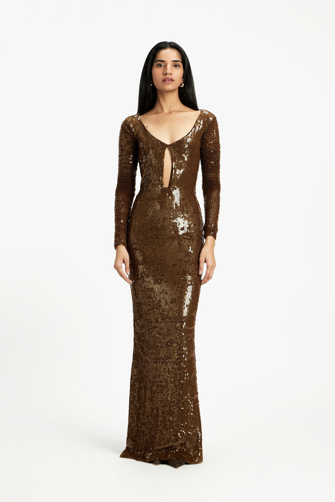 The dress features full sleeves and heavy ruching across the hips and waist, creating a flattering silhouette. The draped detail adds a touch of sophistication, while three gold brooches on the side of the ruched area provide a luxurious accent. Ideal for both formal and semi-formal occasions, this dress ensures you stand out with its unique and stylish design.