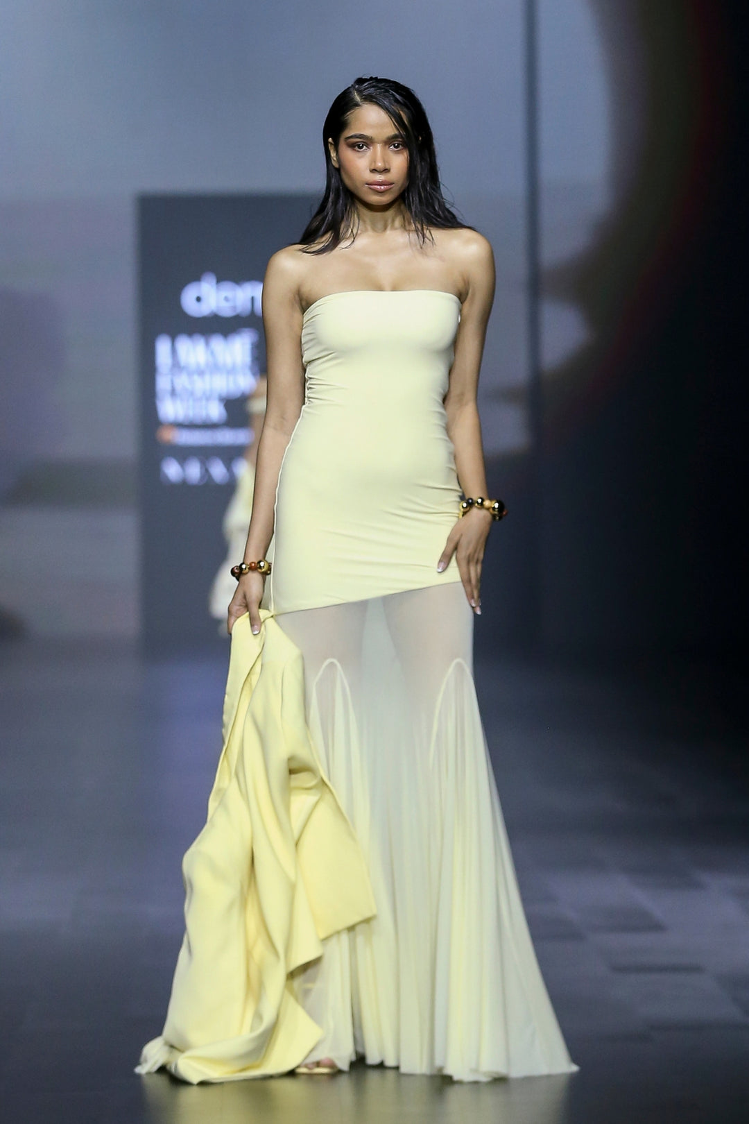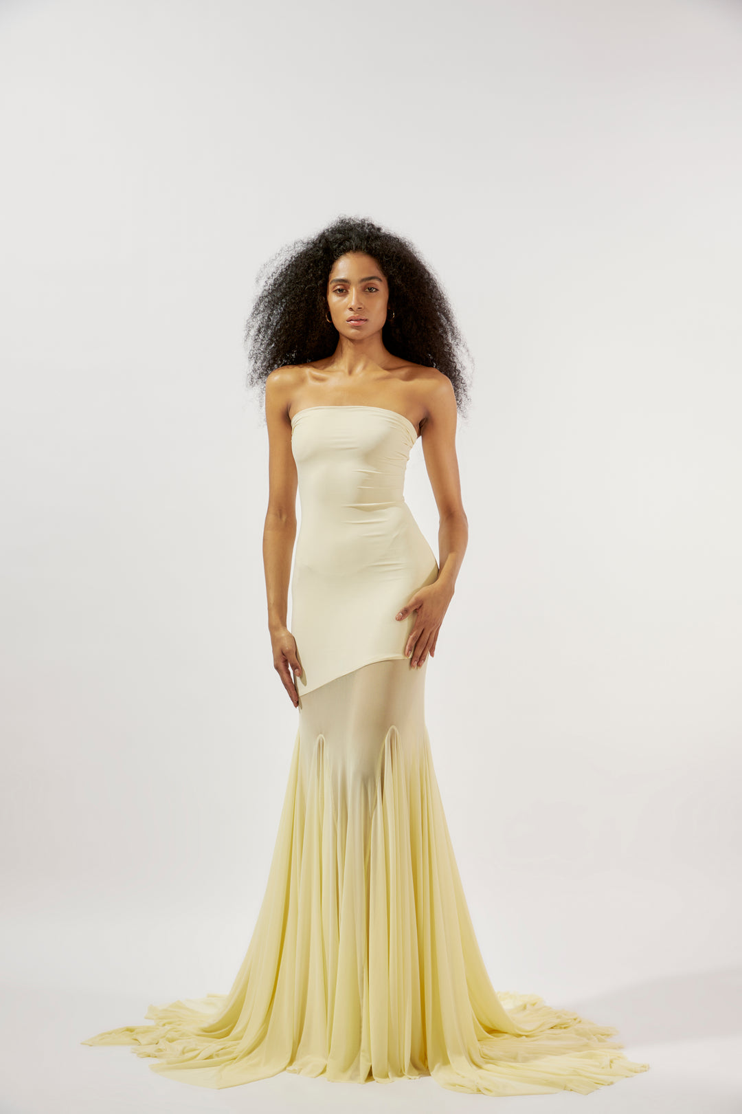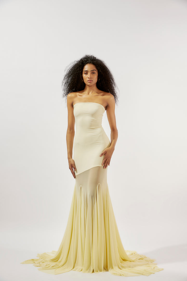 Indulge in the allure of sophistication with this butter yellow malai lycra tube gown, adorned with flared mesh panels for a touch of whimsical charm. The strapless bodice contours your figure with a flattering silhouette, while the buttery hue infuses warmth and vibrancy into your ensemble. Flowing from the waist down, the flared mesh panels add movement and dimension, creating an enchanting aura as you glide across the room. This gown exudes timeless elegance and feminine grace, ensuring you stand out with effortless poise and style.