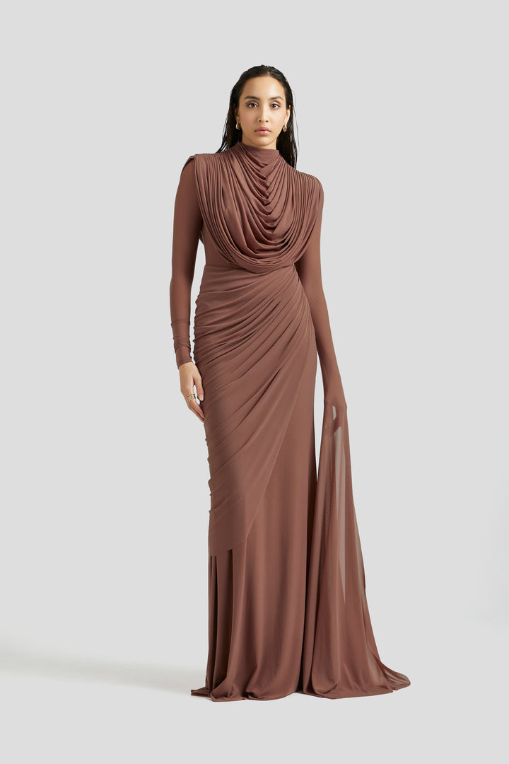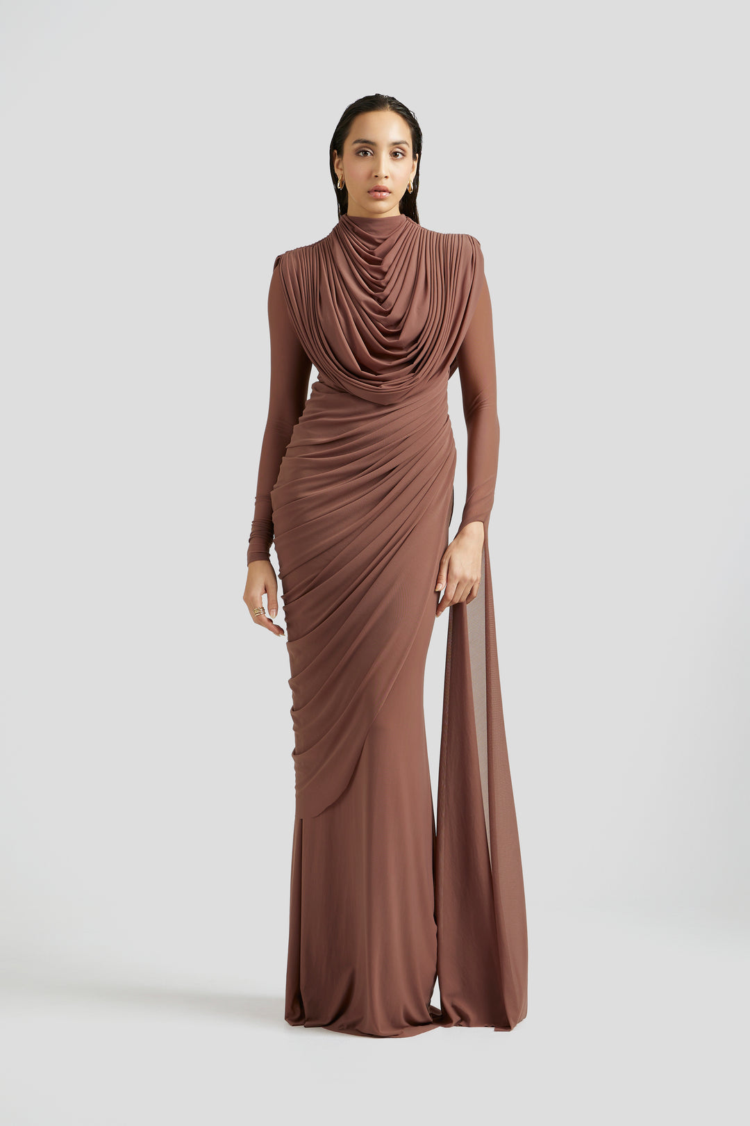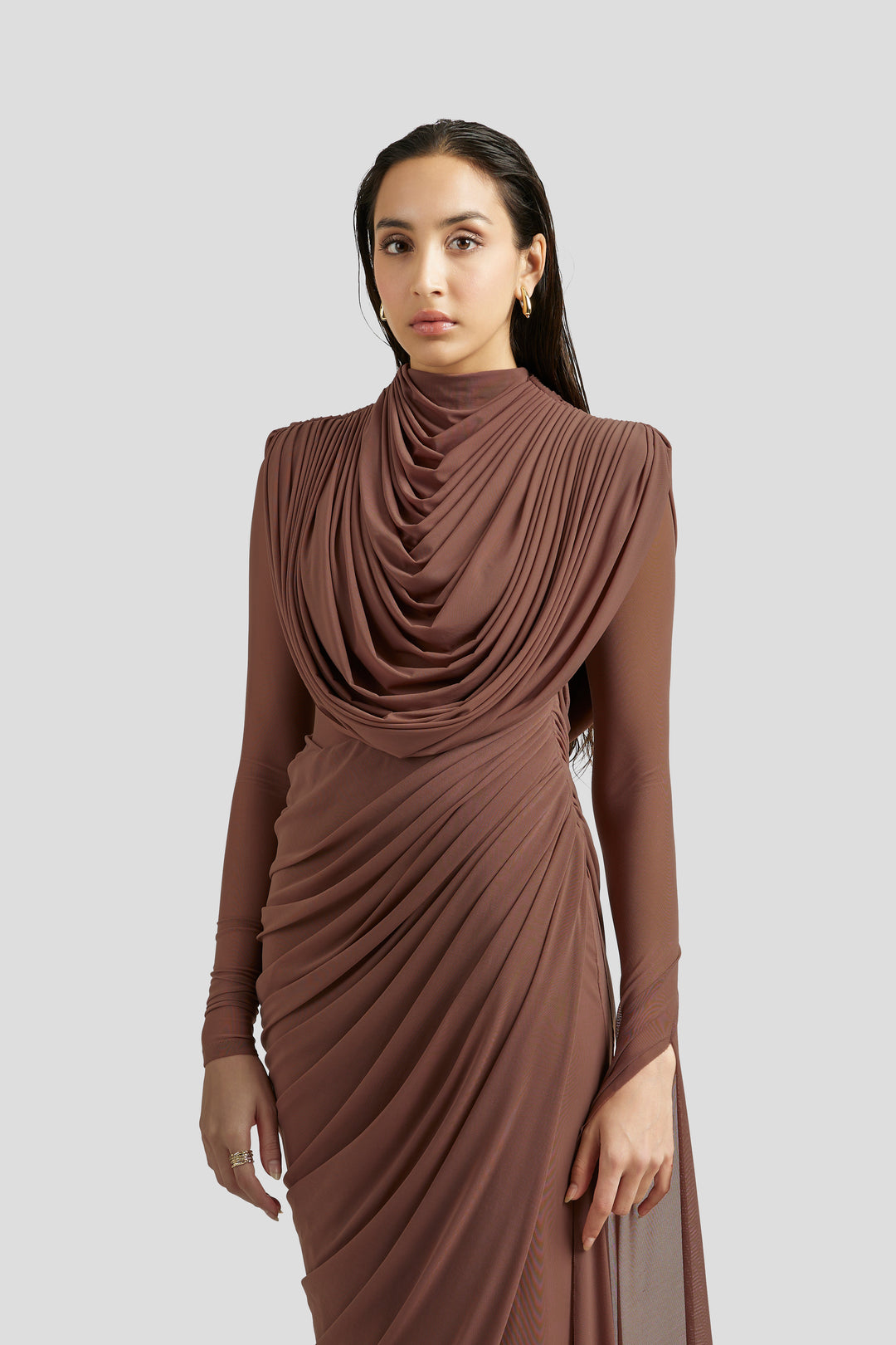 Embrace sophistication in this fully covered dress, boasting full sleeves and subtle cowls at the top, adding a touch of texture and interest to the ensemble. The slight drape on the bottom creates a graceful silhouette, ensuring a flattering fit that exudes timeless charm and elegance. Perfect for formal events or upscale occasions, this dress promises to make a refined statement with its understated yet captivating design.
