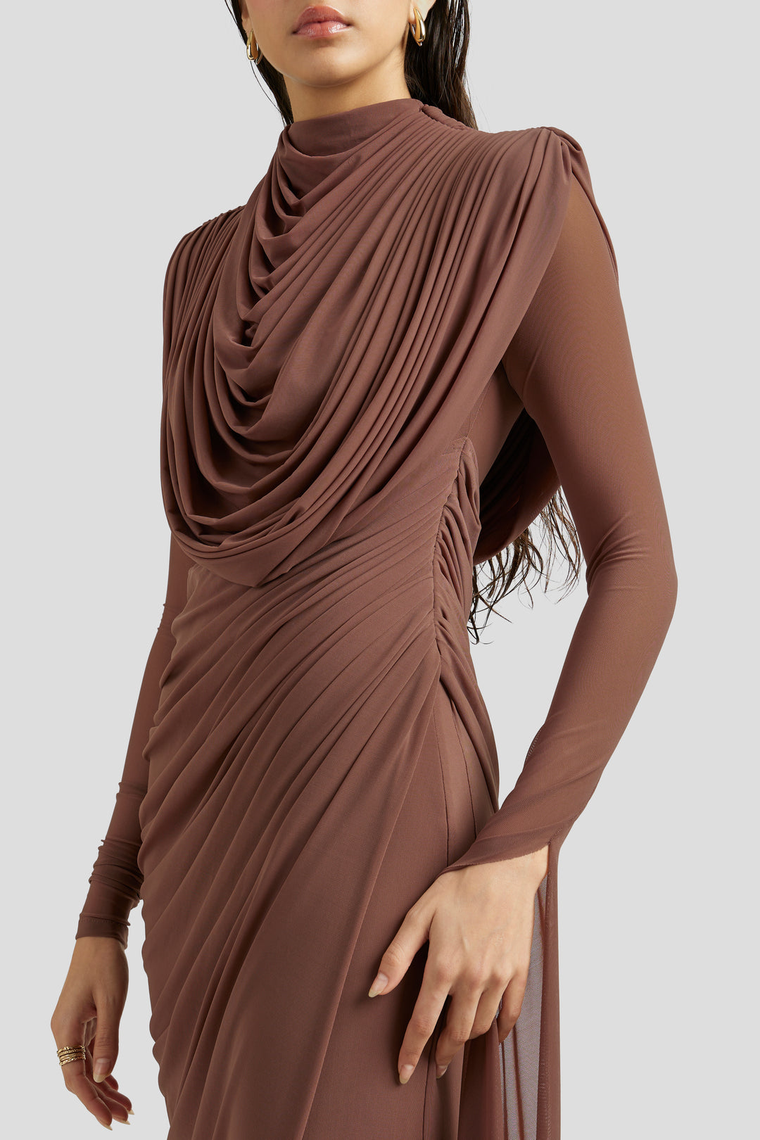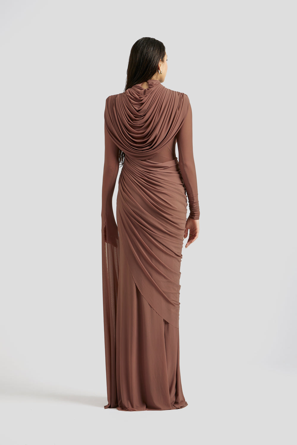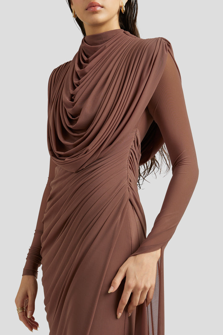 Embrace sophistication in this fully covered dress, boasting full sleeves and subtle cowls at the top, adding a touch of texture and interest to the ensemble. The slight drape on the bottom creates a graceful silhouette, ensuring a flattering fit that exudes timeless charm and elegance. Perfect for formal events or upscale occasions, this dress promises to make a refined statement with its understated yet captivating design.