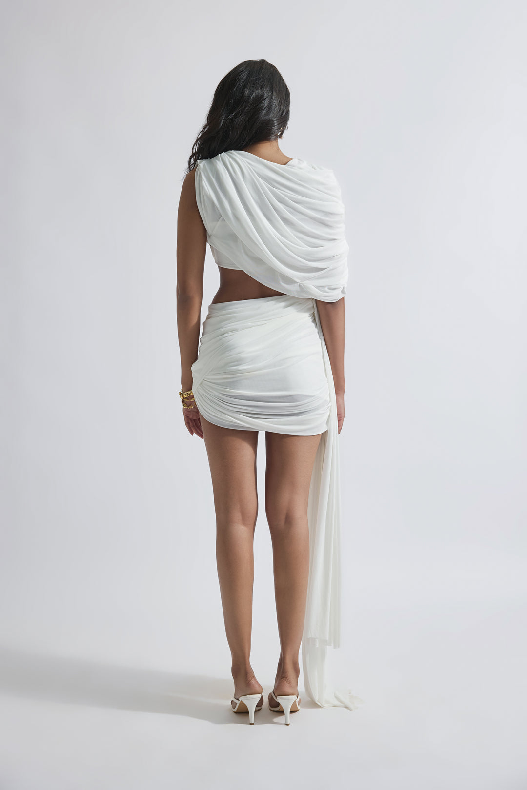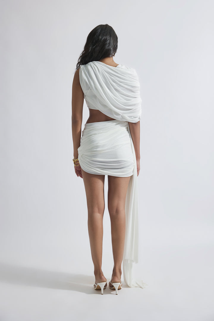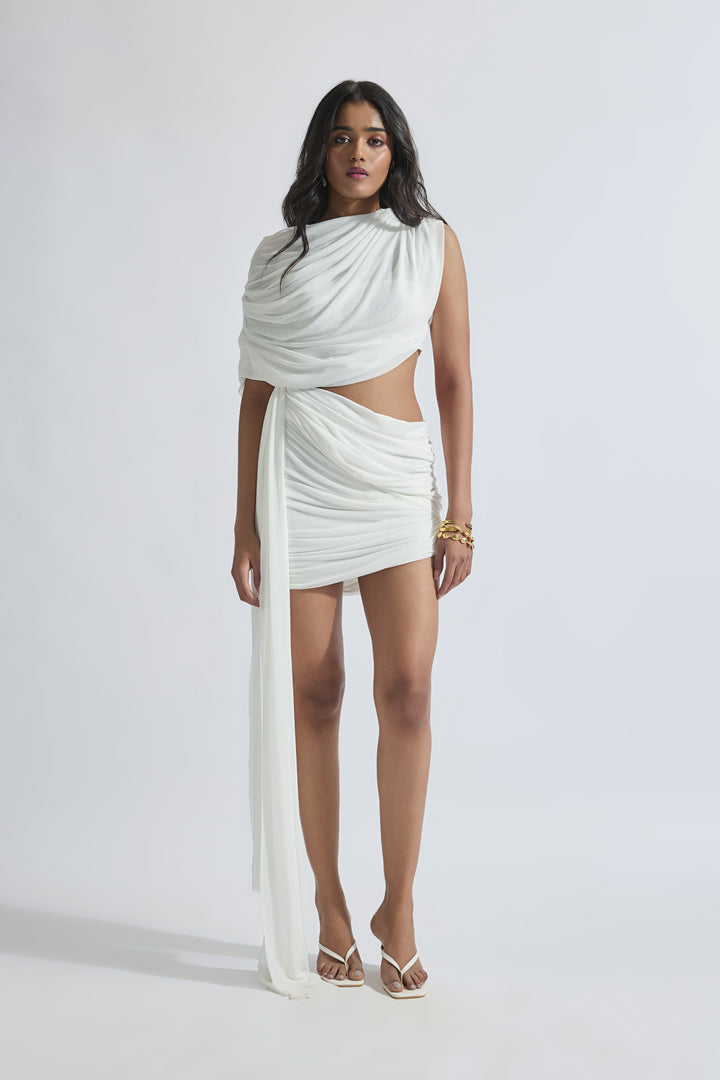 An asymmetric draped short dress in net with a dreamy drape falling from shoulders to waist, combined with a softly draped skirt and sophisticated draping detail falling gracefully from one side. This dress exudes elegance and modernity, perfect for special occasions where you want to make a statement with your style.