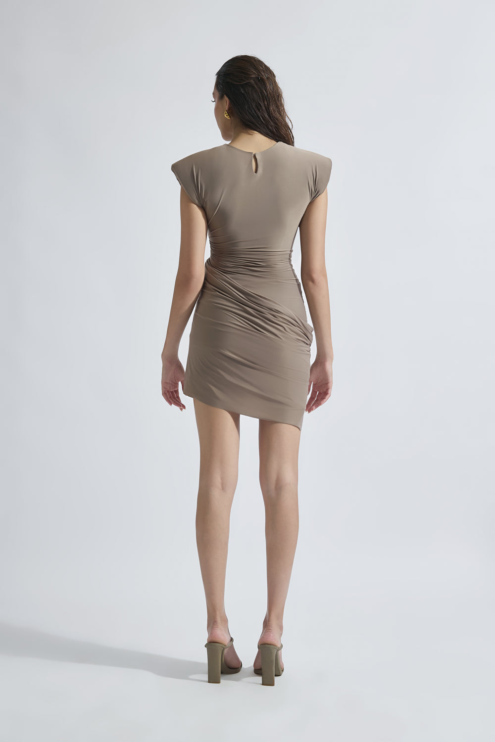 This striking power shoulder short dress seamlessly blends bold structure with refined elegance. The sharply defined power shoulders create a strong, confident silhouette, making a dramatic statement. The dress is tailored to flatter the figure, and the drape over the hips adds a touch of fluidity, creating a dynamic contrast with the structured shoulders. The draping accentuates the waist and adds movement. Crafted from high-quality fabric, this dress ensures both comfort and style, offering a chic, modern look that exudes confidence and glamour.