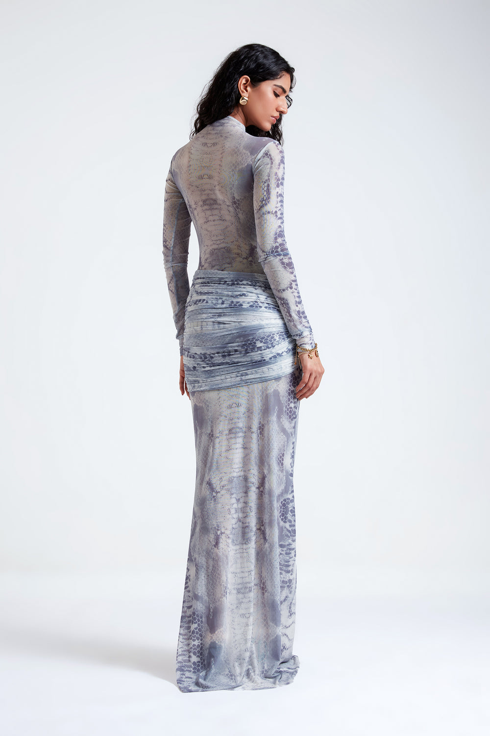 This full-sleeve, body-fitted gown is designed in striking animal-printed mesh that beautifully accentuates the figure. The gown features elegant drapes at the hips, adding a sophisticated touch and enhancing its overall silhouette. The combination of the bold print and refined drapes creates a dramatic yet elegant look.