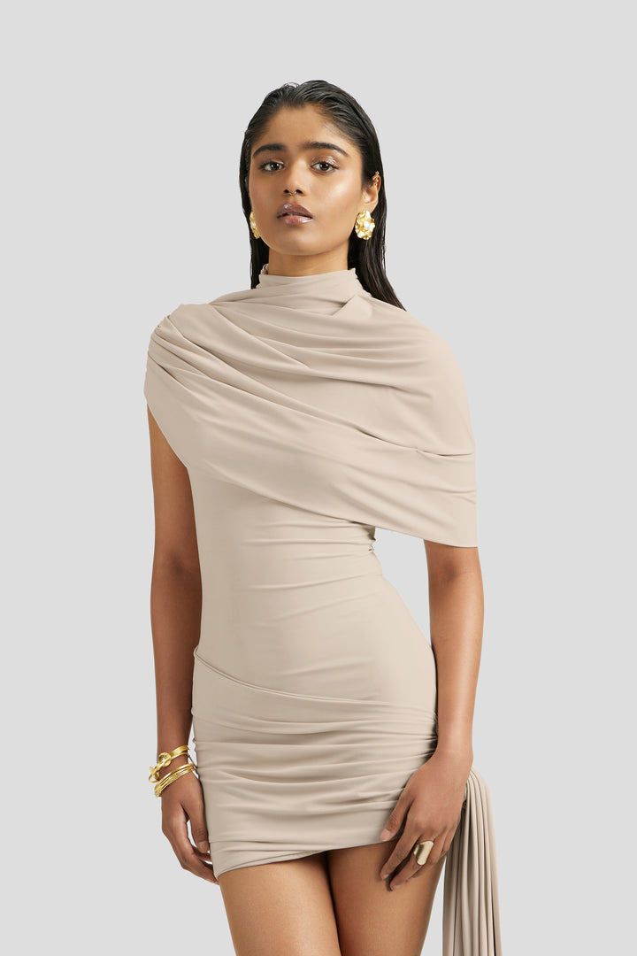 This elegant draped dress is designed to flatter the figure with its soft, flowing fabric that gracefully contours the body. The standout feature is the drape at the hips adding a modern, edgy twist to the classic draped silhouette. Perfect for those seeking a blend of sophistication and contemporary style, this dress effortlessly transitions from day to night.
