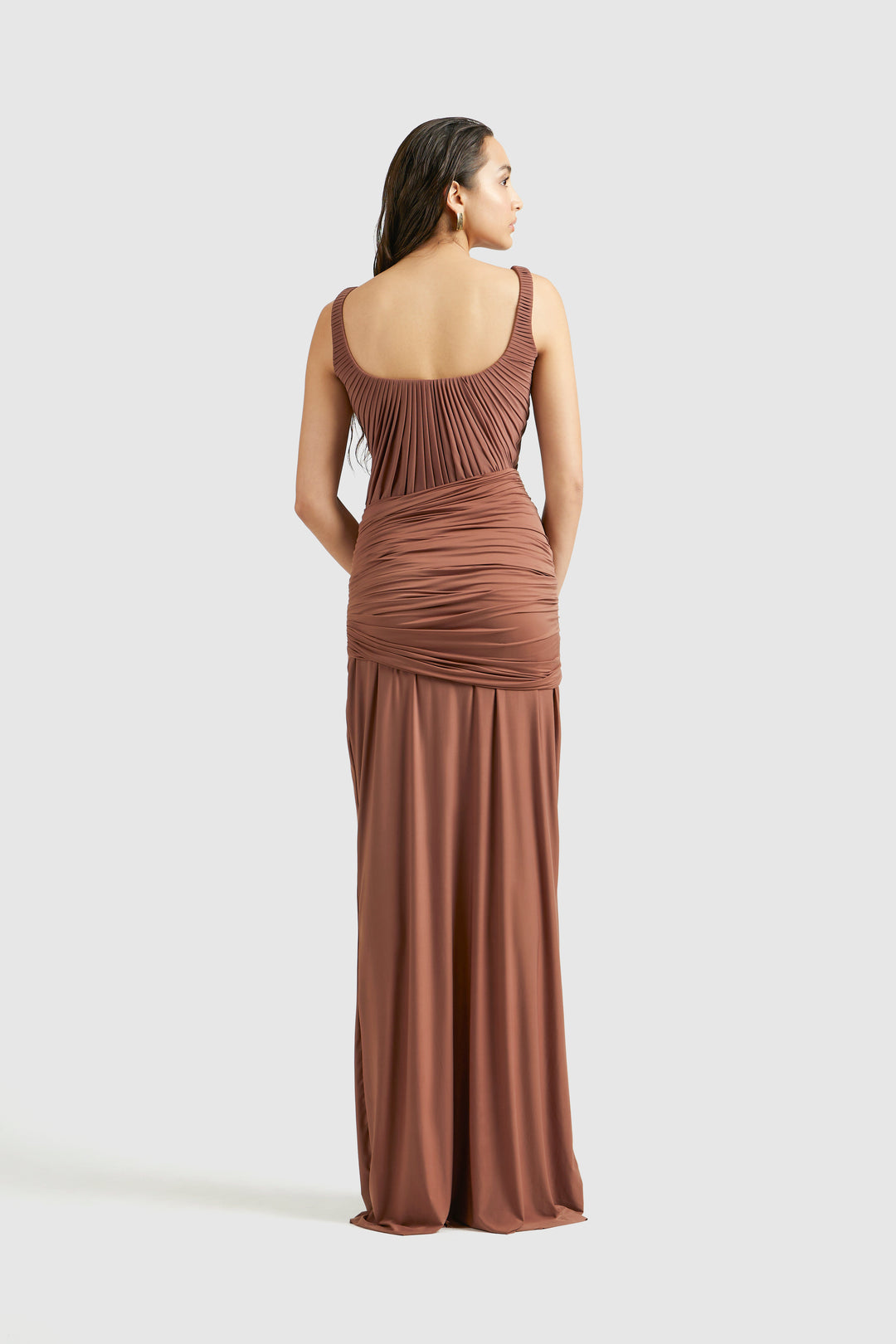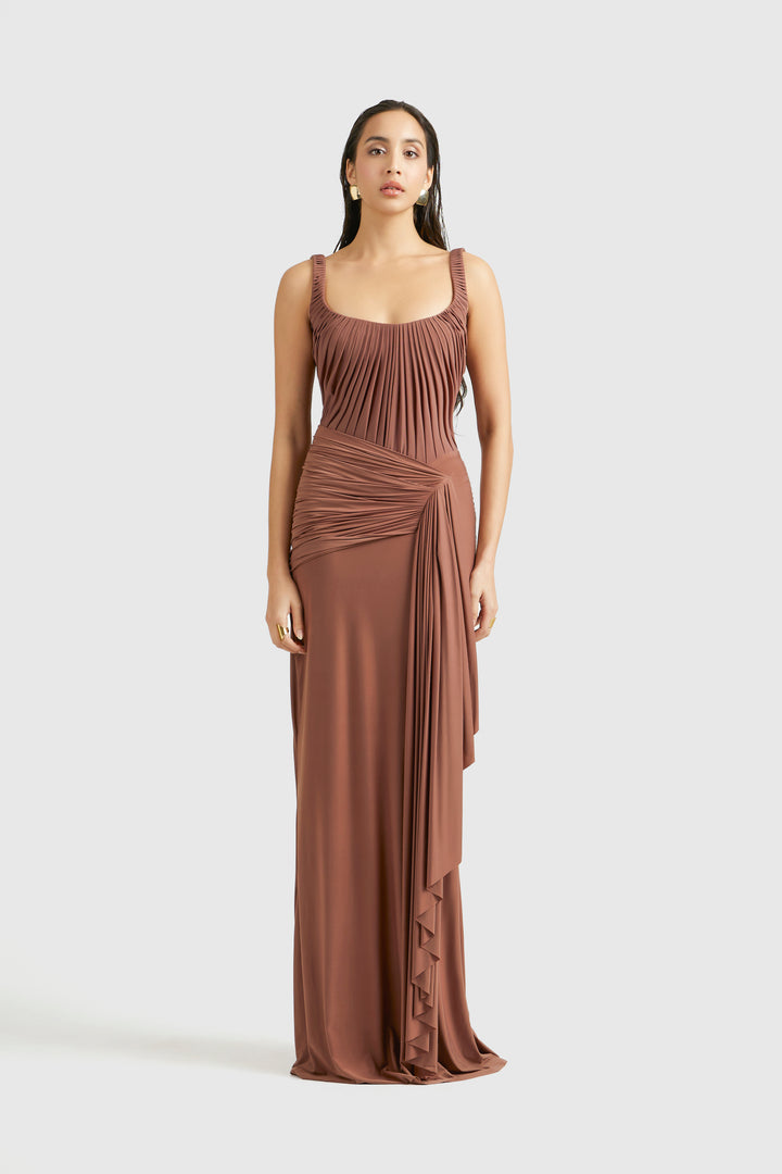 This elegant corset gown features a beautifully pleated bodice with a draped waist. The standout feature is the drape detail at the hips. The design exudes a timeless charm, perfect for making a graceful statement.