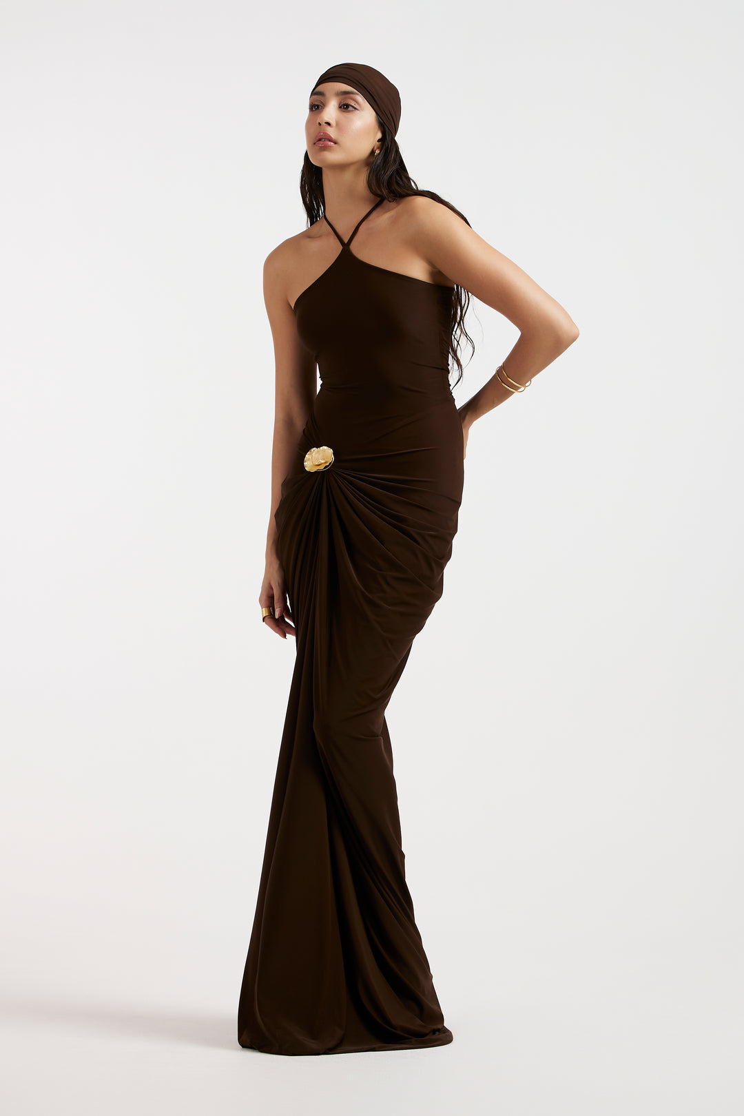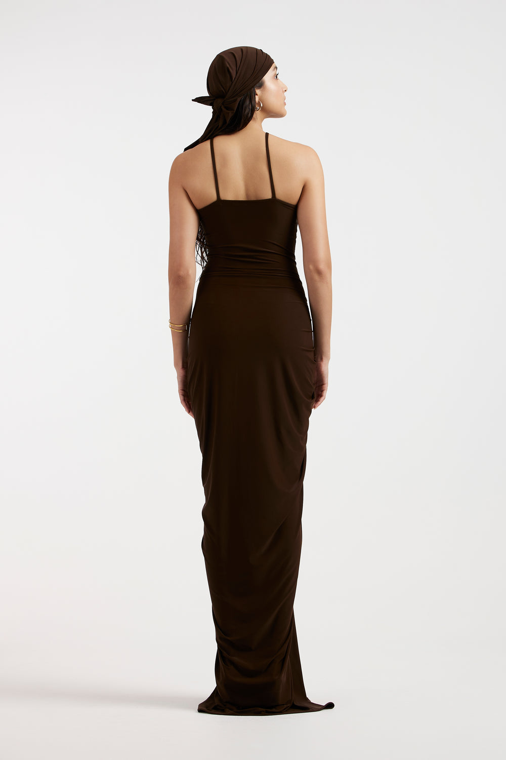 The dress with strappy detailing and a gathered silhouette. The ensemble is further enhanced with a gathered drop low waist at the front, creating a stylish and modern look that seamlessly combines playful elements with a touch of elegance.
