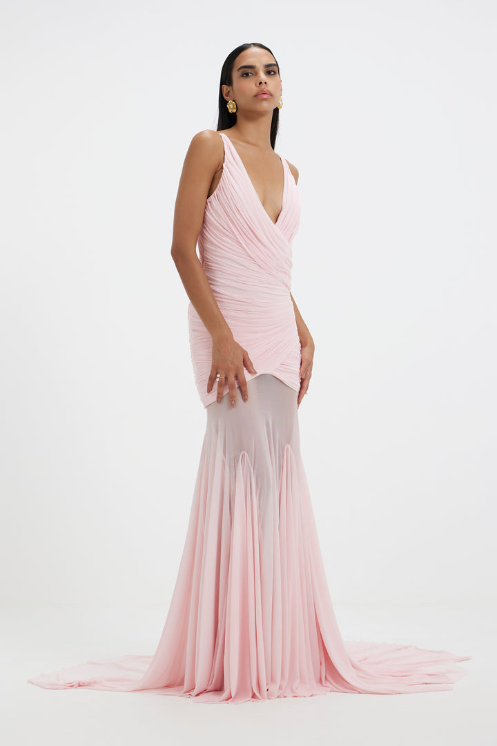 Boldly sculpted and powerfully feminine, this gown commands attention with its architectural lines and dramatic structure. Crafted in a richly ruched fabric, the bodice features precise, cross-directional ruching that flatters the form and draws the eye inward. A sharp V neckline mirrors the statement shoulders, creating a striking upper silhouette. Below, the voluminous skirt falls in a clean, flared shape, constructed with wide panels that lend movement and depth. A perfect harmony of strength and softness—engineered elegance at its finest.