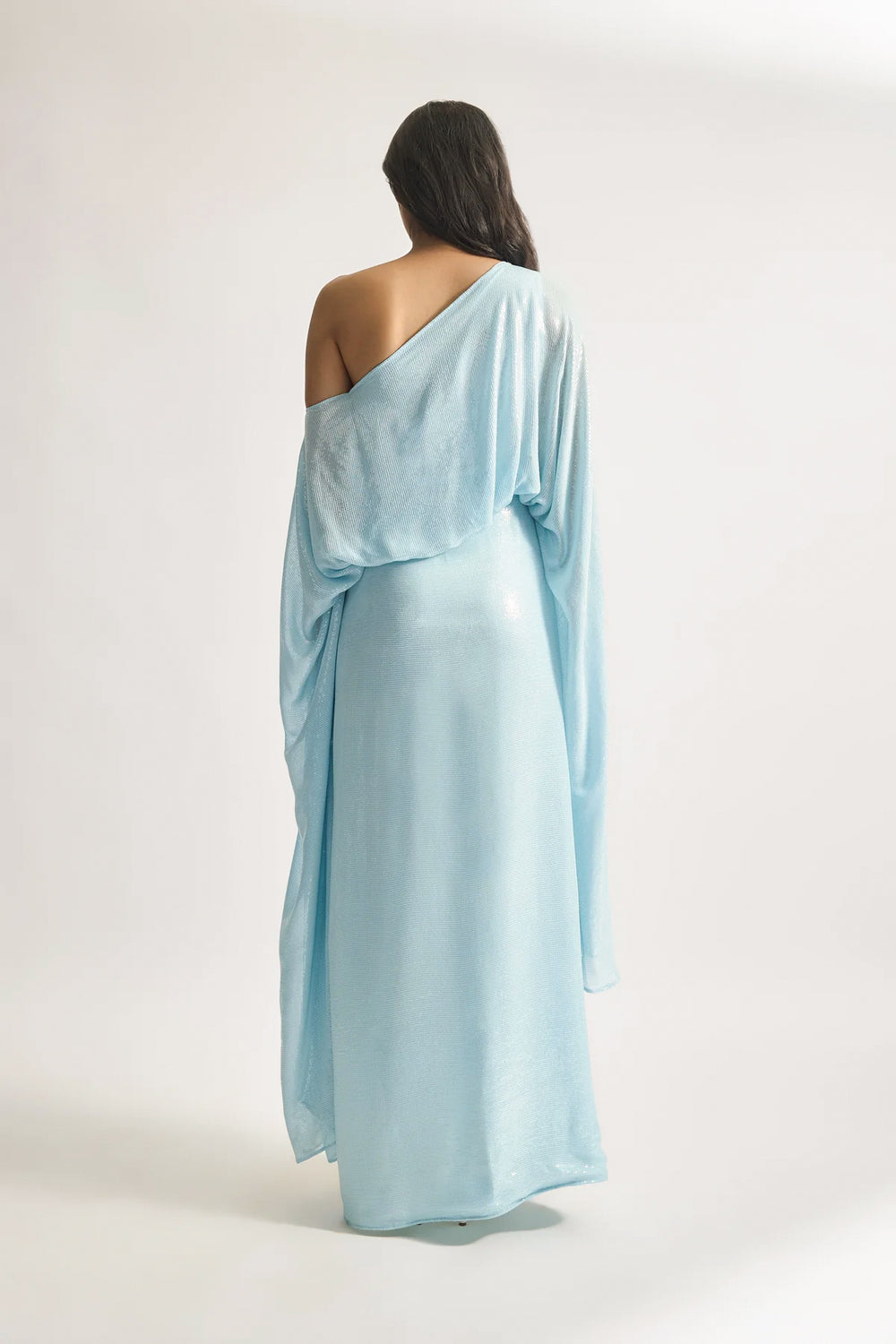 A one-shoulder sequin gown designed to captivate, with its shimmering fabric catching the light at every angle. The gown boasts silhouette that accentuates curves, complemented by a daring high slit that adds a touch of movement. Light draping enhances the gown's elegance, creating a fluid and graceful look that exudes confidence and sophistication. Perfect for glamorous evenings or formal events, this gown ensures to make you look beautiful with its blend of sparkle and refined style.