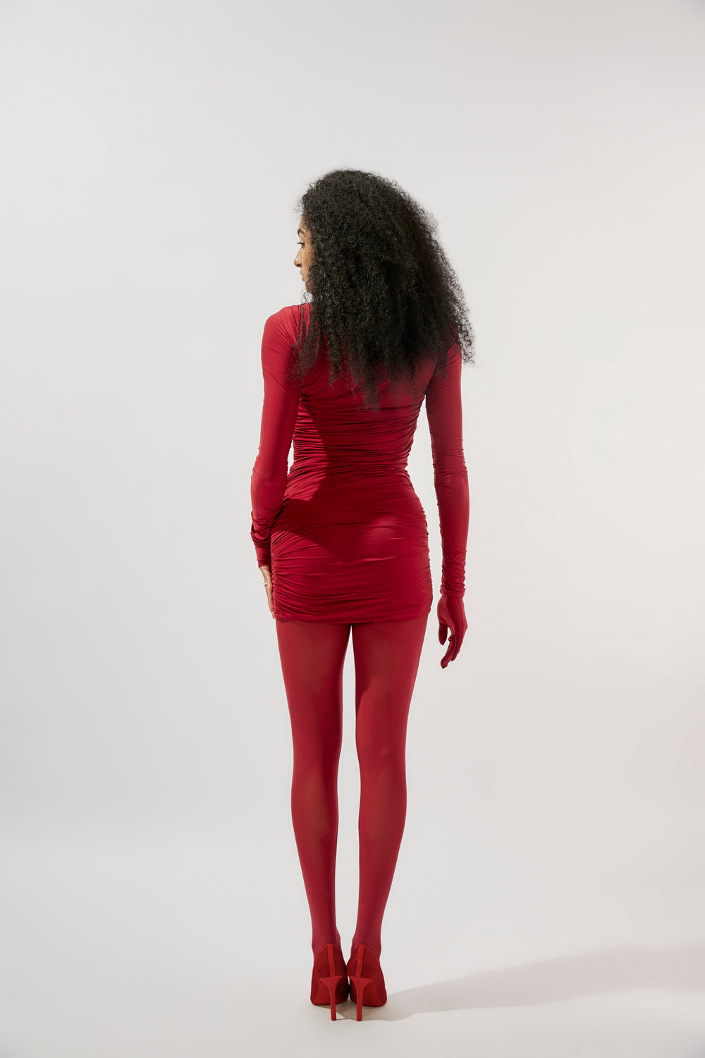 Exuding femininity in every detail, this maroon fitted ruched short dress embraces the curves with elegance and grace. The asymmetric creases delicately draped over the body, creating a captivating texture that accentuates the feminine form. With its one-shoulder design and full sleeves adorned with glove detailing, the fit is completed with a pair of stockings in mesh.