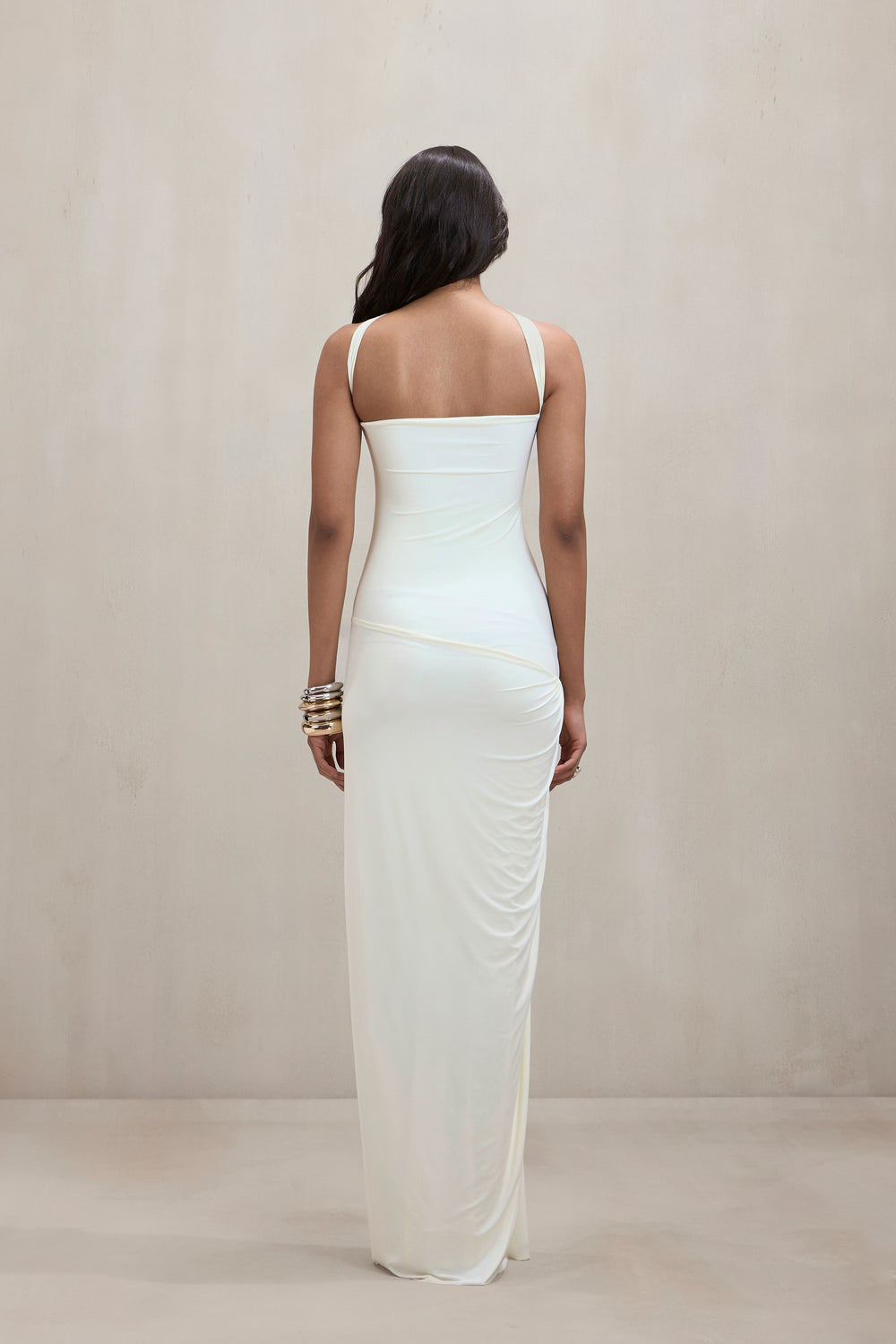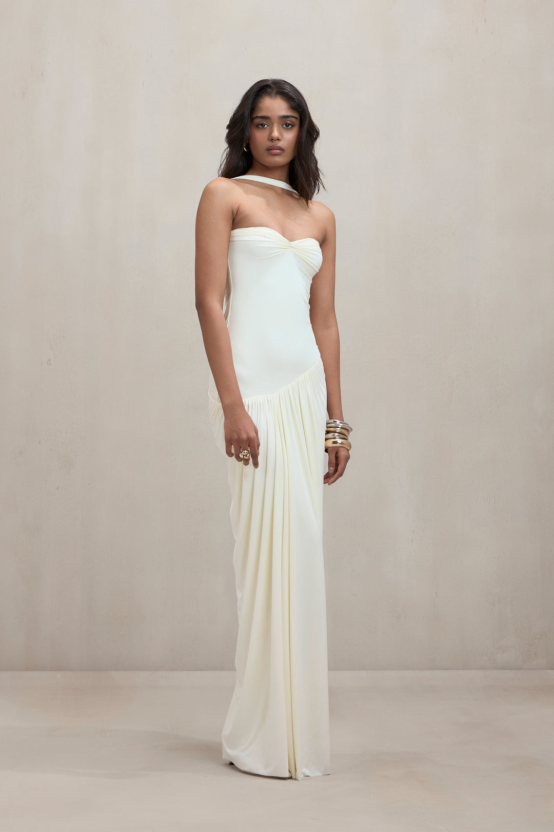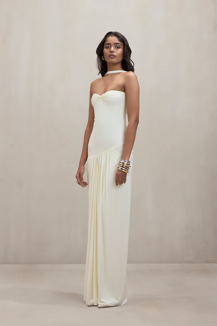 A study in modern minimalism, this ivory strapless gown combines clean lines with fluid draping. The structured bodice is softened by gentle pleating at the hip, creating a sculptural yet graceful silhouette. Accented with a delicate choker neckline, the design exudes quiet luxury perfect for contemporary bridal moments, elegant soirées, or red-carpet glamour.
