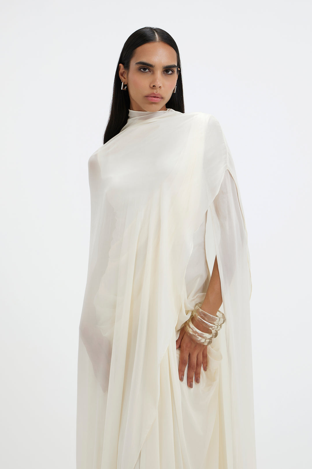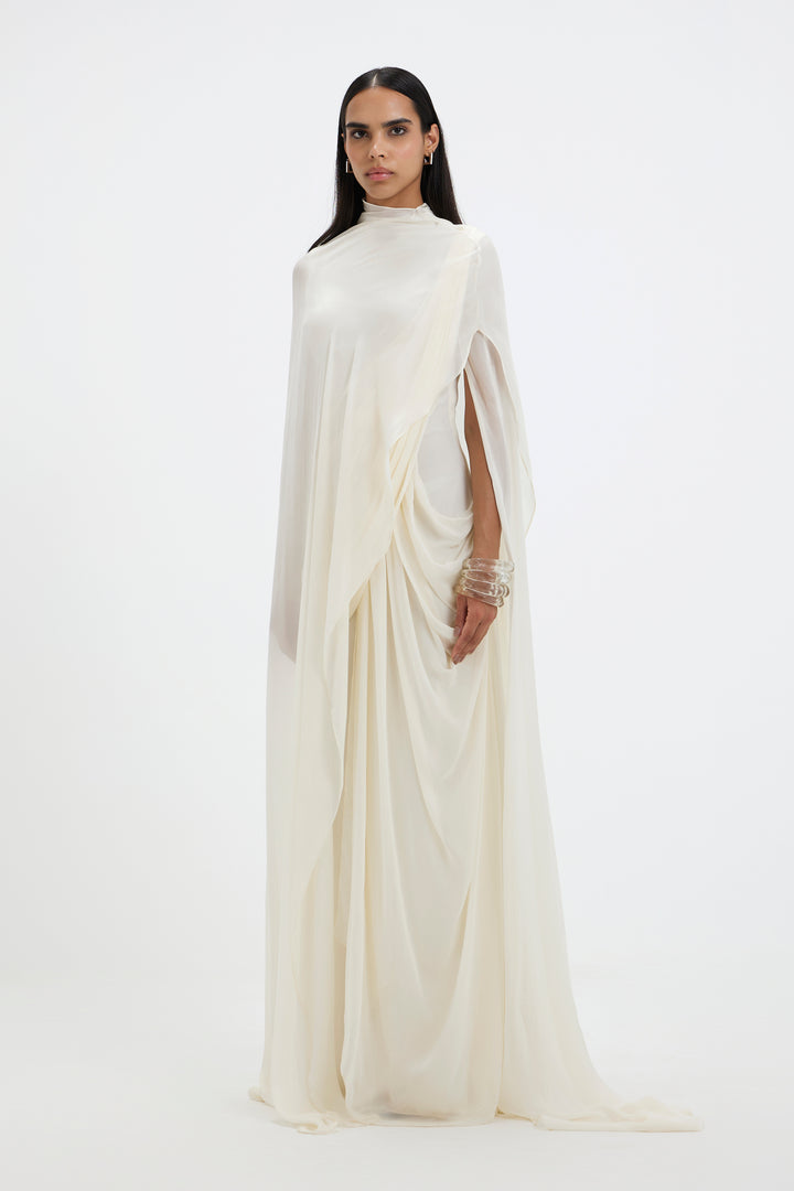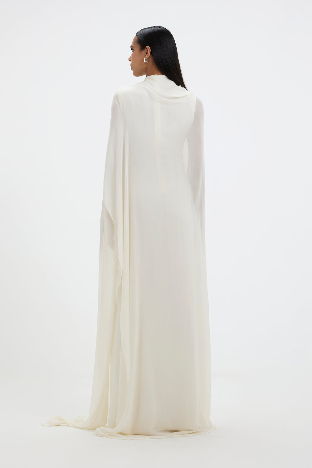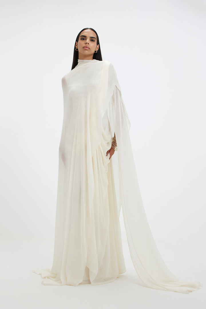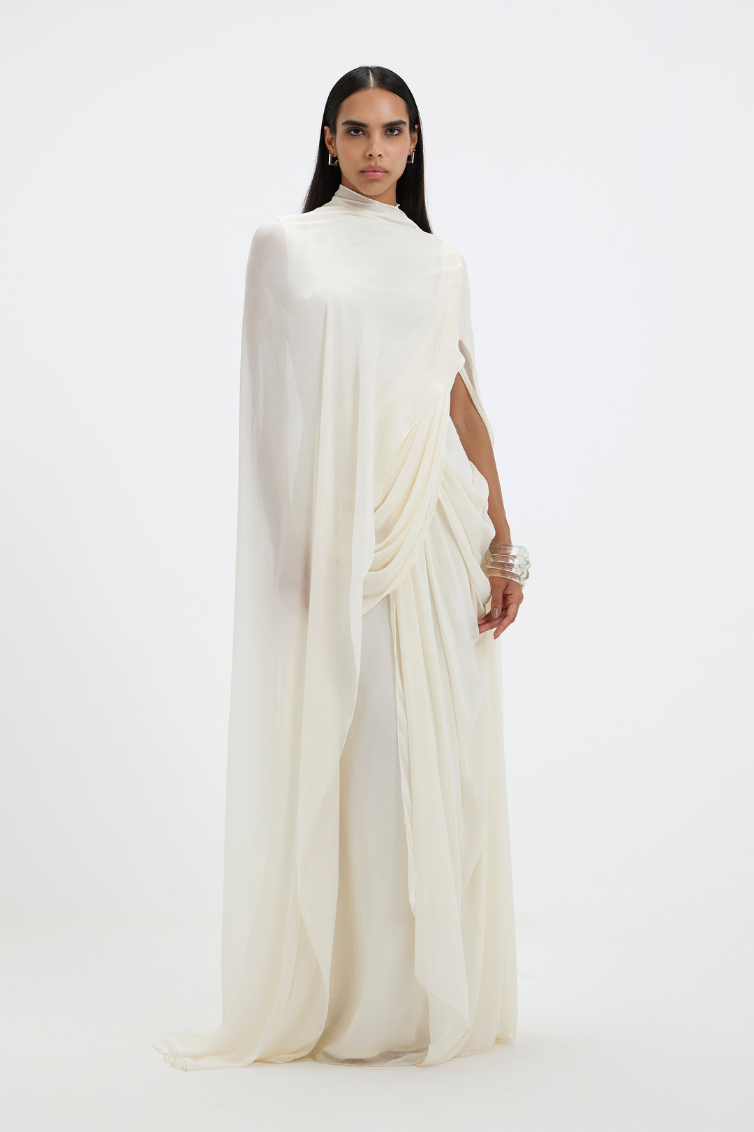 Ethereal in white, this A-line chiffon gown flows with delicate pleats that catch the light in motion. Softly structured yet fluid, its silhouette flatters with graceful ease. A sheer cape falls from one shoulder, draping over the right arm like a whisper — adding a layer of quiet drama to this dreamlike piece. Made to move, made to mesmerize.