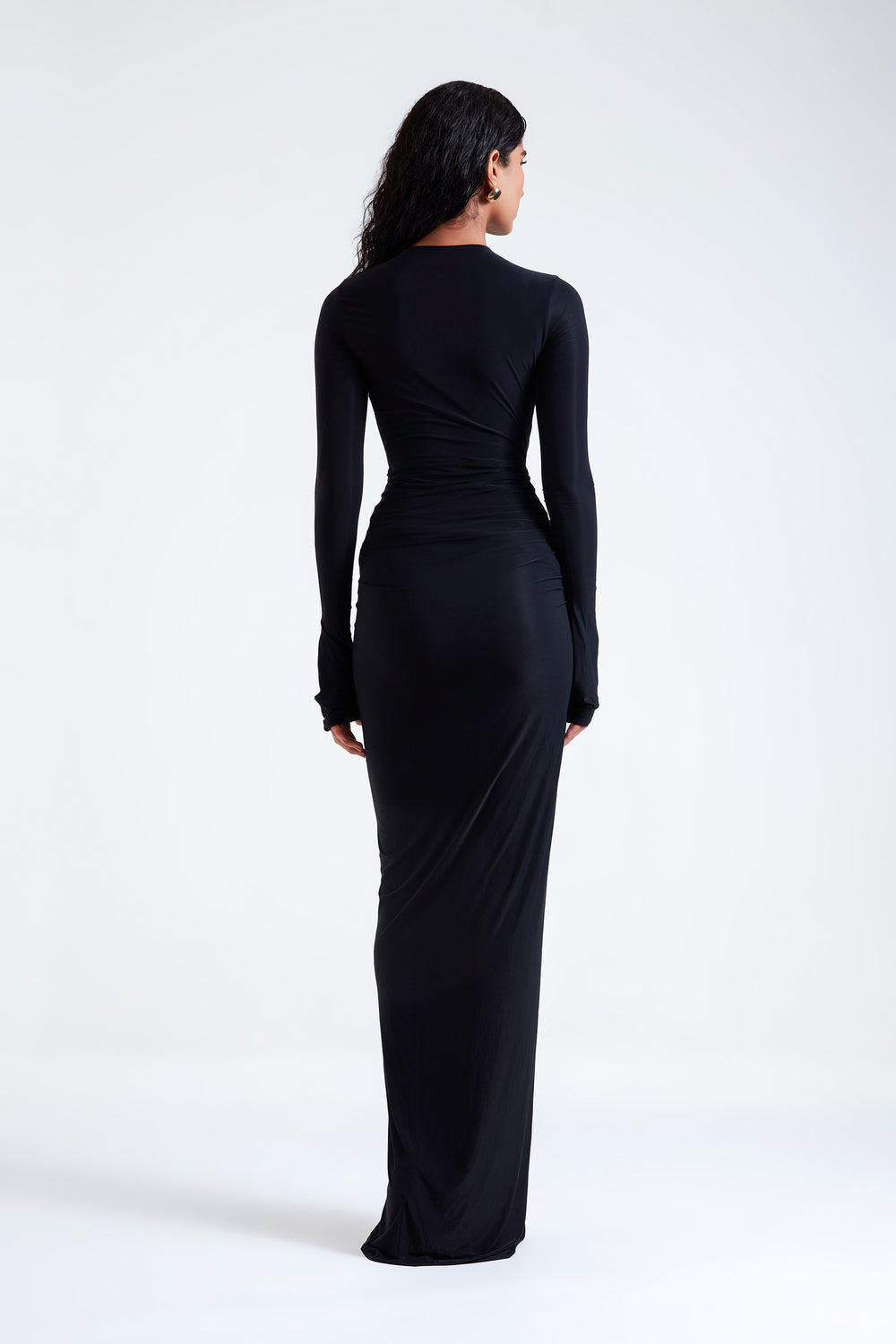 This sophisticated black malai lycra gown features a plunging neckline that adds a daring yet refined touch, while the very high slit creates a dramatic effect, showcasing the legs. The sleek malai lycra fabric drapes beautifully, accentuating the body's natural curves and offering a comfortable fit. The golden brooch detailing at key points enhances the gown’s luxurious appeal. Ideal for an upscale event, this gown perfectly balances sensuality and elegance, ensuring a stunning entrance and a memorable impression.