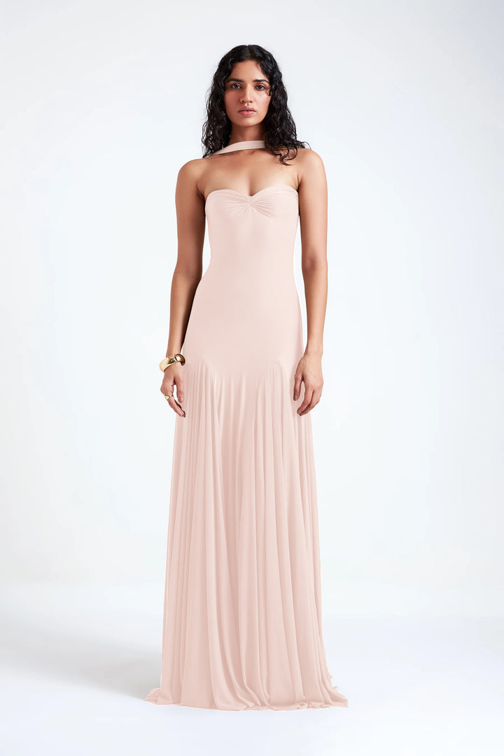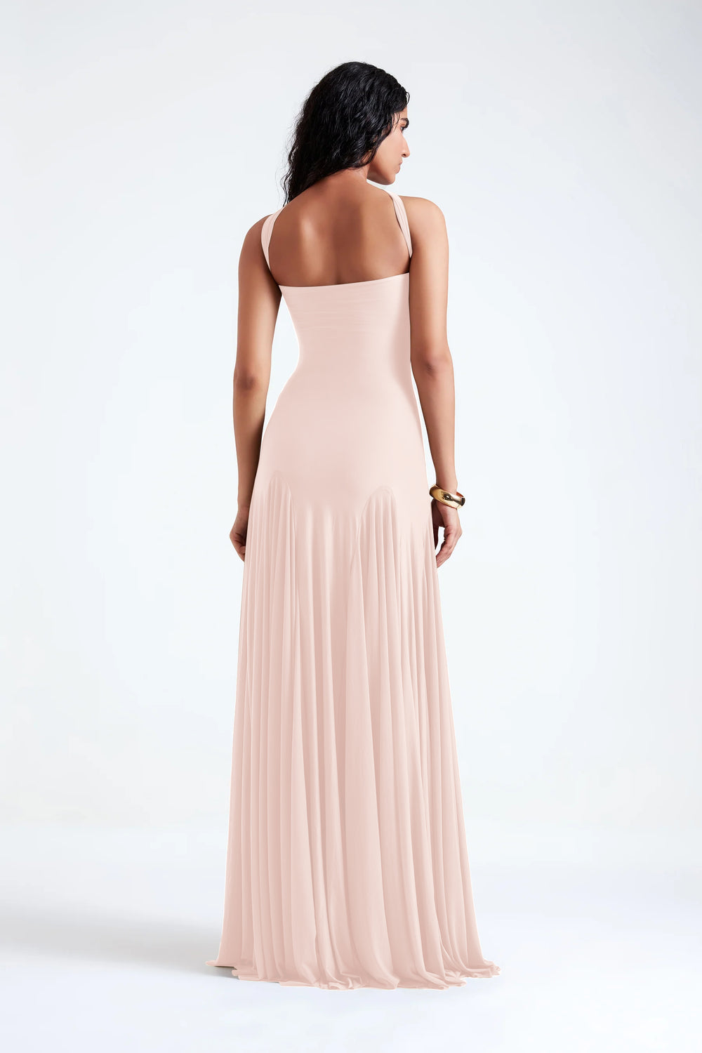 This elegant strapless gown seamlessly combines sophistication and drama with its thoughtfully designed details. The gown features a strapless bodice that offers a sleek, seamless look while highlighting the décolletage. The bust is adorned with intricate ruching, flowing from the waist, the gown incorporates high godets that create a beautifully flared silhouette, allowing for graceful movement. The high godets enhance the gown’s dynamic flow, making it ideal for formal events where you want to make a striking impression.