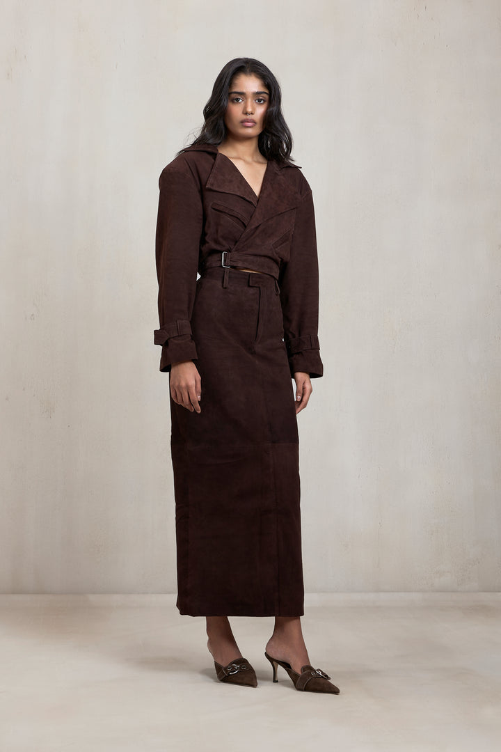 Sophisticated and structured, this co-ord set is crafted from rich chocolate-hued suede that feels as luxurious as it looks. The tailored jacket features an exaggerated lapel collar, belted waist, and utility-inspired detailing on the sleeves for a sharp, confident edge. Paired with a sleek, high-waisted pencil skirt that falls gracefully to the ankle, the set creates a streamlined silhouette that balances strength with elegance. Perfect for evenings out or power-dressing moments, this suede ensemble is a modern wardrobe staple designed to make an impression.