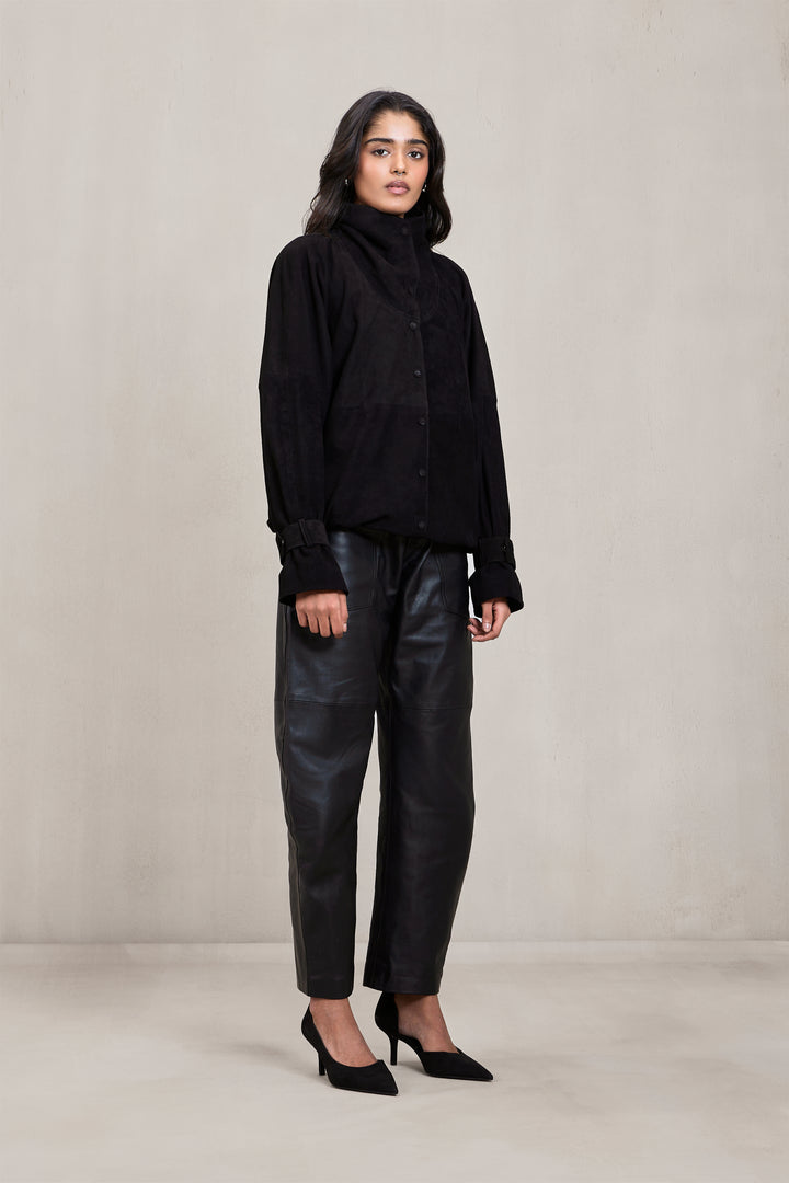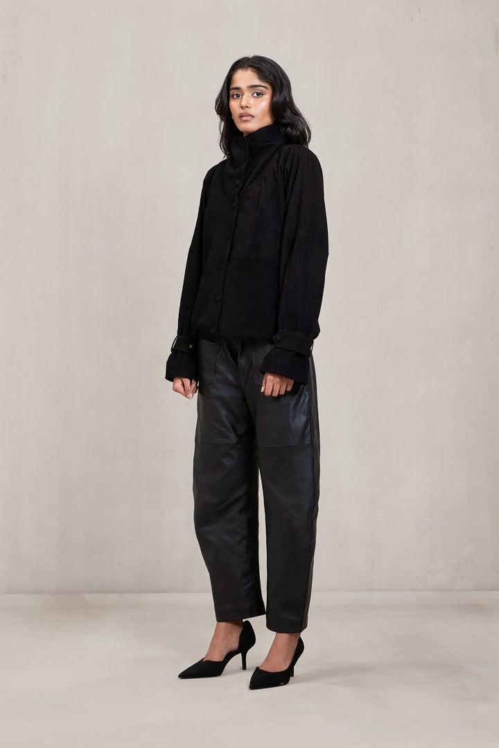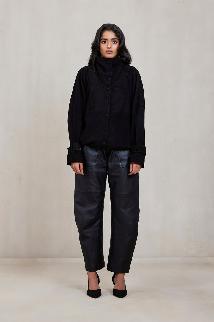 Crafted in soft black suede and supple leather, this co-ord set strikes the perfect balance between structure and ease. The oversized funnel-neck jacket brings a modern edge to a timeless silhouette, while the sculptural barrel pants redefine contemporary tailoring with their voluminous, tapered shape. Together, they create a look that’s both effortlessly powerful and undeniably refined — a statement in texture, form, and confidence.