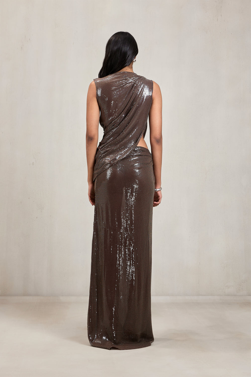 Turn heads in this striking chocolate brown sequin top and pants designed to dazzle after dark. Crafted with a sculpted drape that flatters the figure, features assymetrical hem top for a daring yet sophisticated touch. The silhouette shimmers with every movement, making it ideal for glamorous occasions, galas, or red-carpet moments. A bold, confident choice for the modern woman.