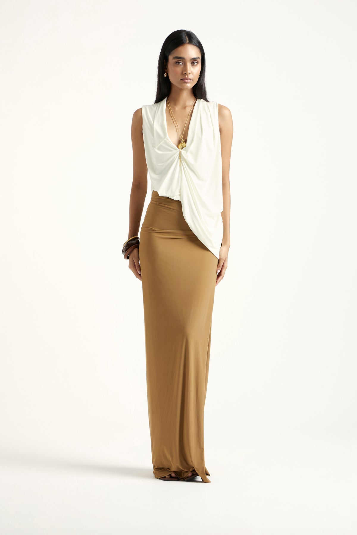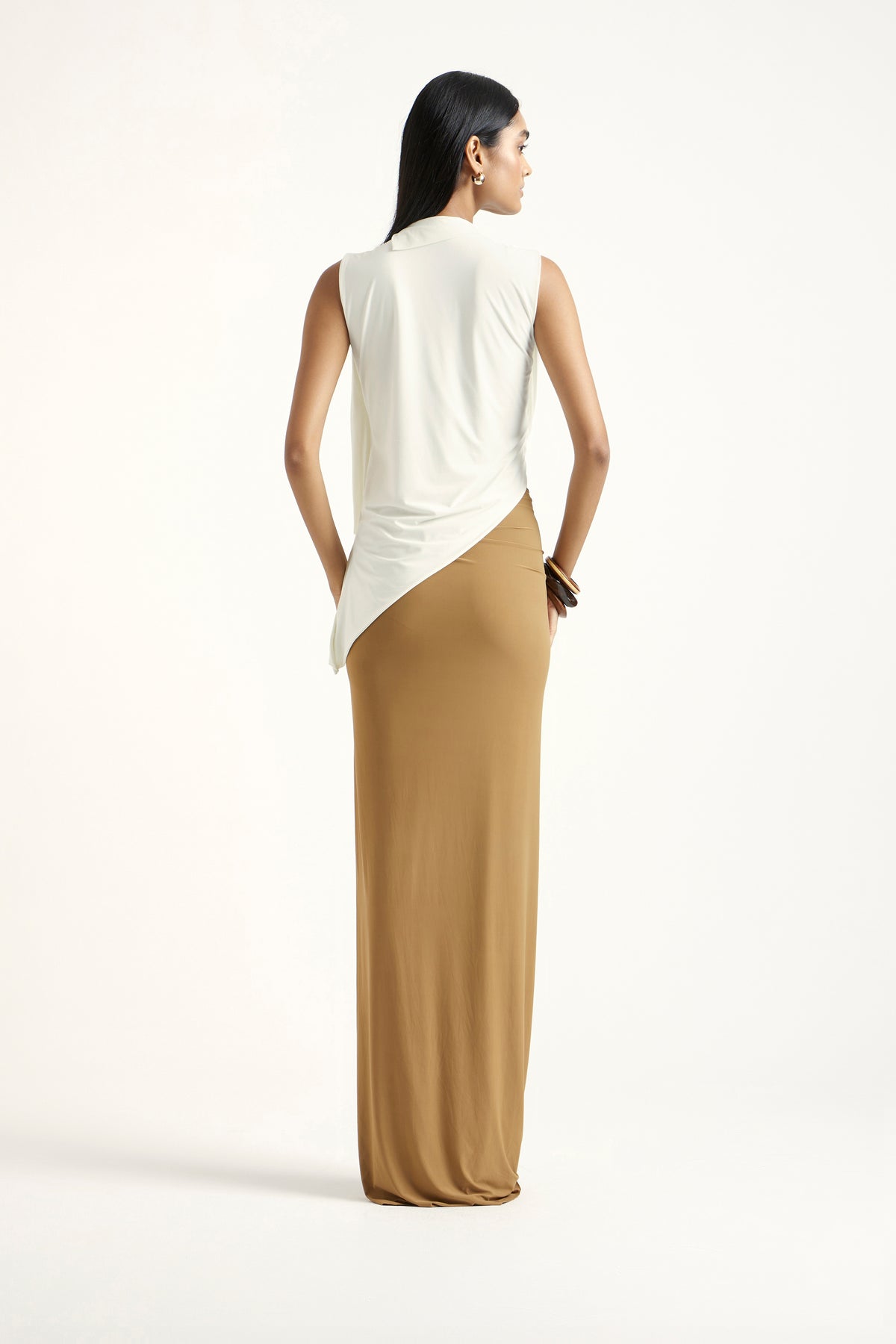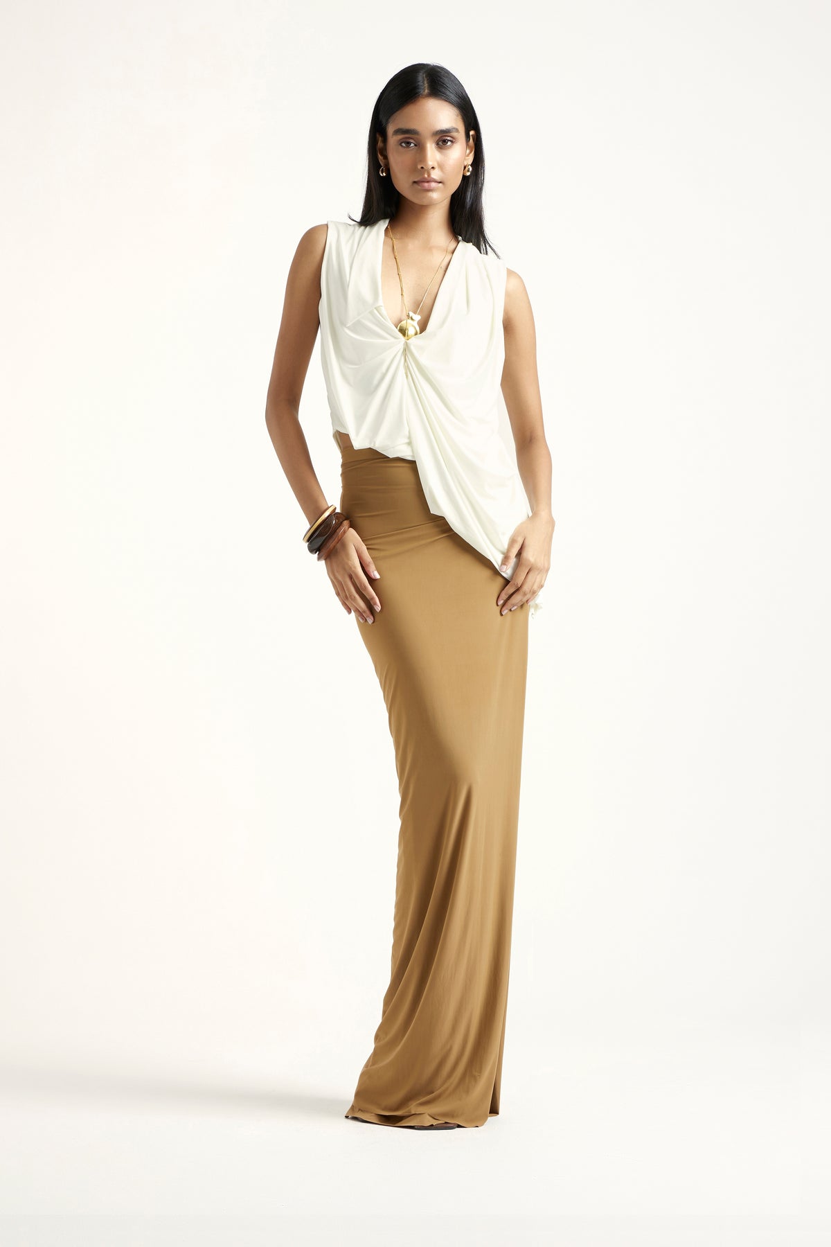 Designed in off-white and dark beige malai, the Zoey coord set is a study in tonal harmony and soft elegance. The top features clean, contemporary lines, while the skirt offers fluid movement with a flattering fall. When worn together, they form a balanced, refined silhouette suitable for warm-weather gatherings or minimal chic dressing.