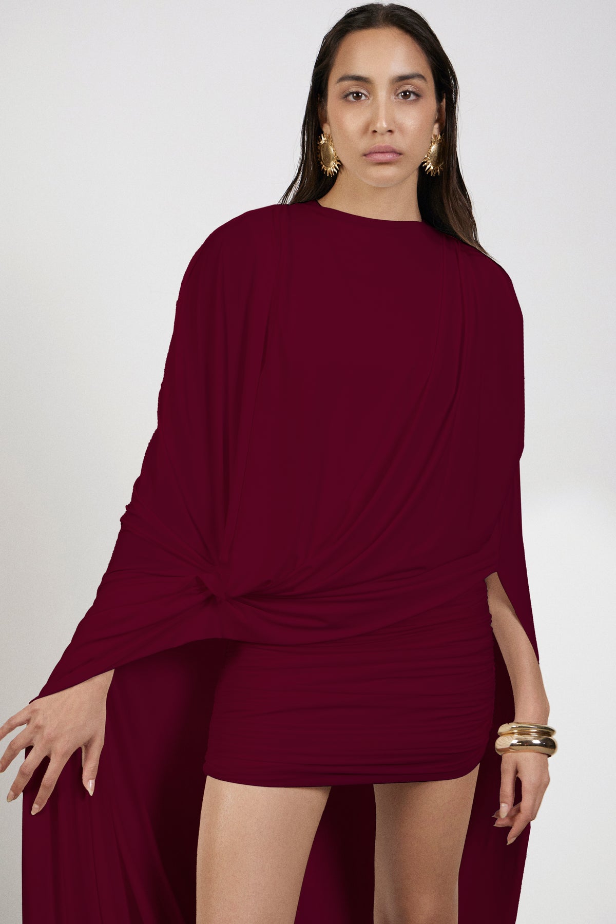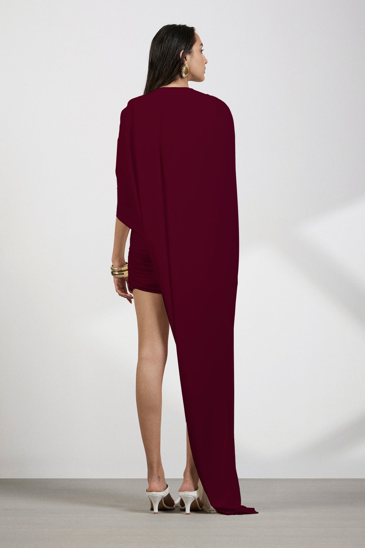 Exude ethereal charm in this white short dress, crafted from a blend of net and malai fabric for a soft, sculpted fit. Fully ruched for a flattering, textured silhouette, the dress features a dramatic long drape that cascades from the shoulders, elegantly covering the back. This striking contrast of structure and flow makes it a standout piece for cocktail parties, soirées, or modern bridal moments.