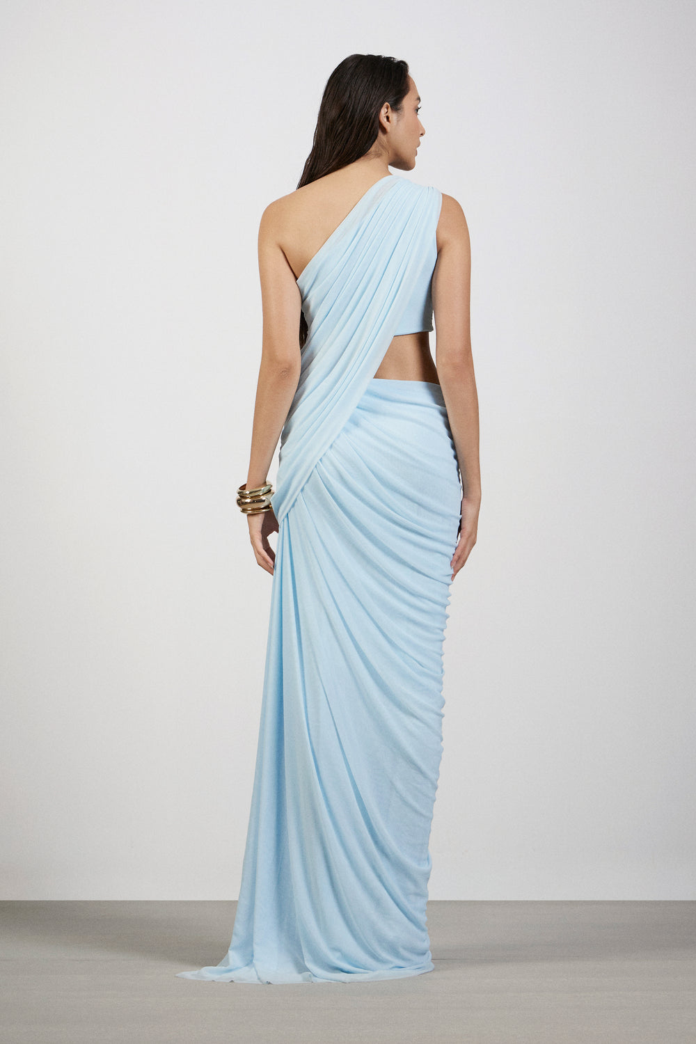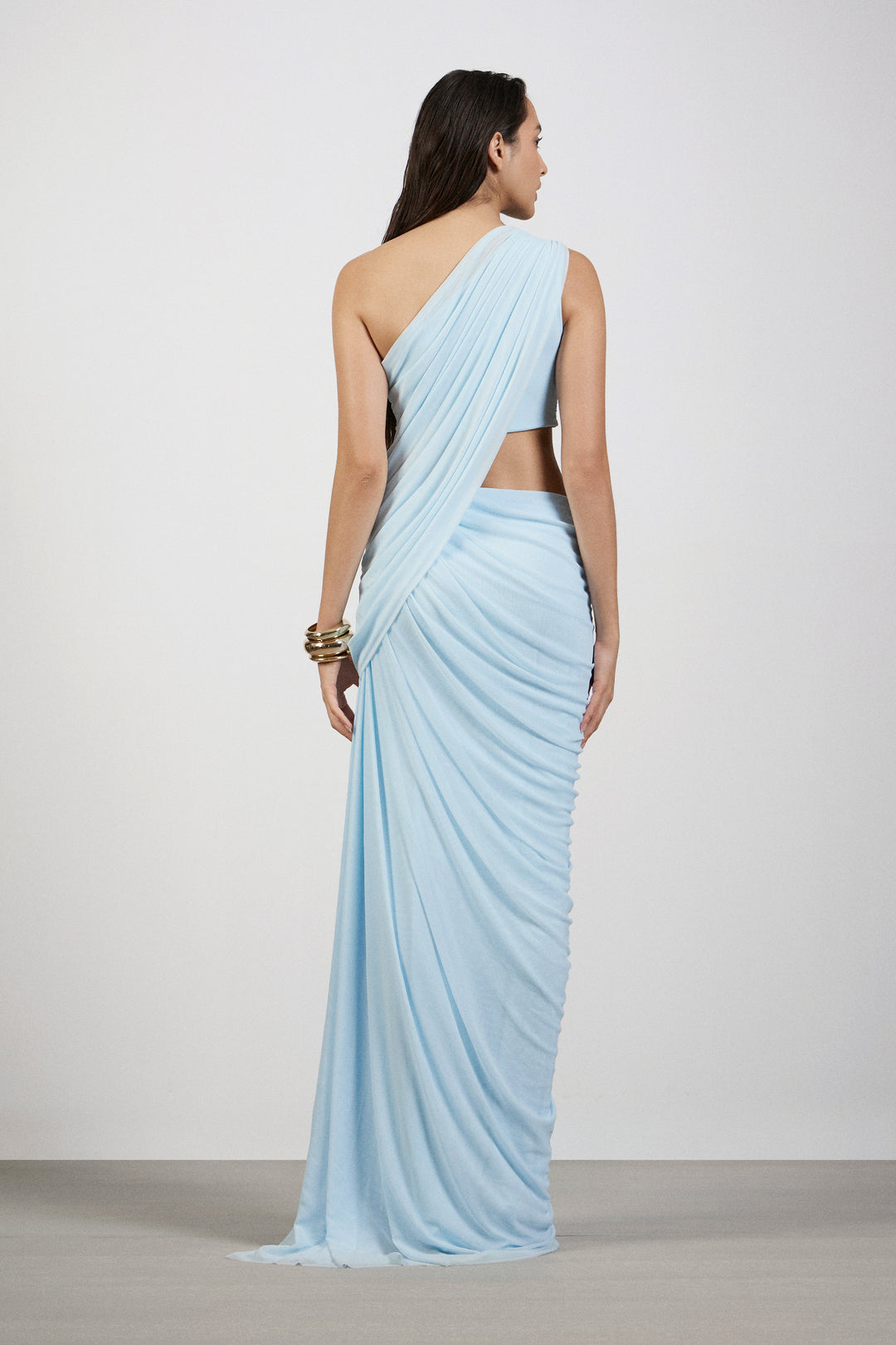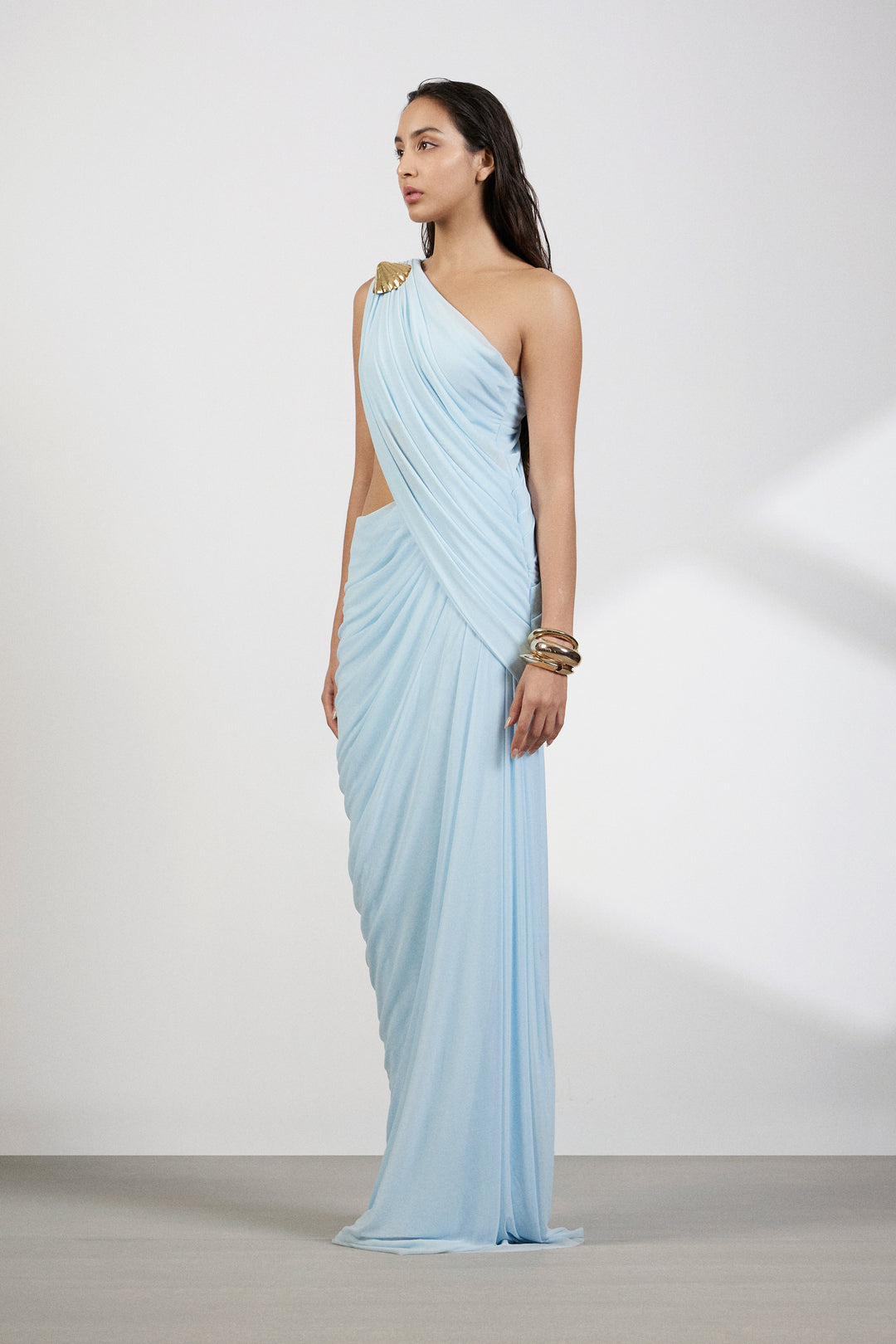 Sculptural and serene, this baby blue one-shoulder gown is a vision of pleated perfection. The top features delicate pleating that wraps and contours the body, while the draped skirt mirrors the fluidity with graceful folds. A statement gold shell brooch at the shoulder adds a touch of coastal glamour, tying the look together with quiet opulence. Designed to flow, flatter, and captivate—this gown is made for unforgettable entrances.