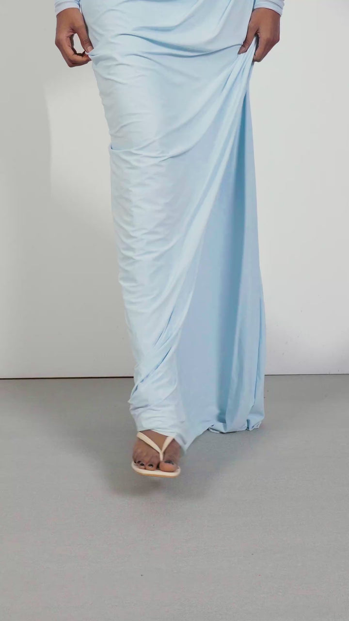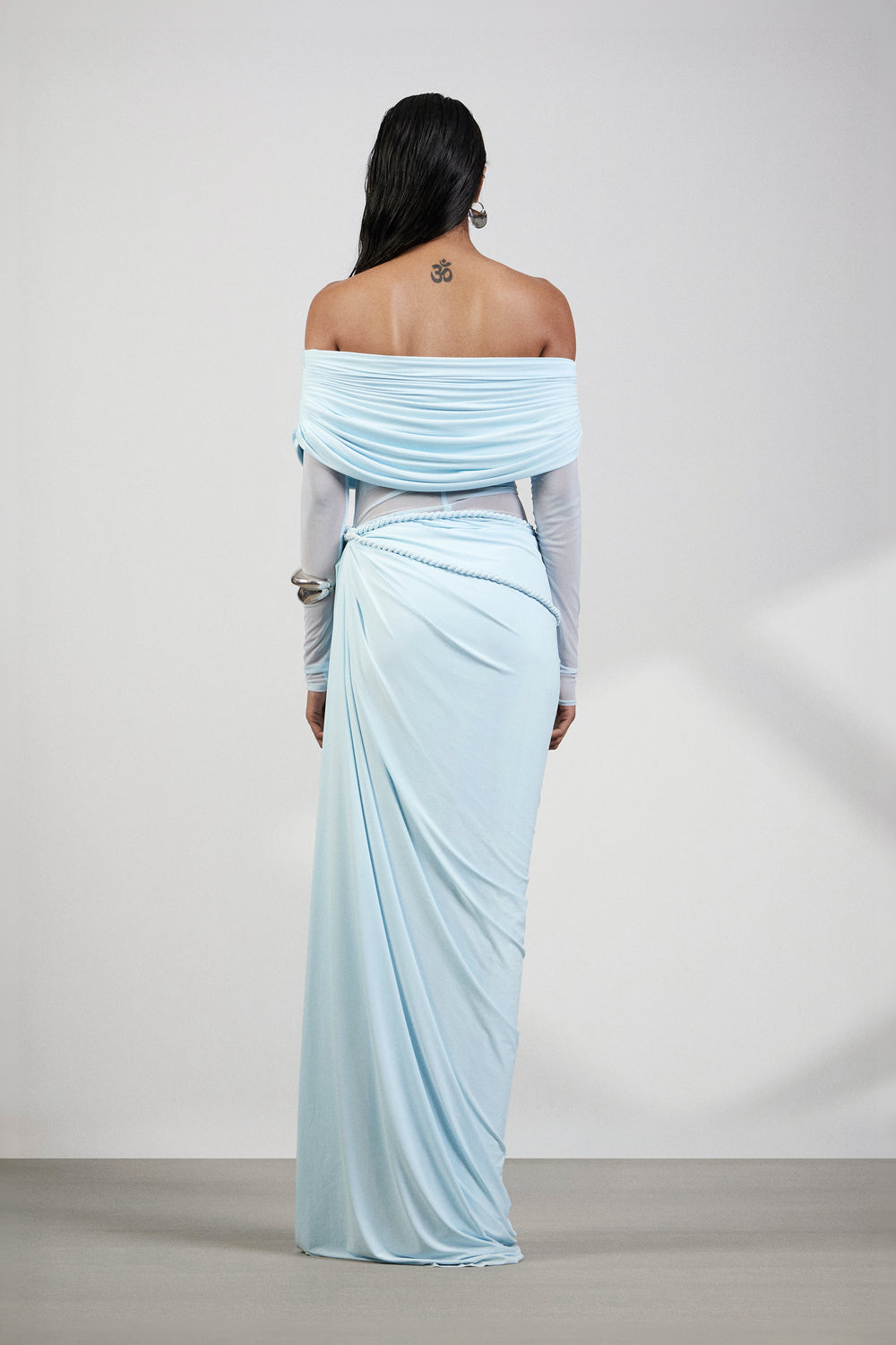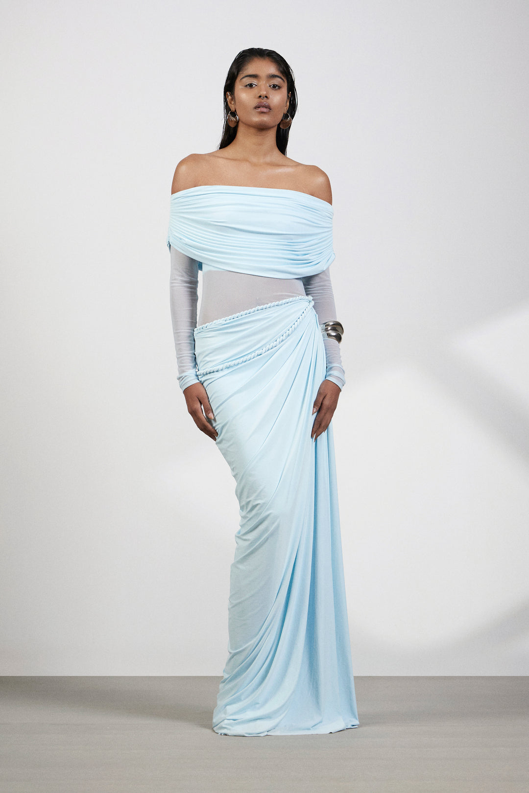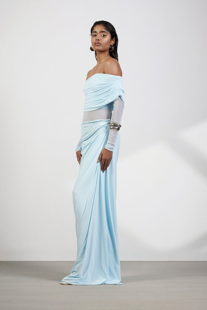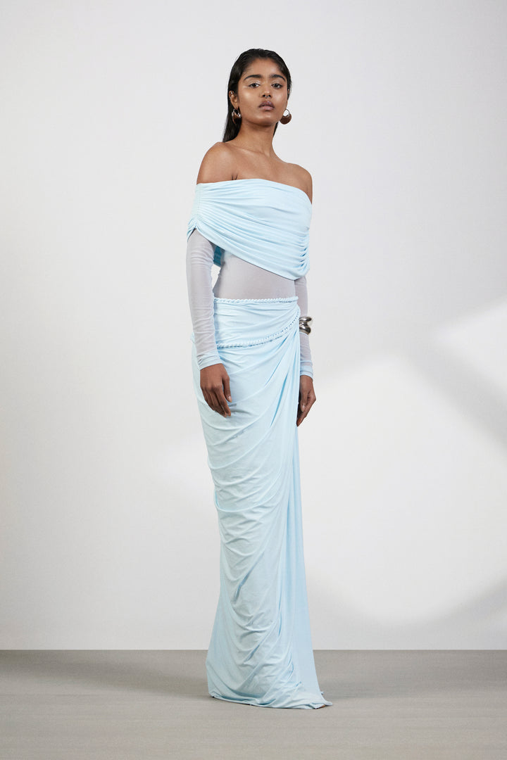 The design seamlessly blends an off shoulder top with a modern aesthetic, striking the perfect balance between classic and contemporary. The see-through waist introduces an element of subtle allure, allowing a tasteful glimpse of skin while maintaining sophistication. The pleated bottom artfully accentuates the waist, creating a flattering and dynamic silhouette. The draped detail adds a touch of sophistication.