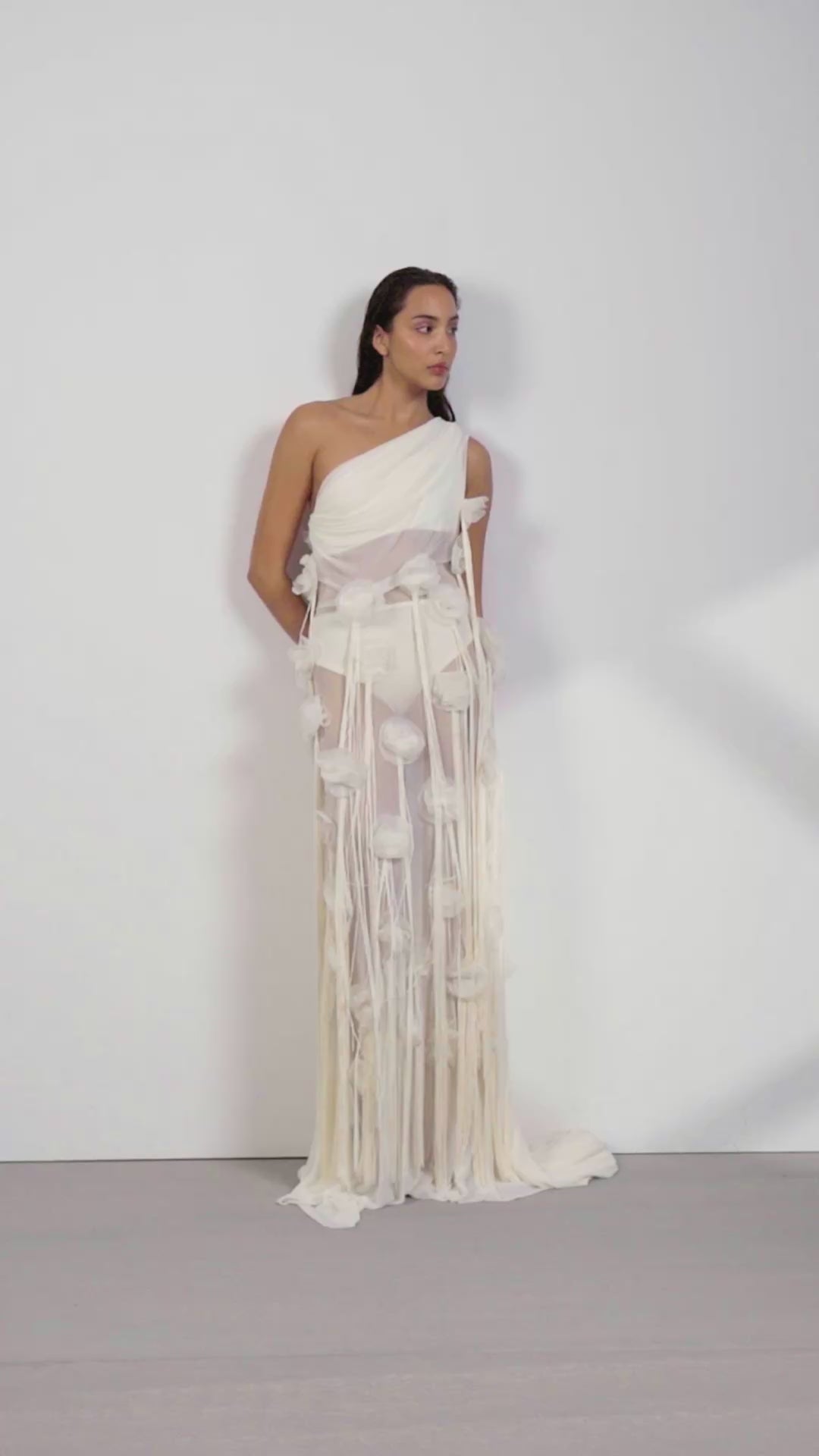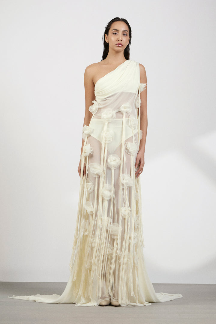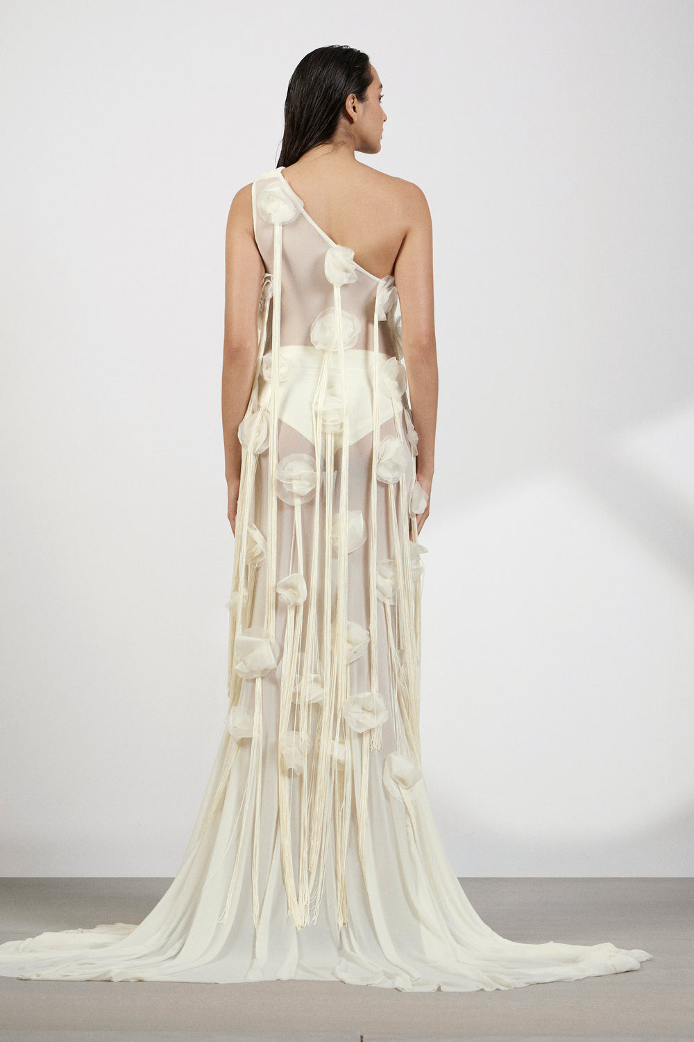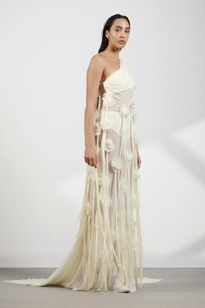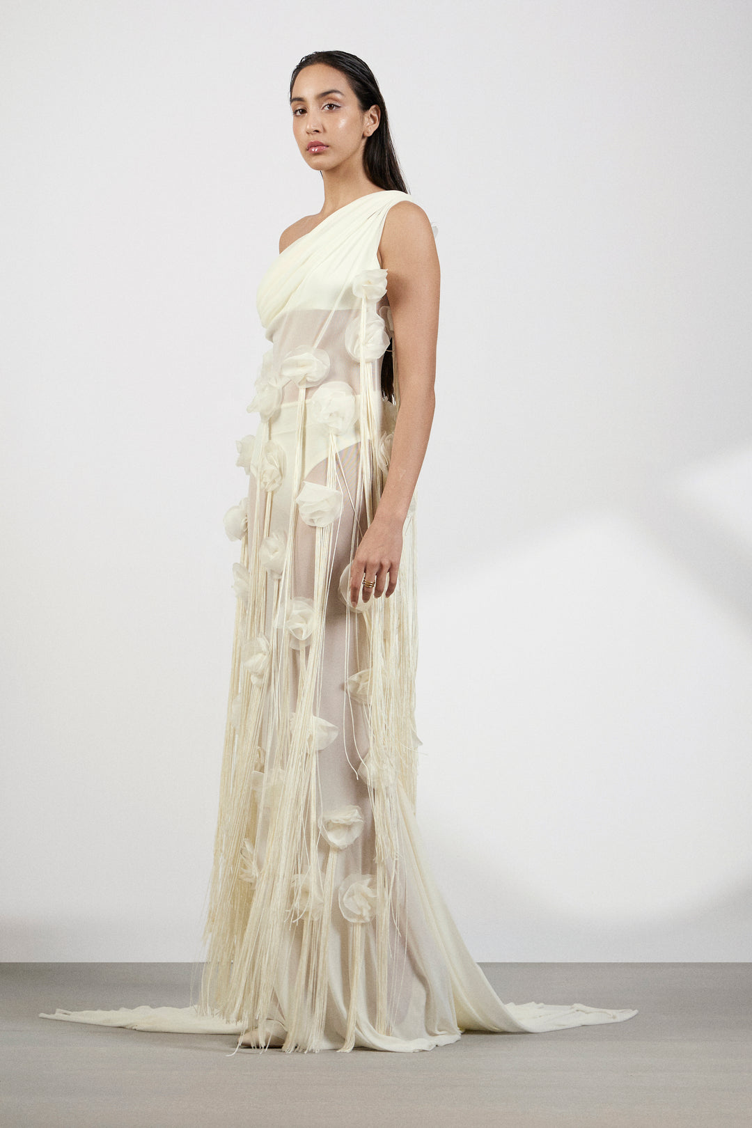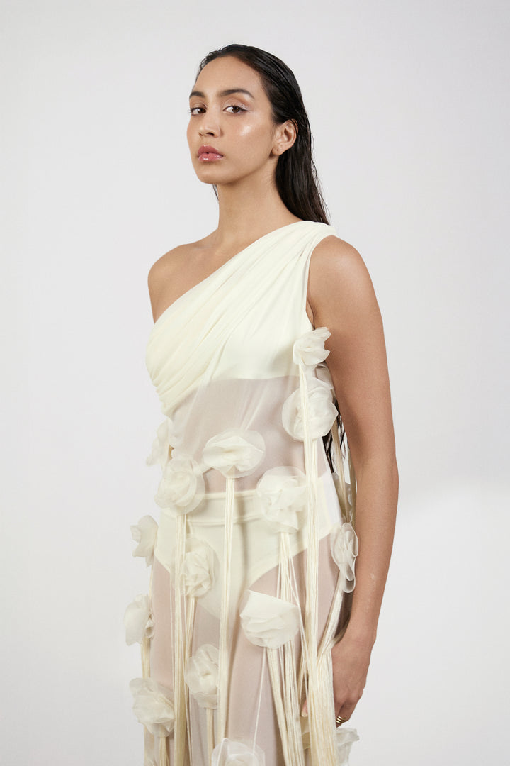 Turn heads in this elegant one-shoulder dress crafted from delicate net fabric. Adorned with handmade organza floral details and playful tassels, it effortlessly blends romance with modern flair. The asymmetrical neckline adds a touch of drama, making it perfect for evening soirées or festive occasions.