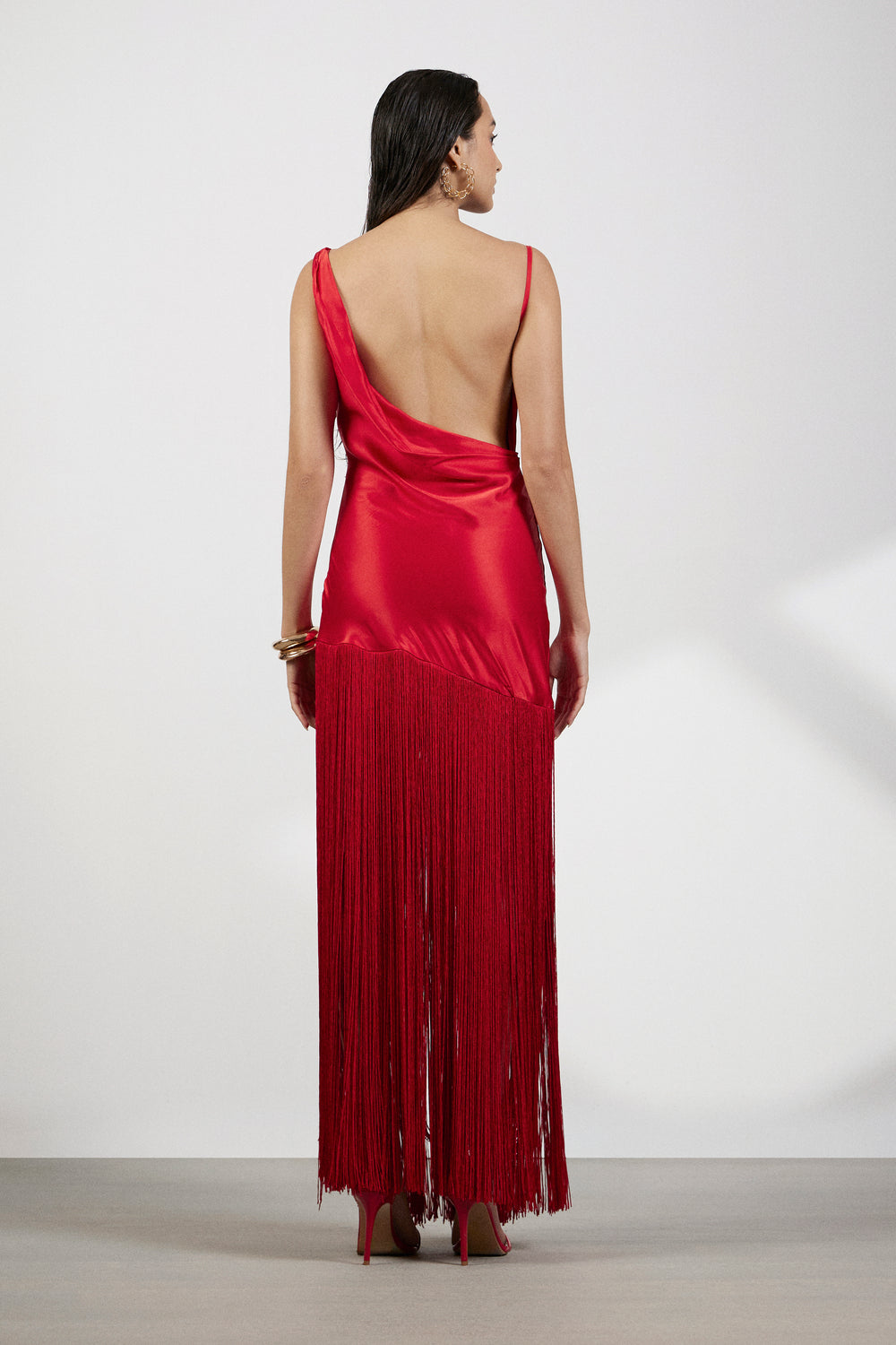 Command attention in this bold red strappy bodycon dress, crafted from luxurious satin for a smooth, luminous finish. Featuring a sultry cowl neckline and a low open back, this design radiates modern elegance with a seductive twist. Delicate tassel accents and a twisted drape detail add a playful edge, making it the perfect statement piece for unforgettable nights out.