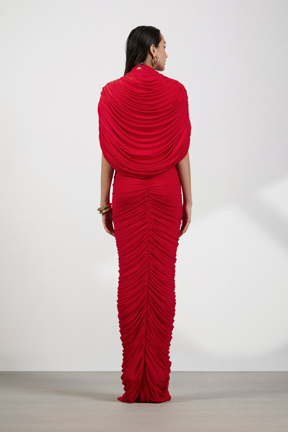 Make an unforgettable entrance in this striking red bodycon gown, crafted from soft malai lycra and net for a sleek and sculpted fit. The design features a fully pleated and draped shoulder cape that adds dramatic texture and elegance to the upper silhouette. The bottom of the gown continues the ruched detailing, enhancing every curve with its figure-hugging form. Combining bold structure with the intricate detailing, this gown is a true statement of confidence and sophistication for any special occasion.